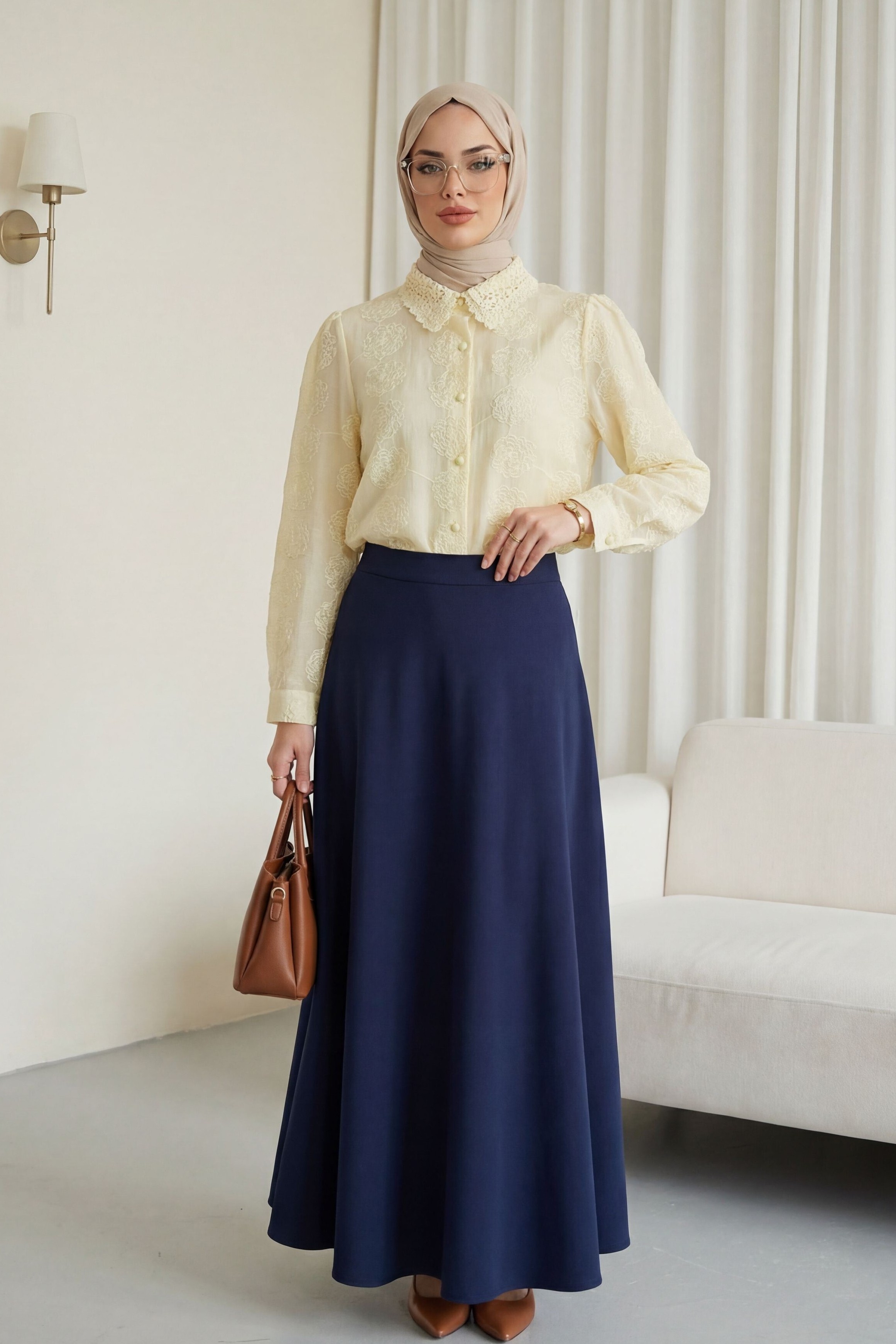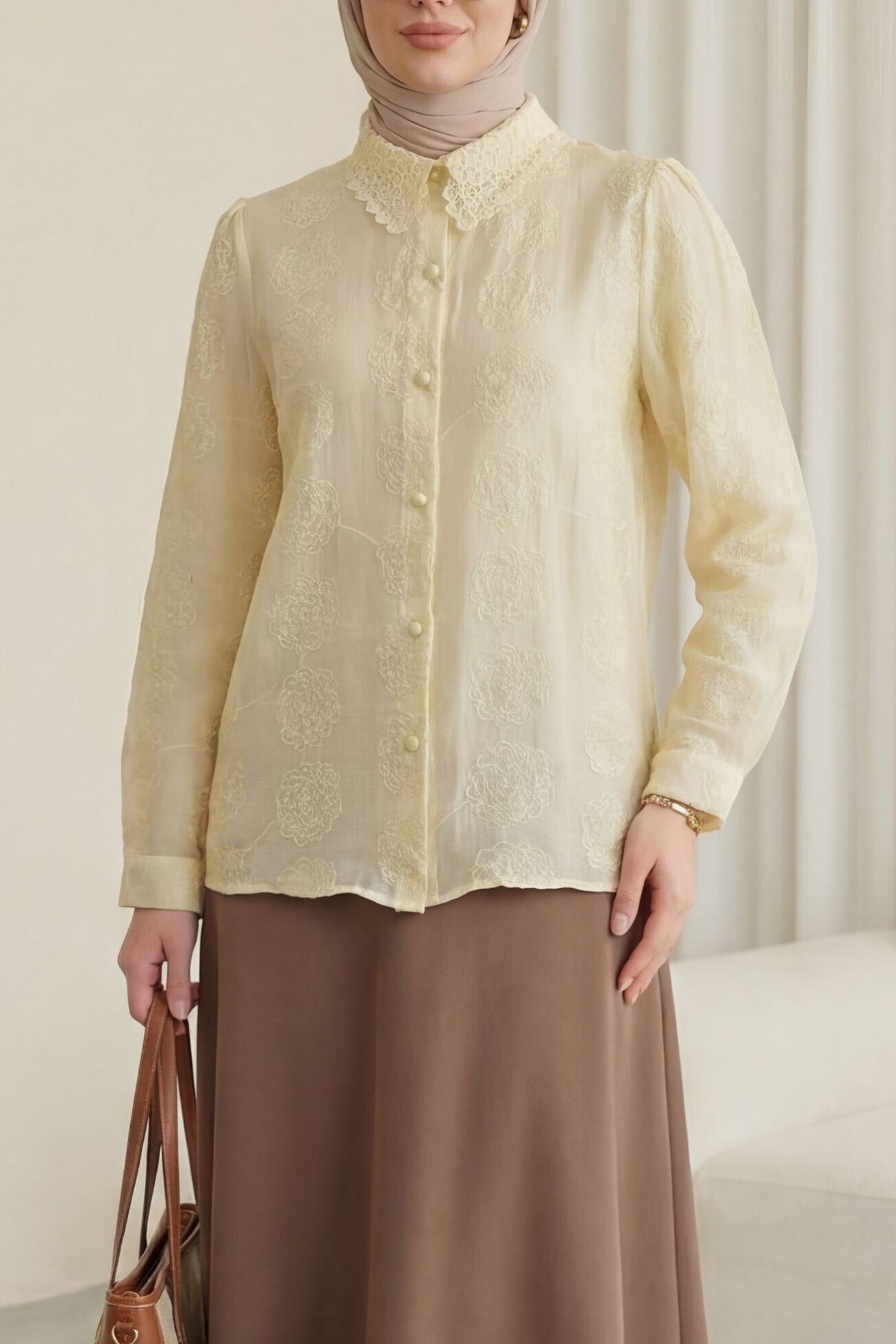 قميص جاكار منقوش مزين بالدانتيل، بأزرار أمامية -اللون البيج