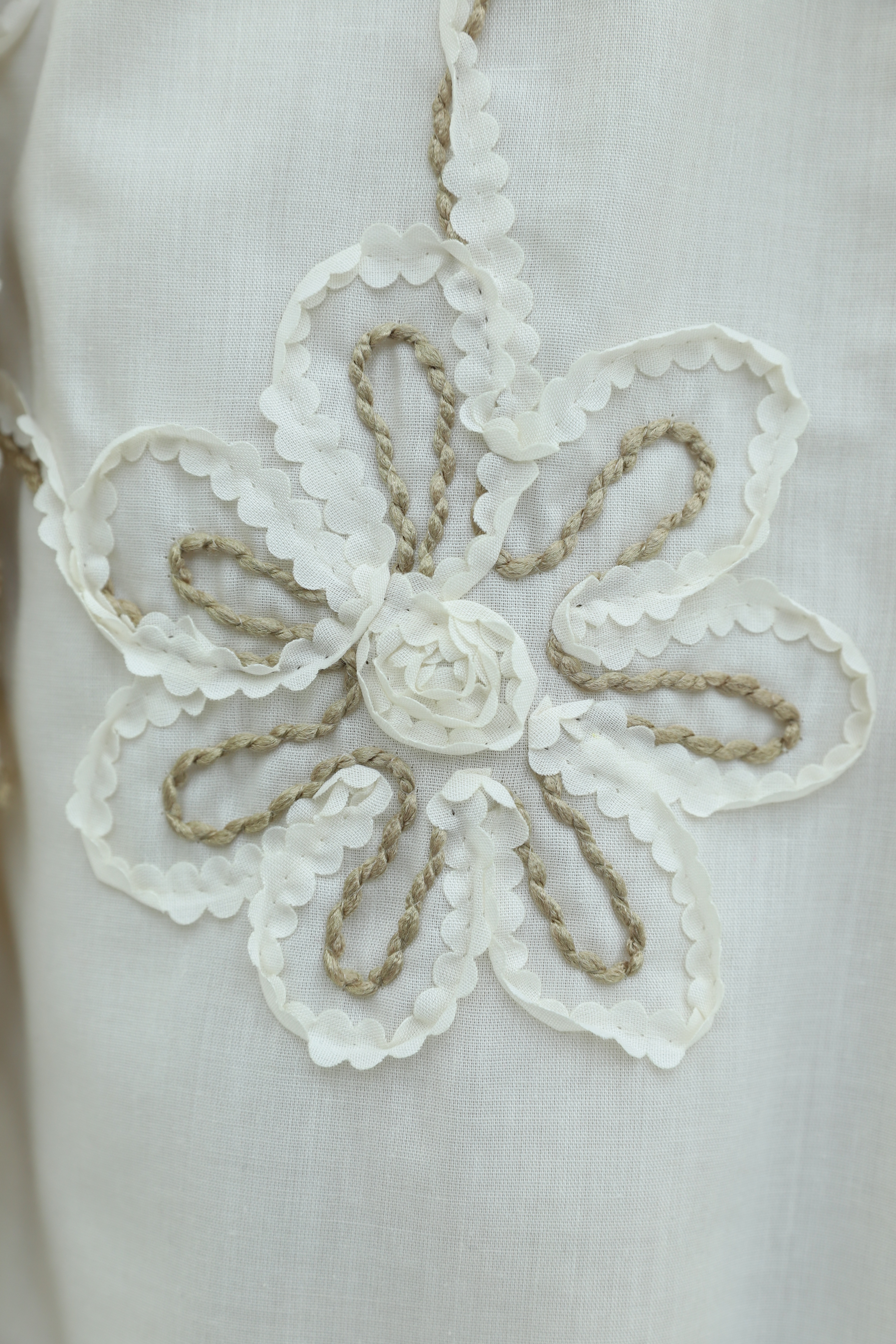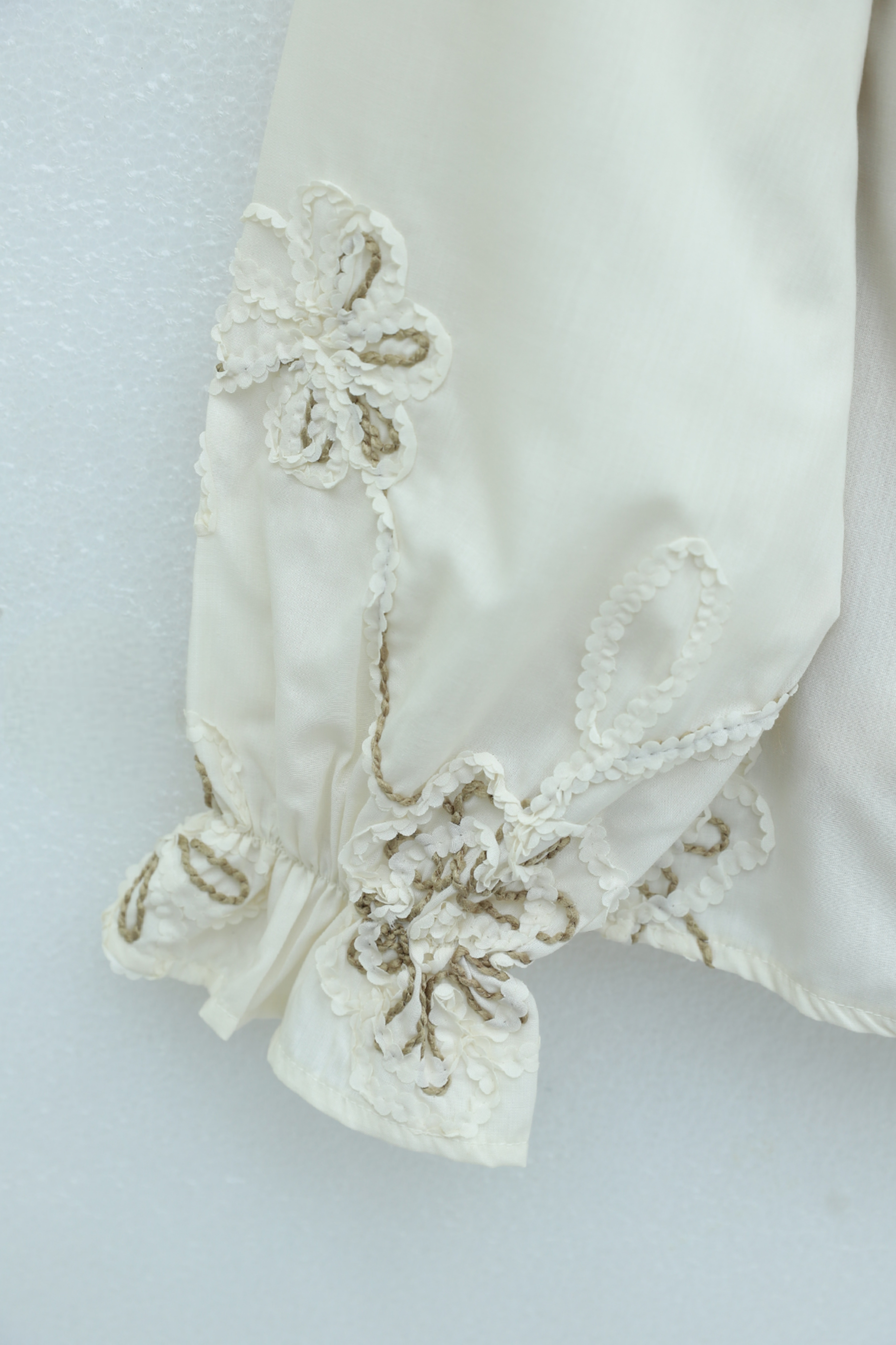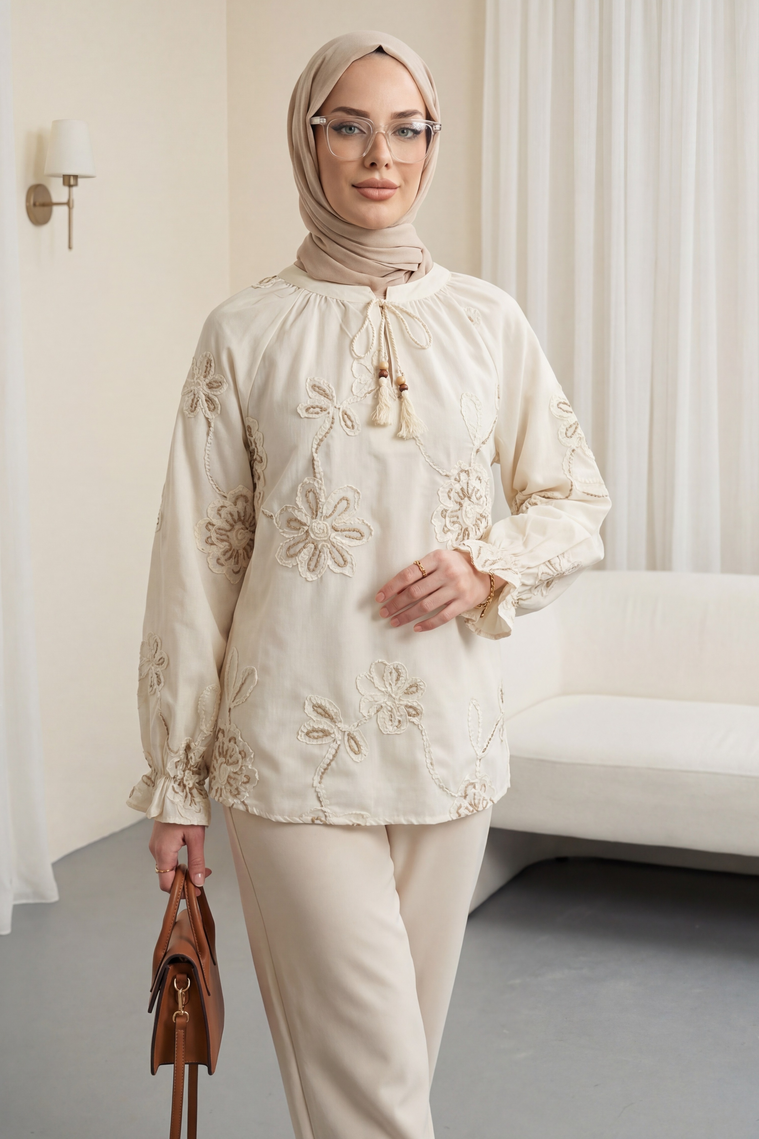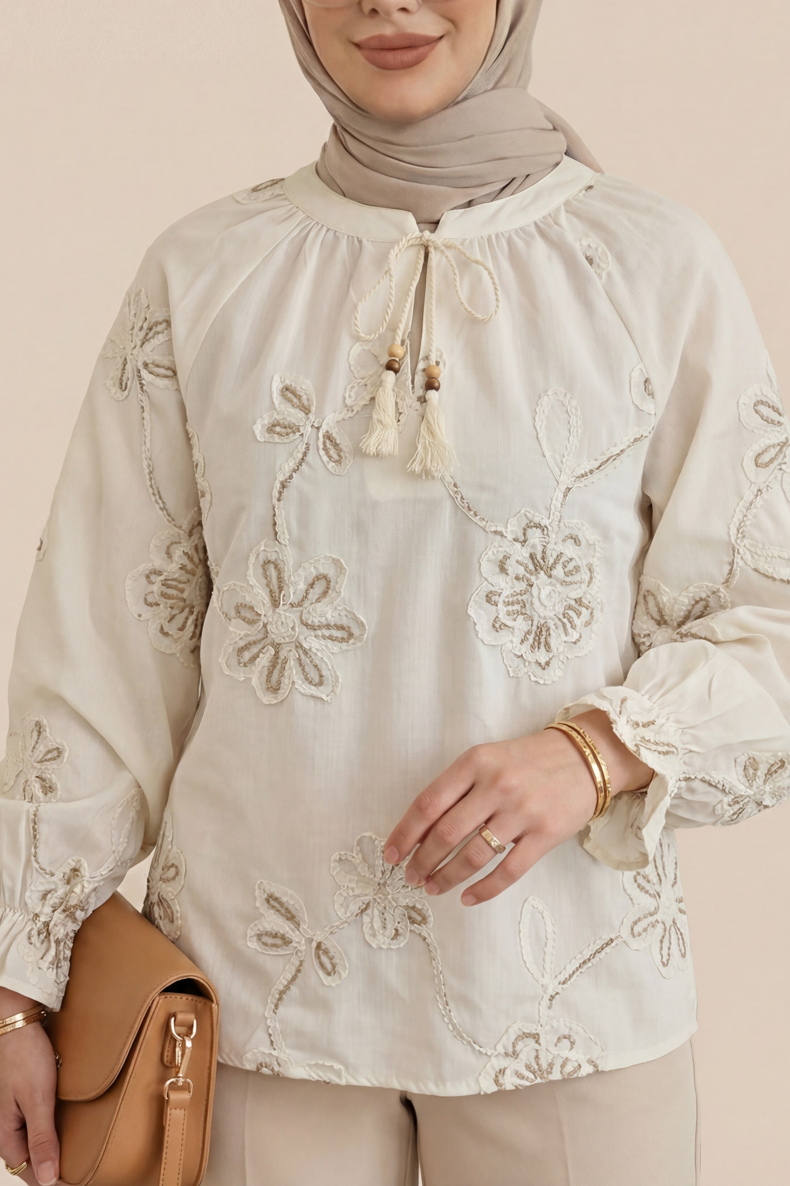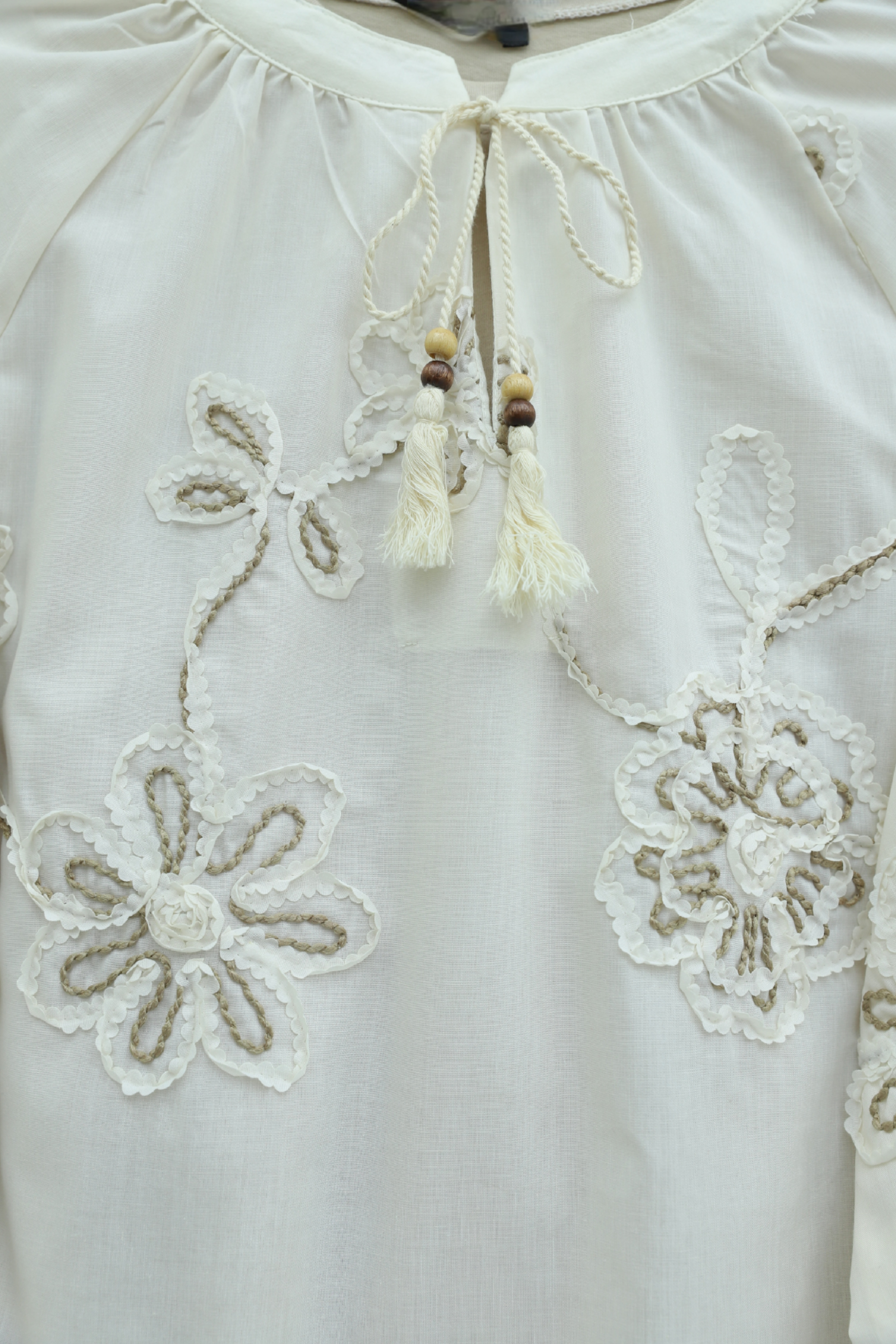 بلوزة بأكمام طويلة مزينة بشرابة وتطريز زهري. -لون كريمي