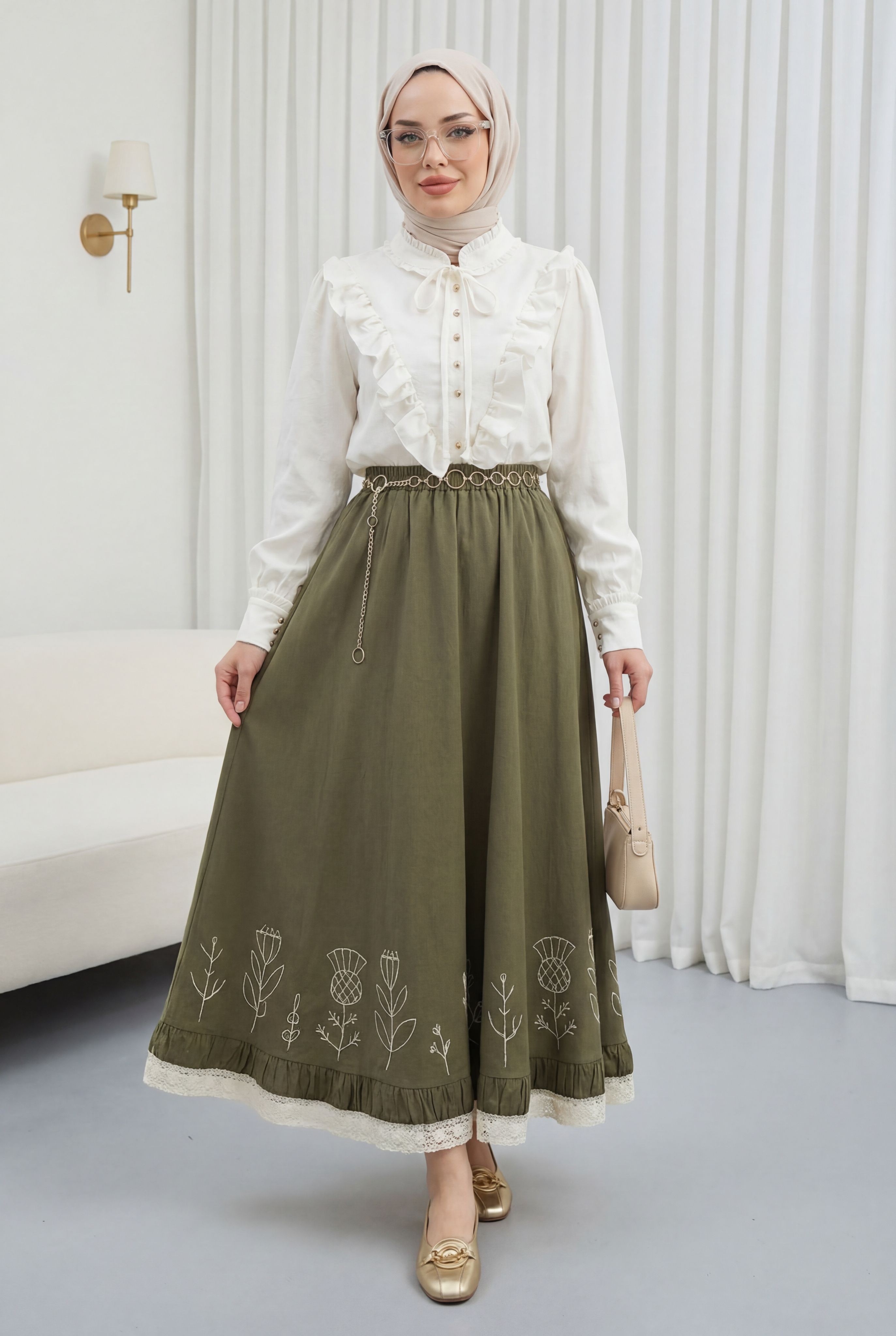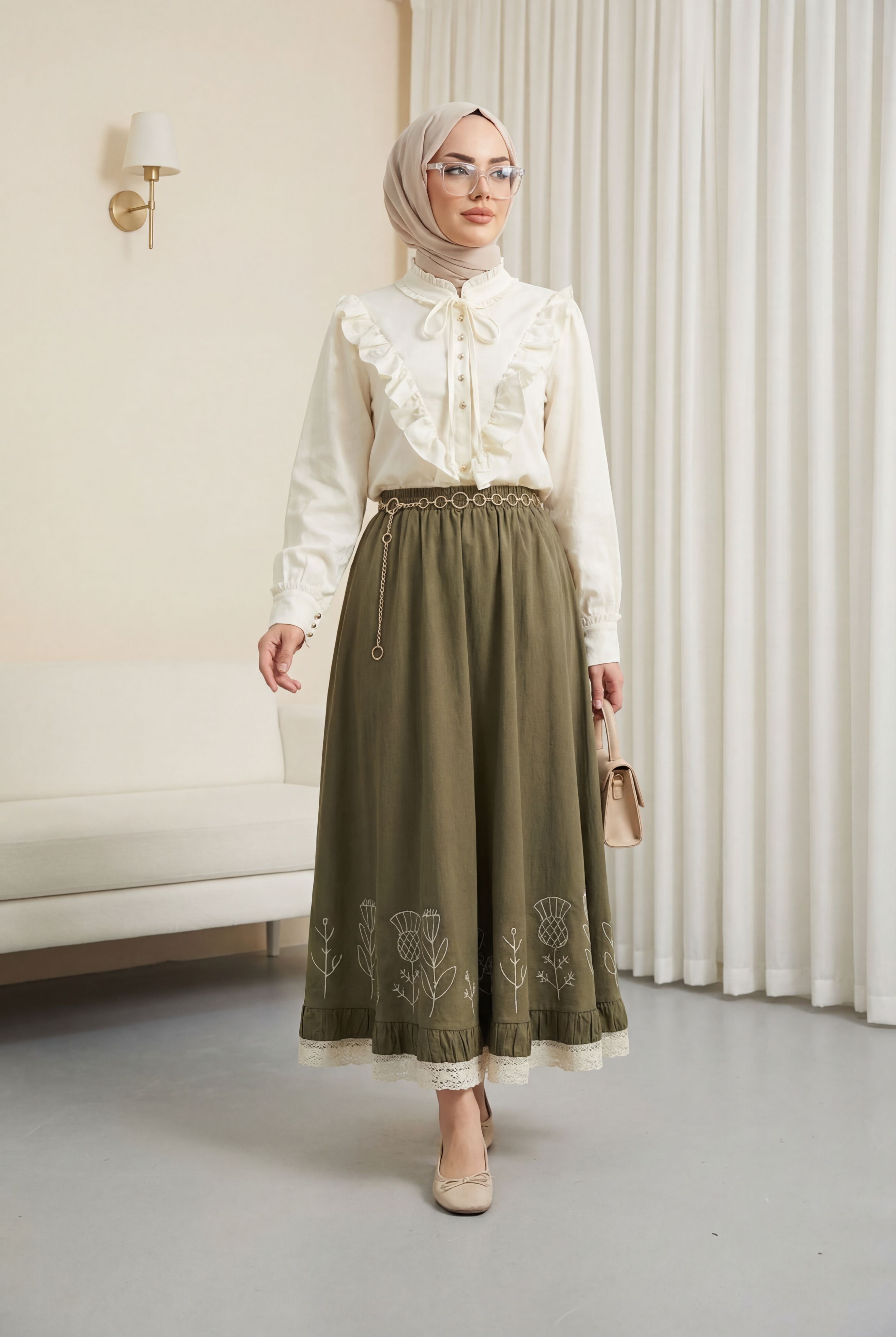 قميص كوبرا طويل الظهر بتفاصيل من الدانتيل وفتحة رقبة من الدانتيل -زيت أخضر