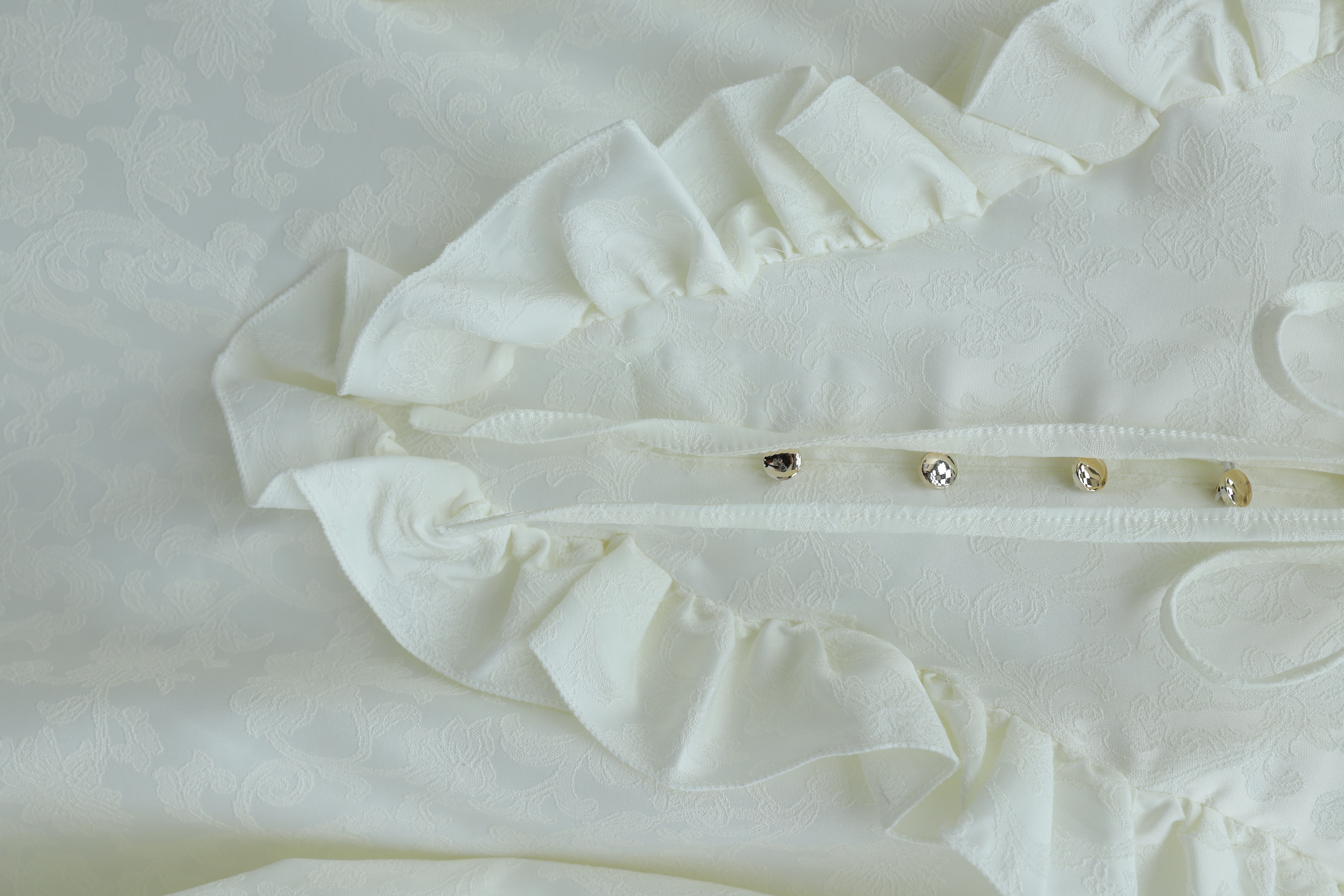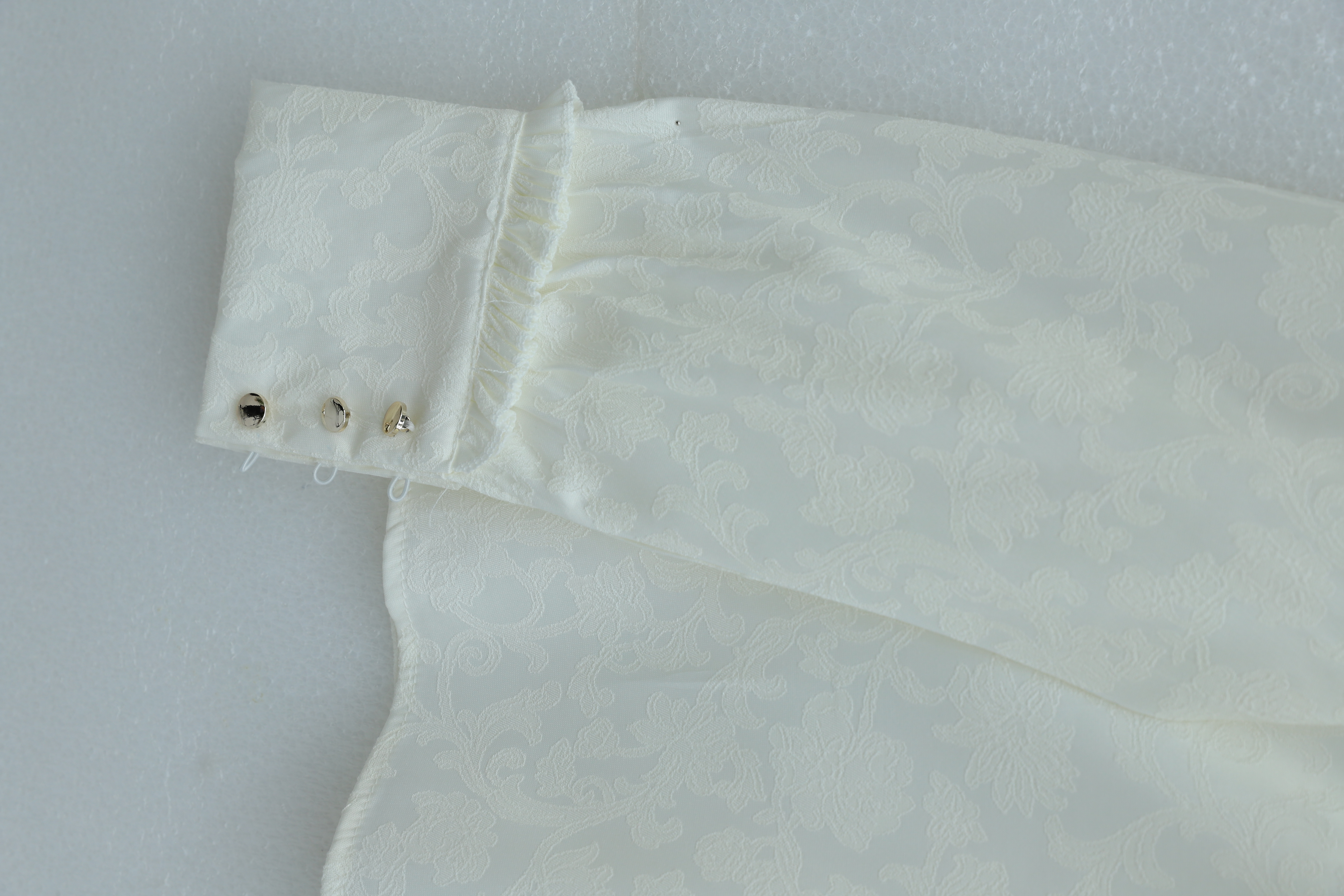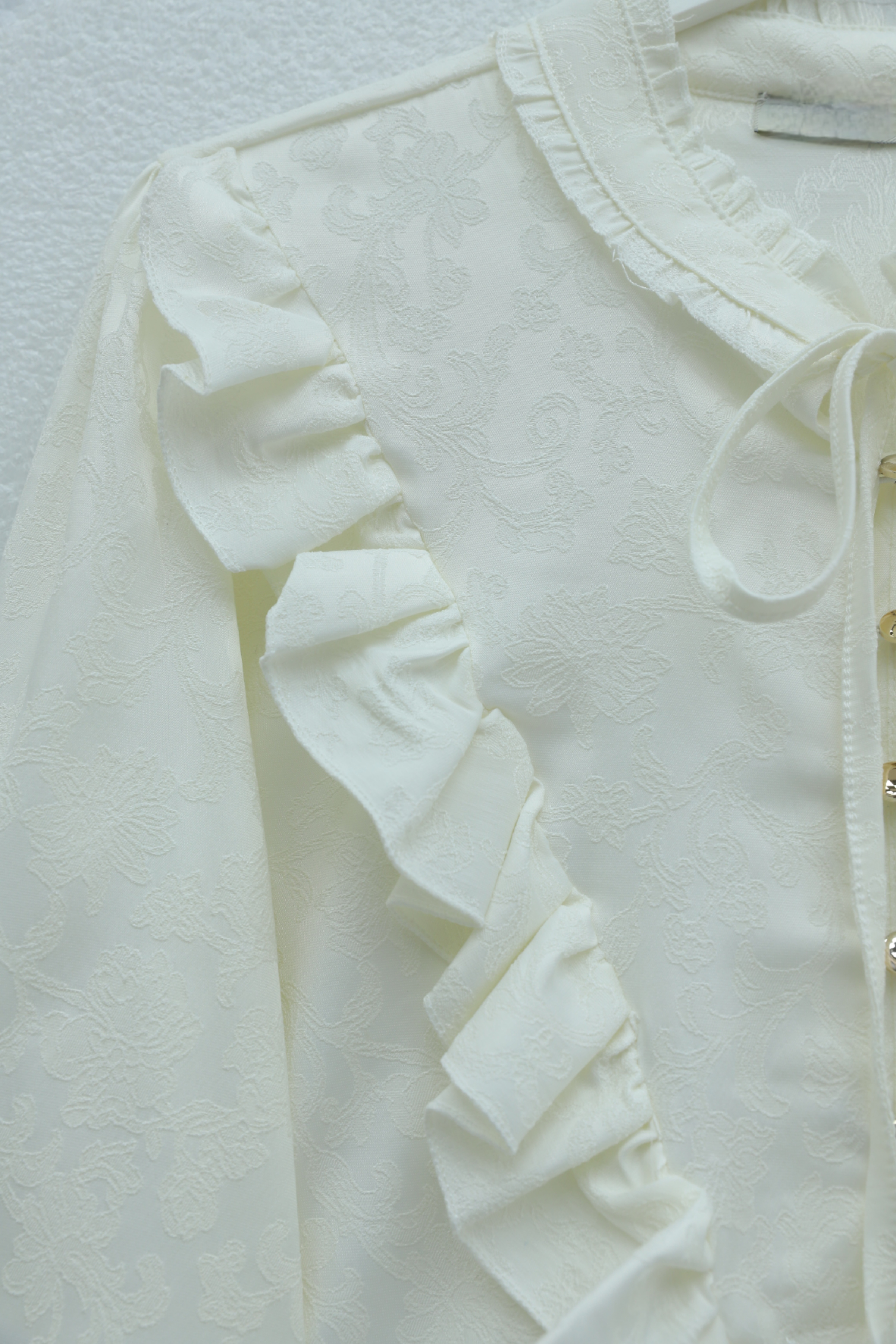 بلوزة جاكار برباط وتفاصيل كشكشة وياقة صينية -أبيض سكري