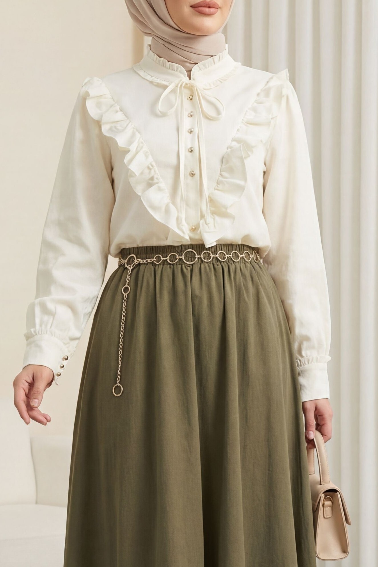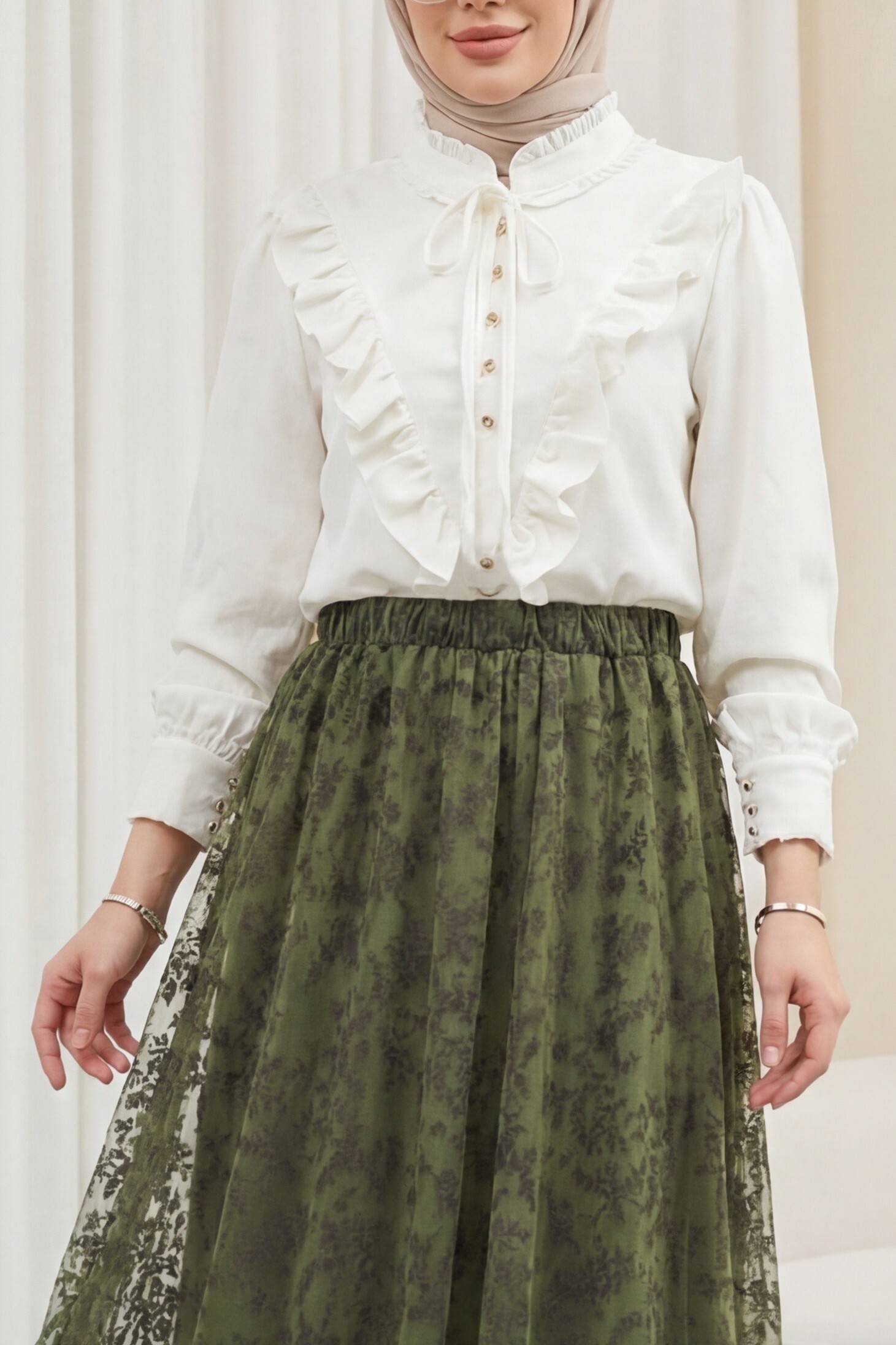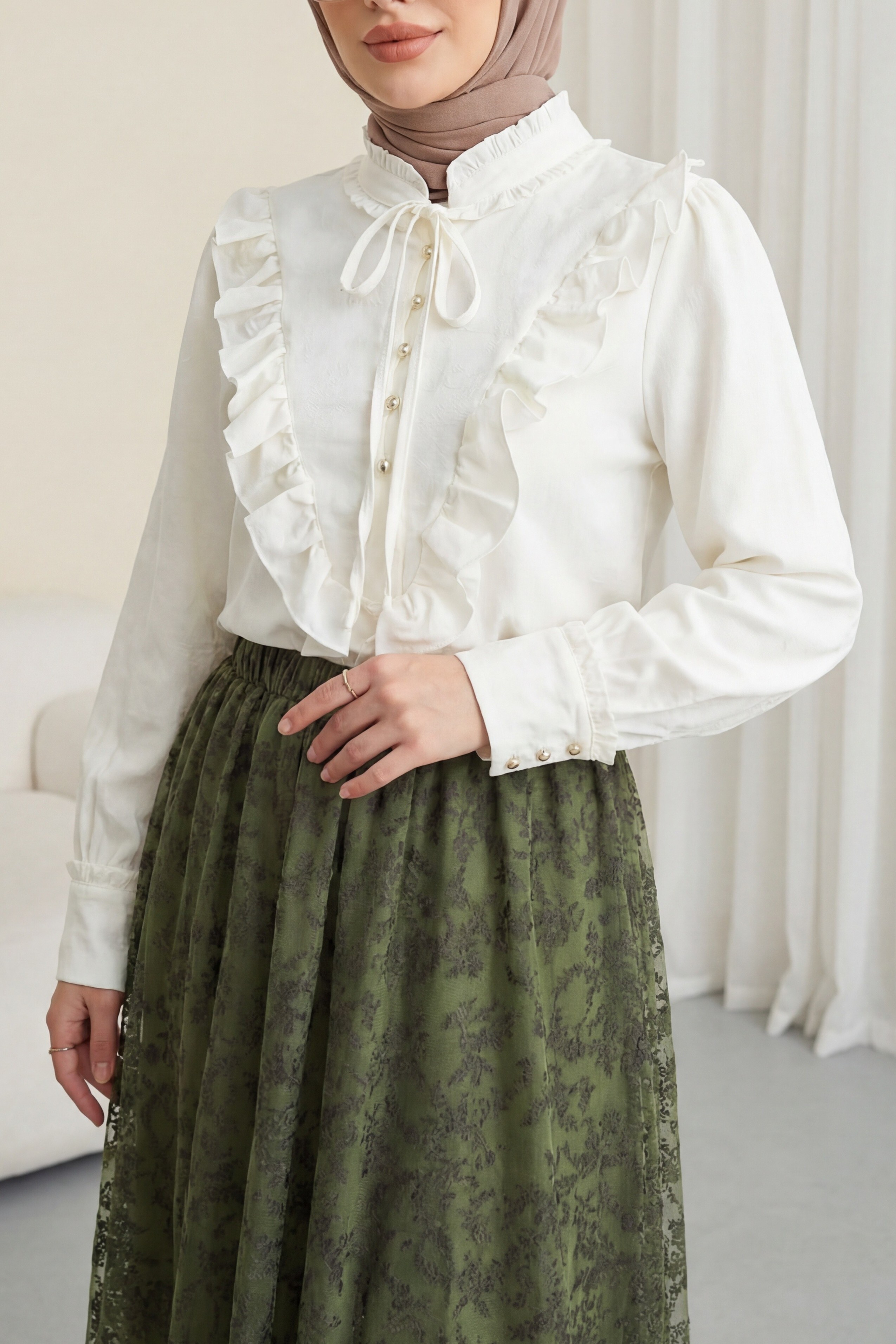 بلوزة جاكار برباط وتفاصيل كشكشة وياقة صينية -أبيض سكري