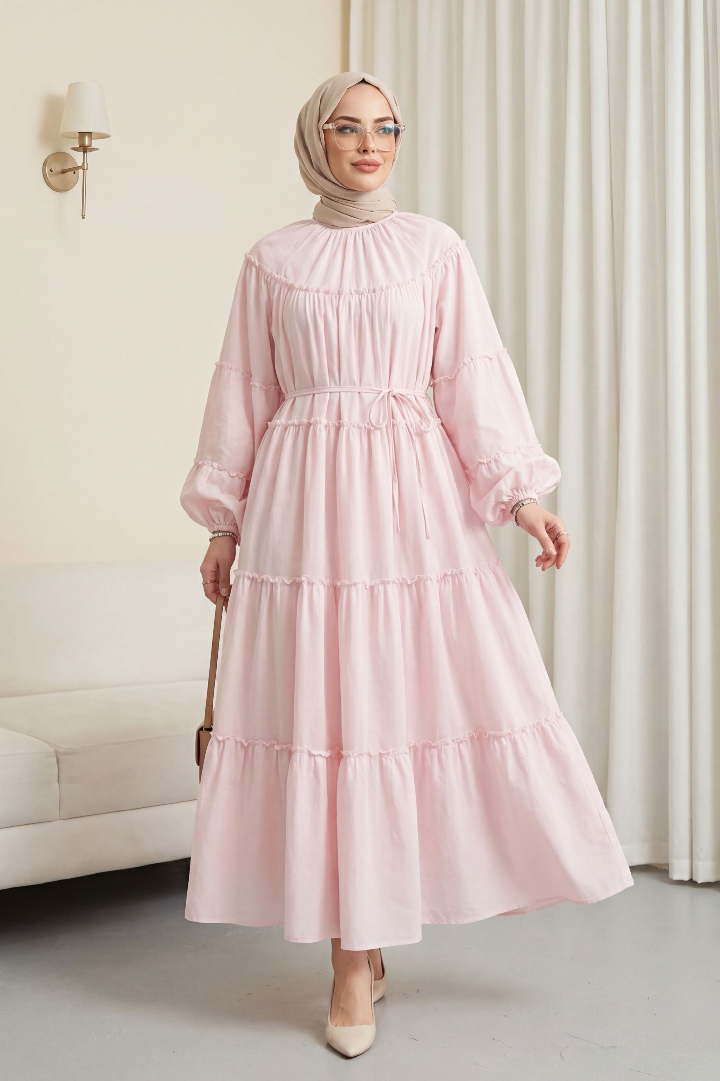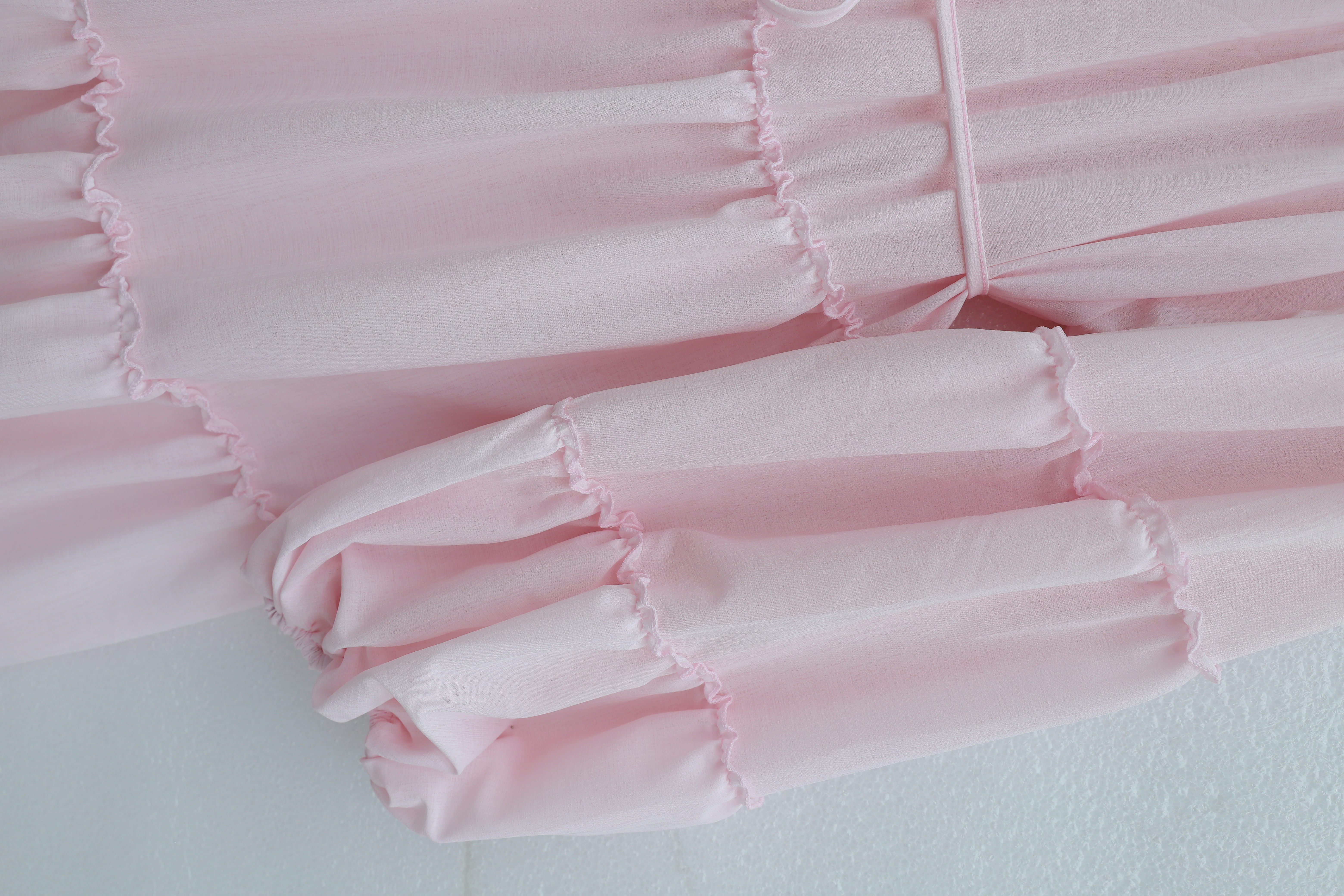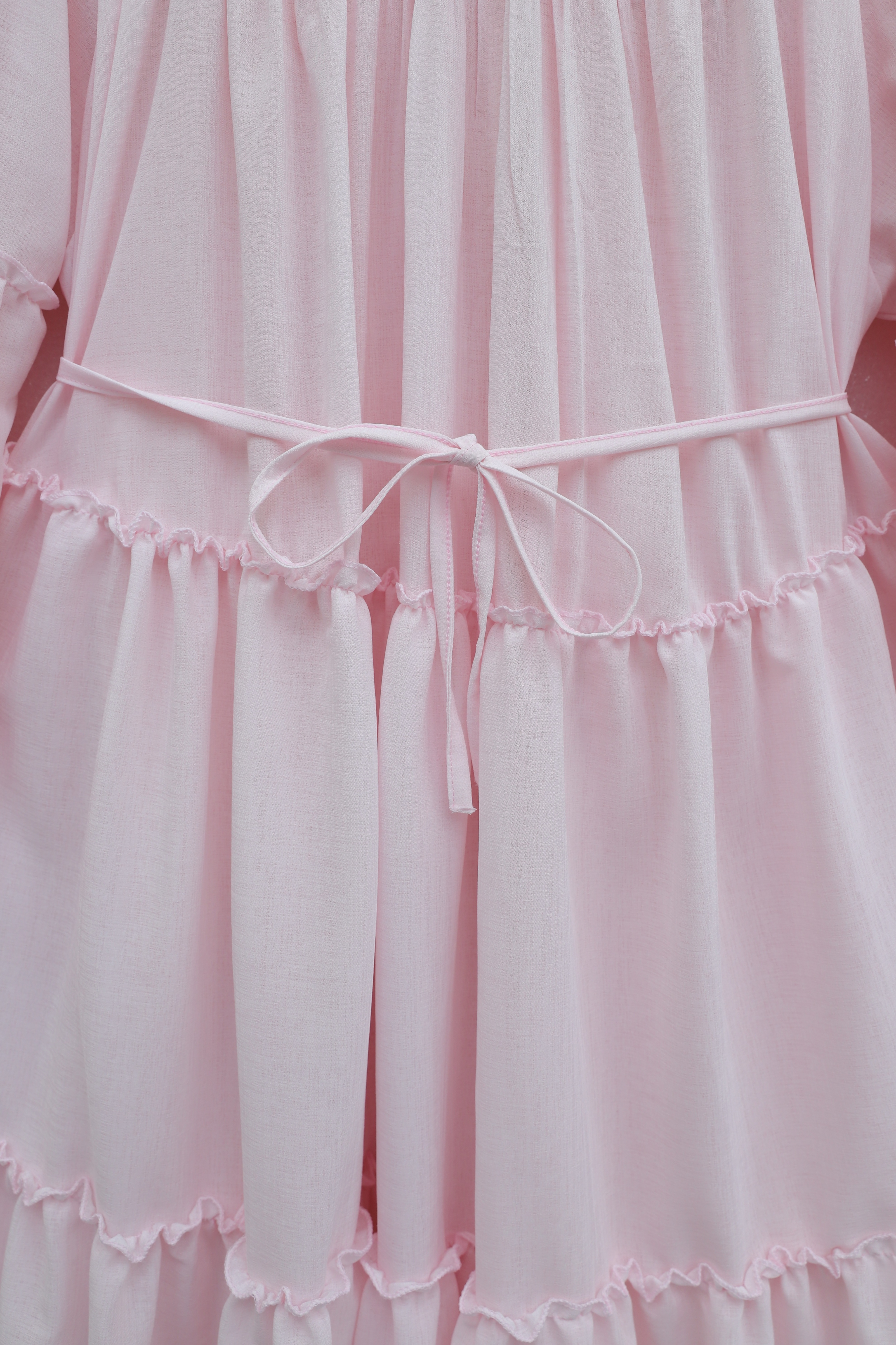 فستان مزين بكشكشة متعددة الطبقات وأكمام مطاطية ورباط عند الخصر. -بودرة