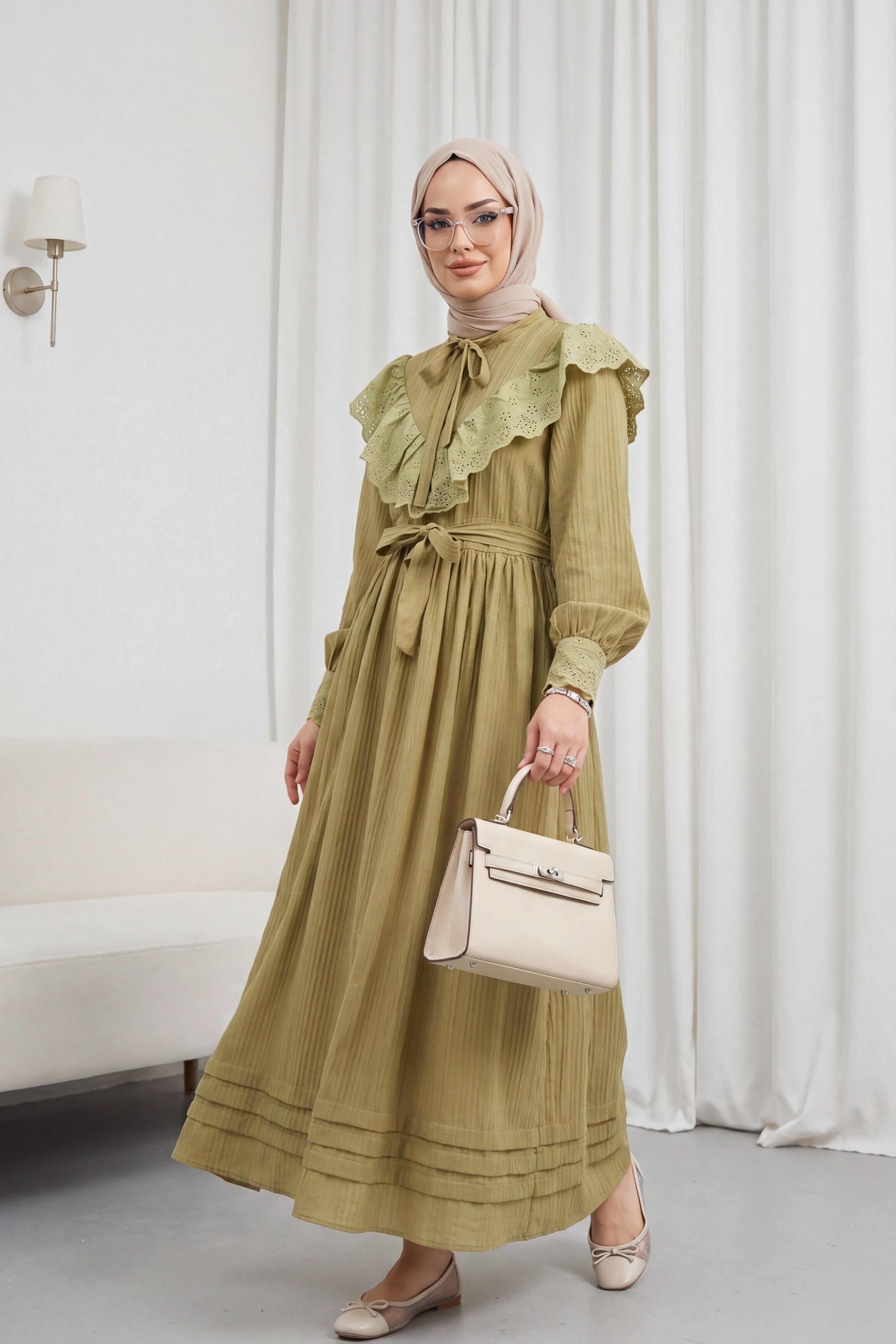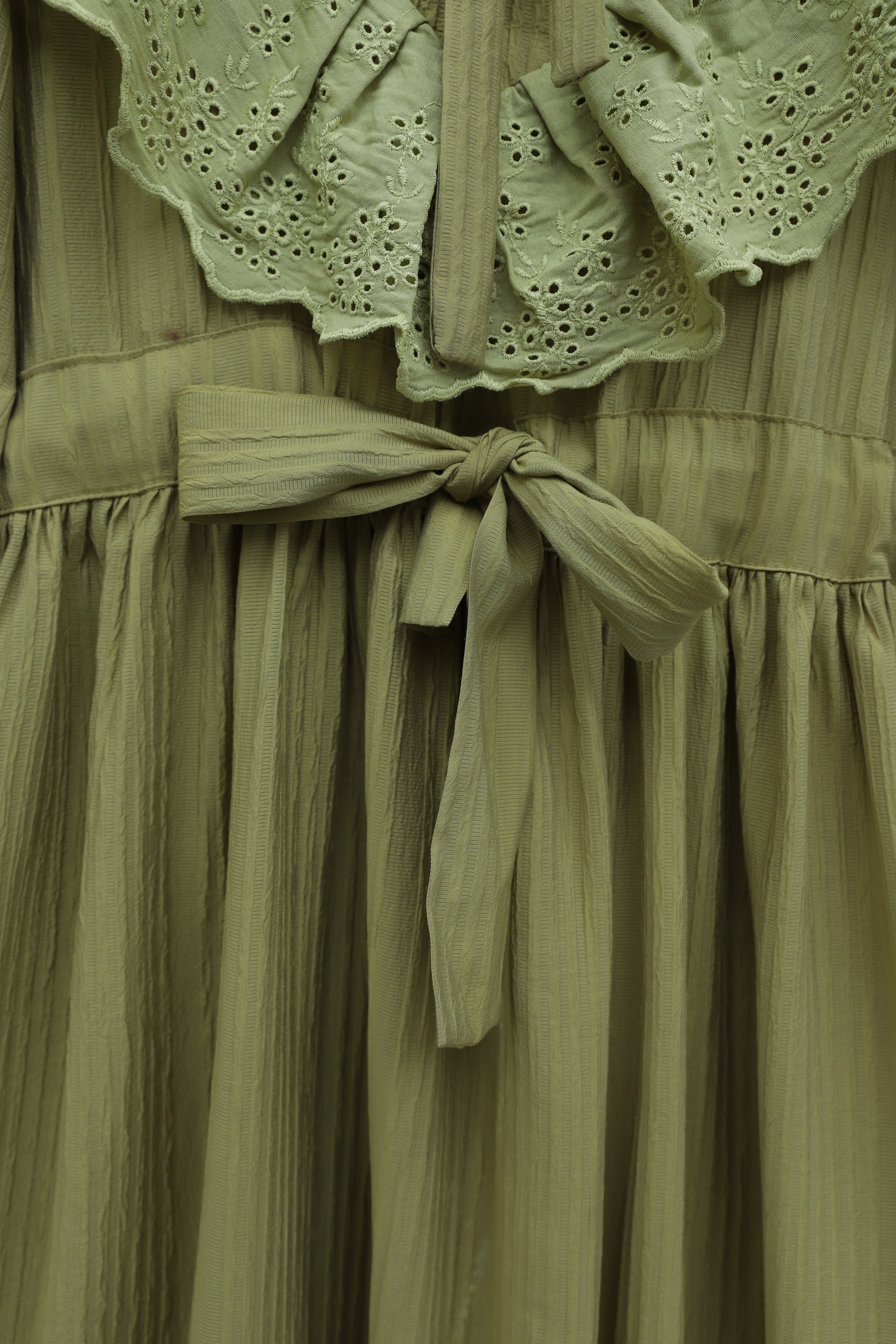 فستان مبطّن ومجعد بتفاصيل من الدانتيل عند خط العنق والخصر. -زيت أخضر