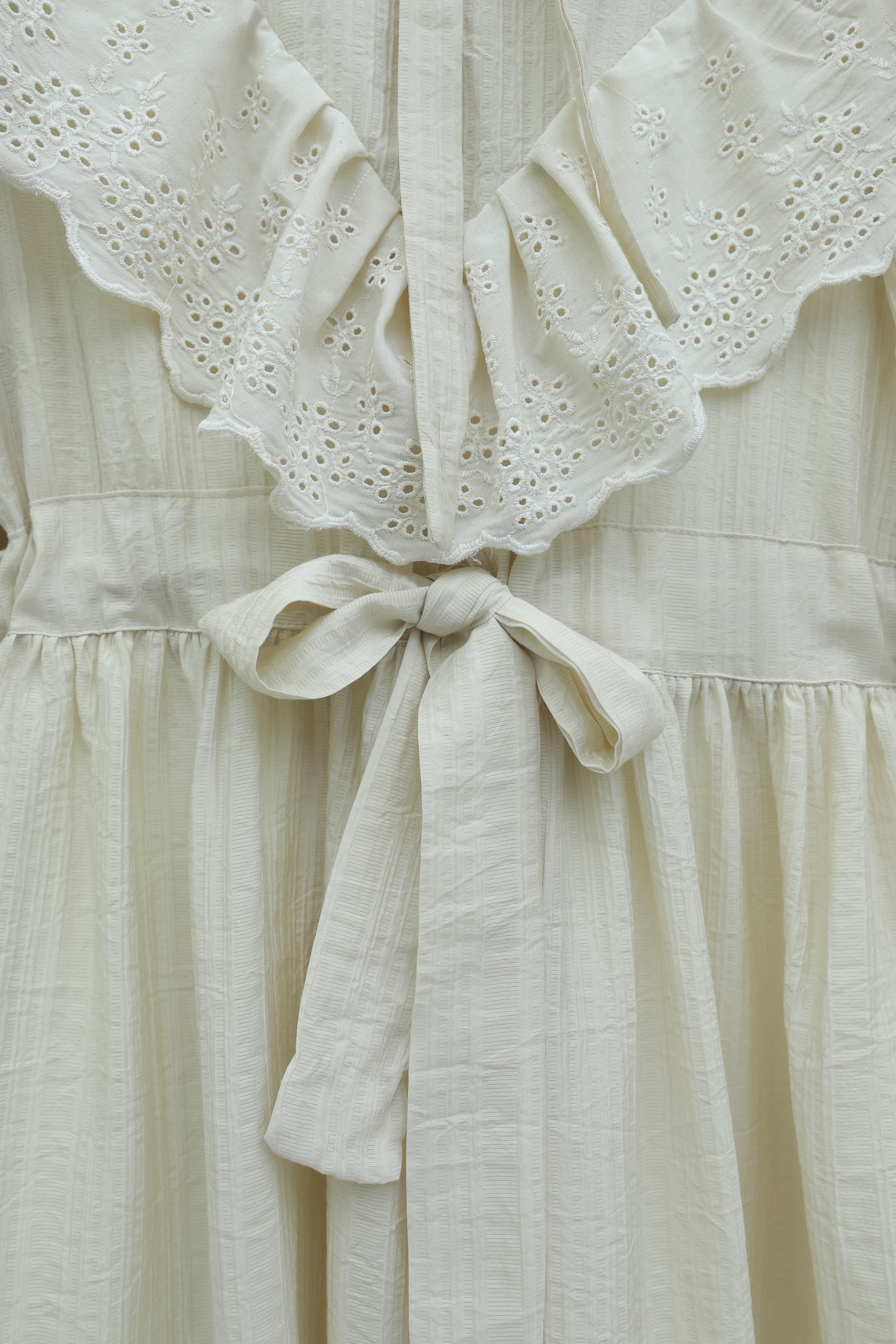 فستان مبطّن ومجعد بتفاصيل من الدانتيل عند خط العنق والخصر. -حجر