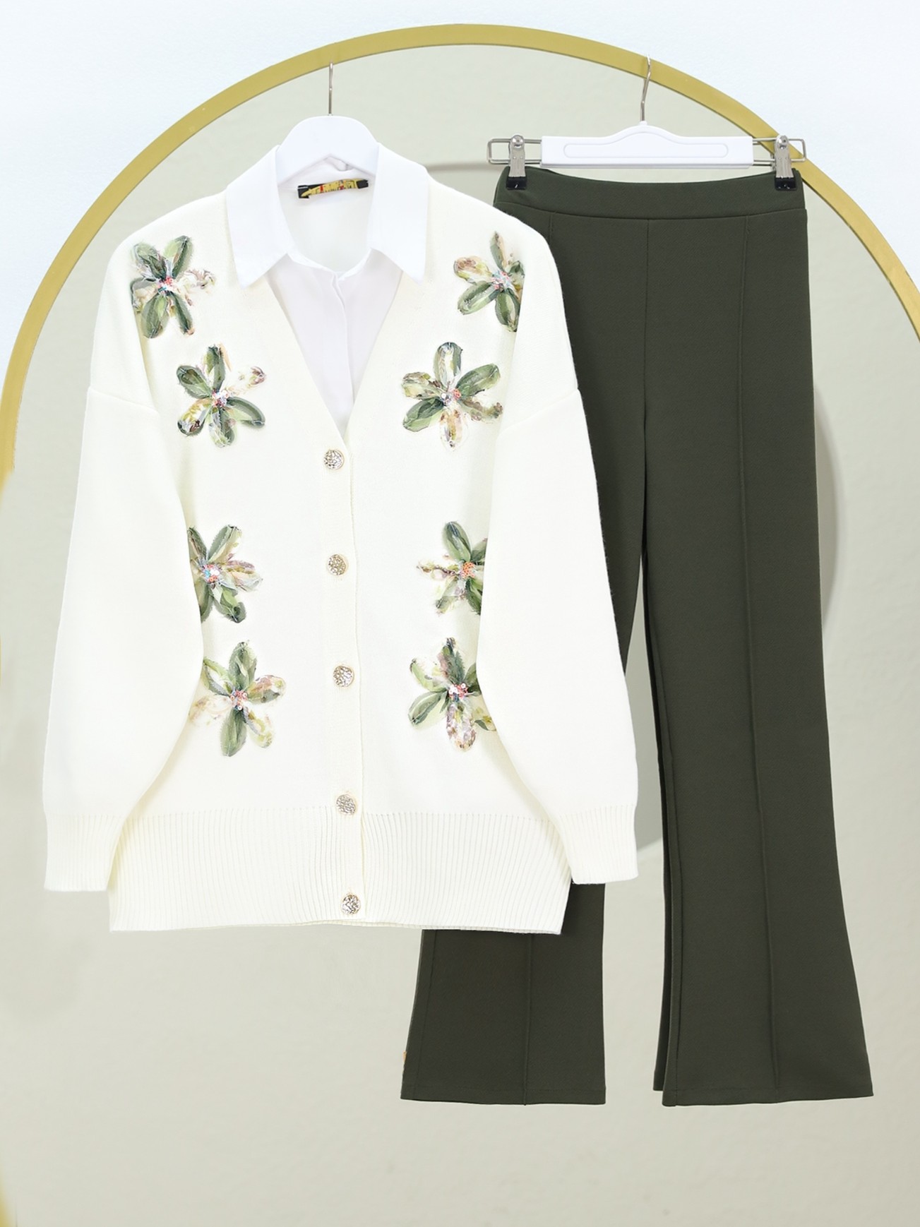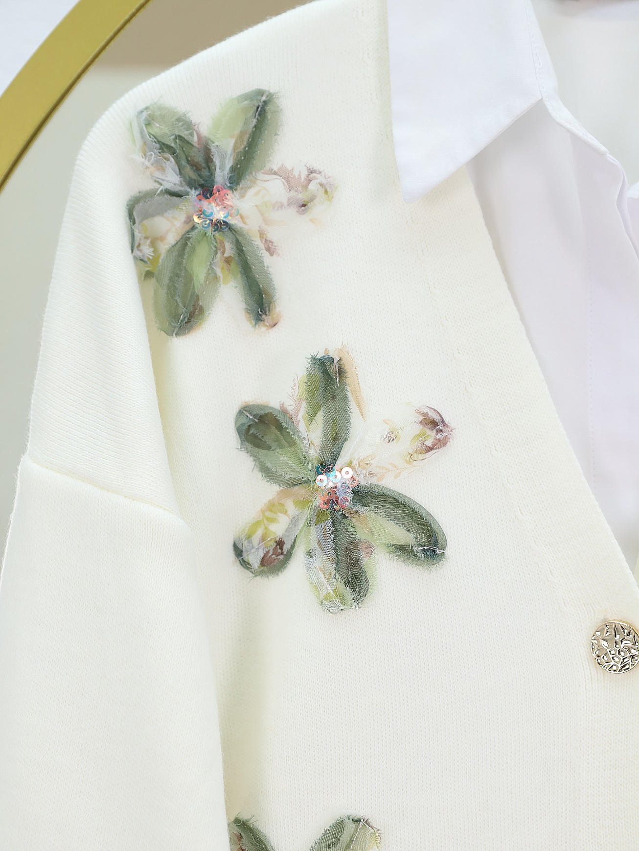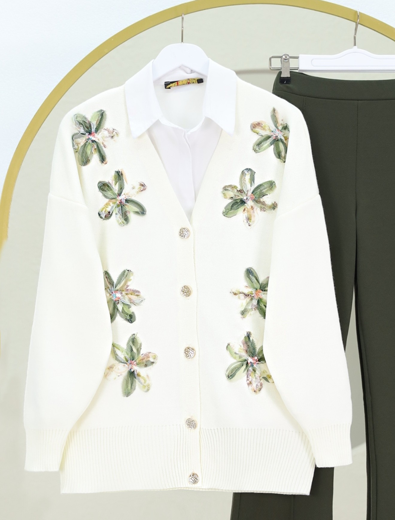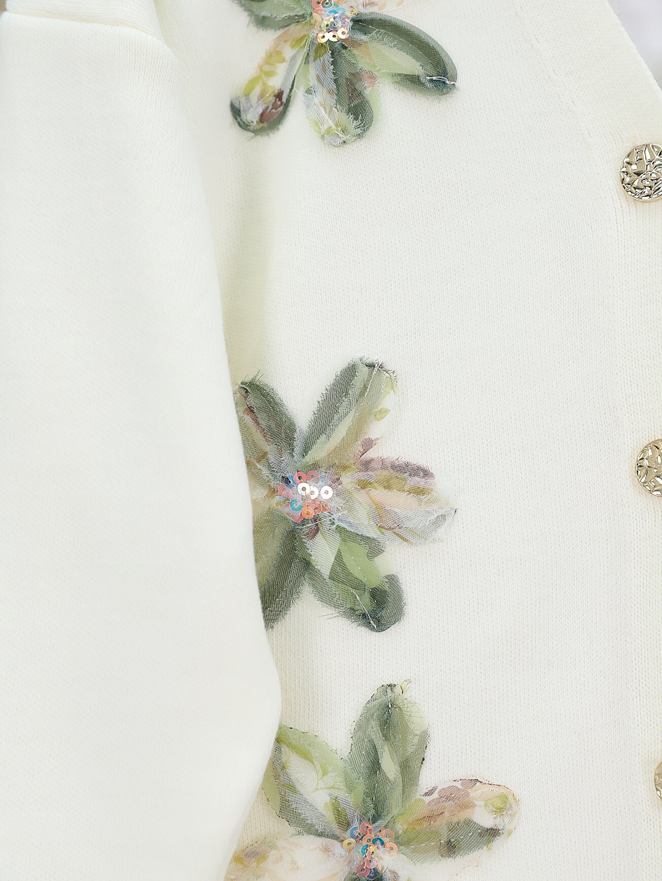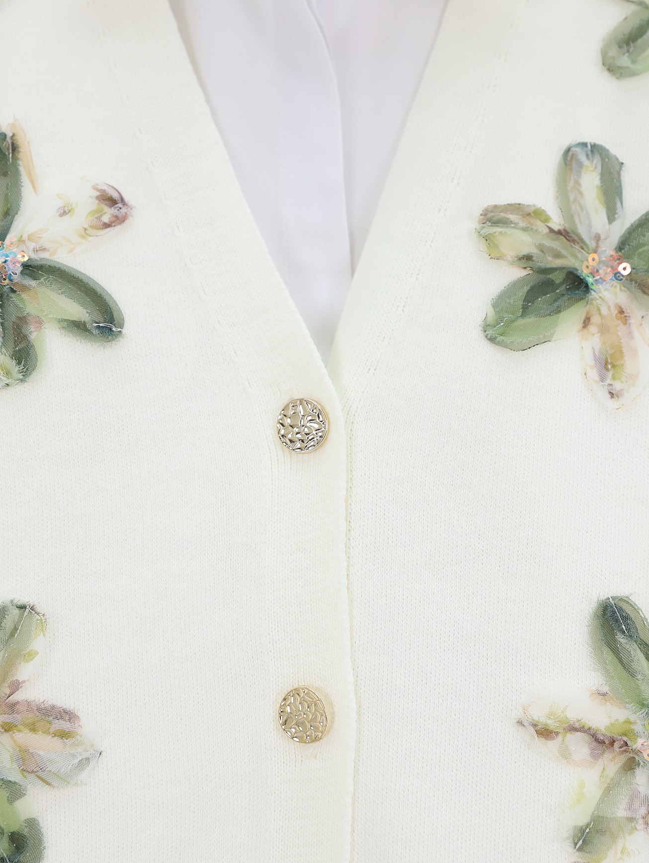 كارديجان محبوك بأزرار مزين بزهور مطرزة بكرات صغيرة على الجهة الأمامية والأكمام -أبيض سكري