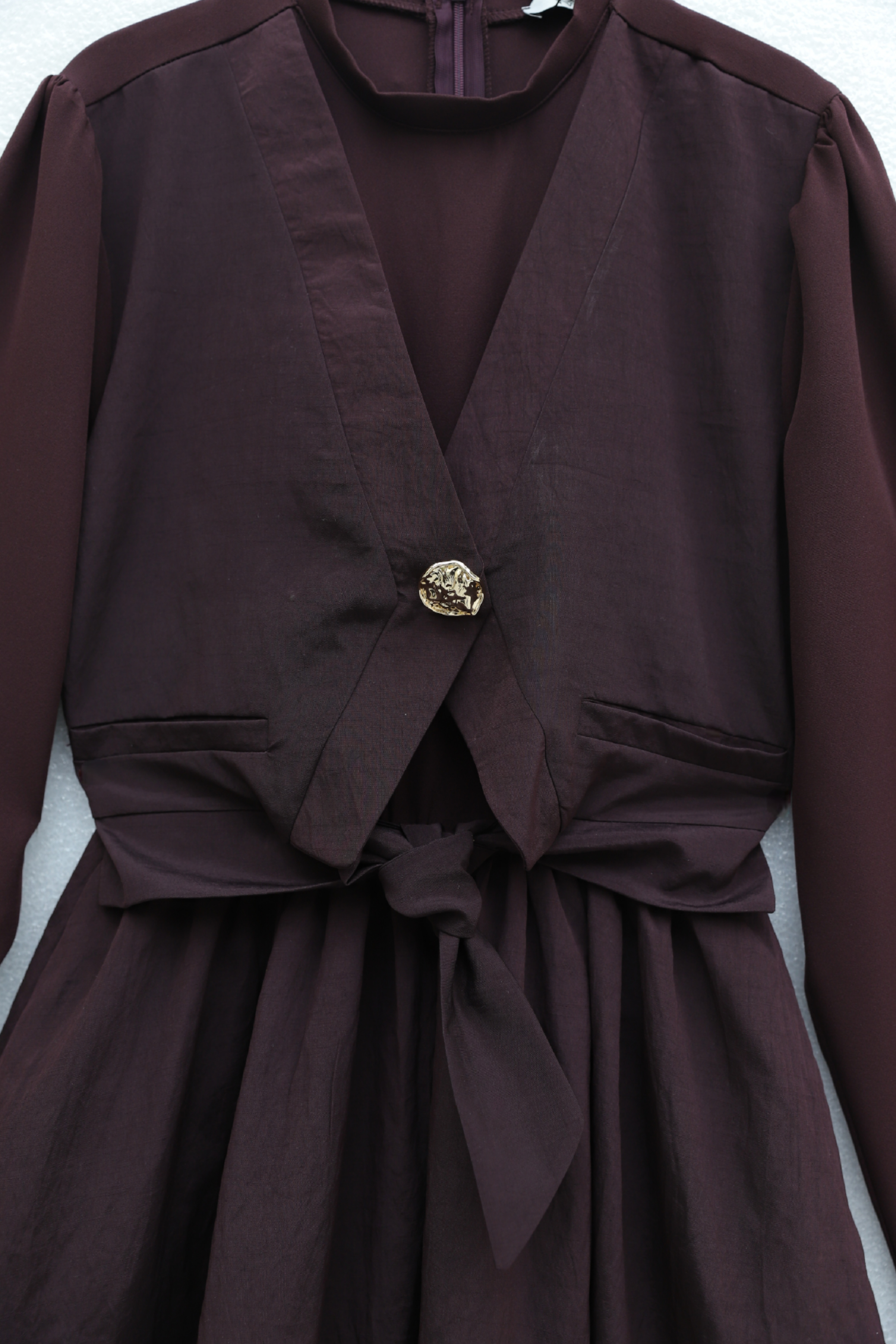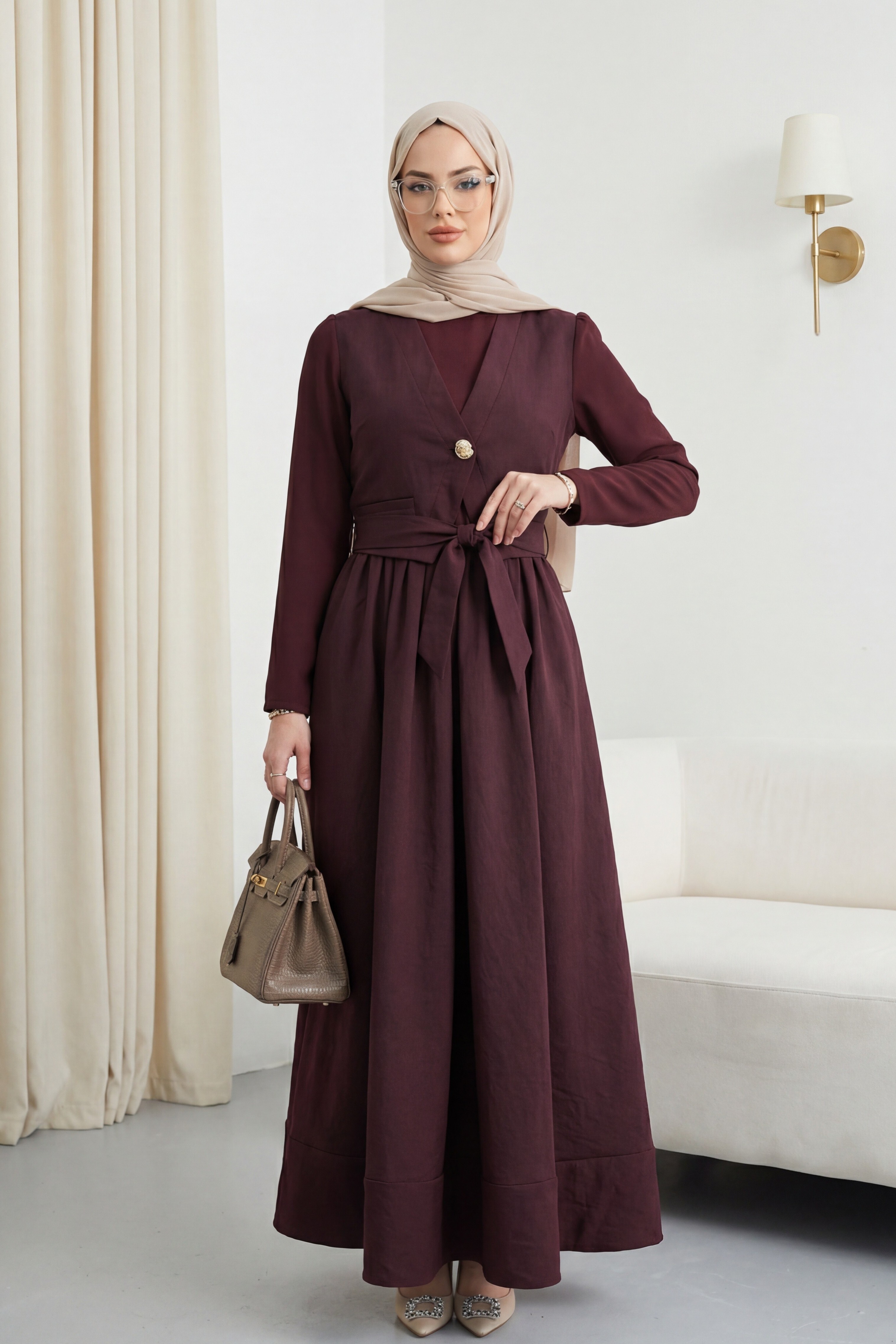 فستان من الساتان القطني بنصف أزرار، وياقة، وجيب جانبي، وحزام. -بنى