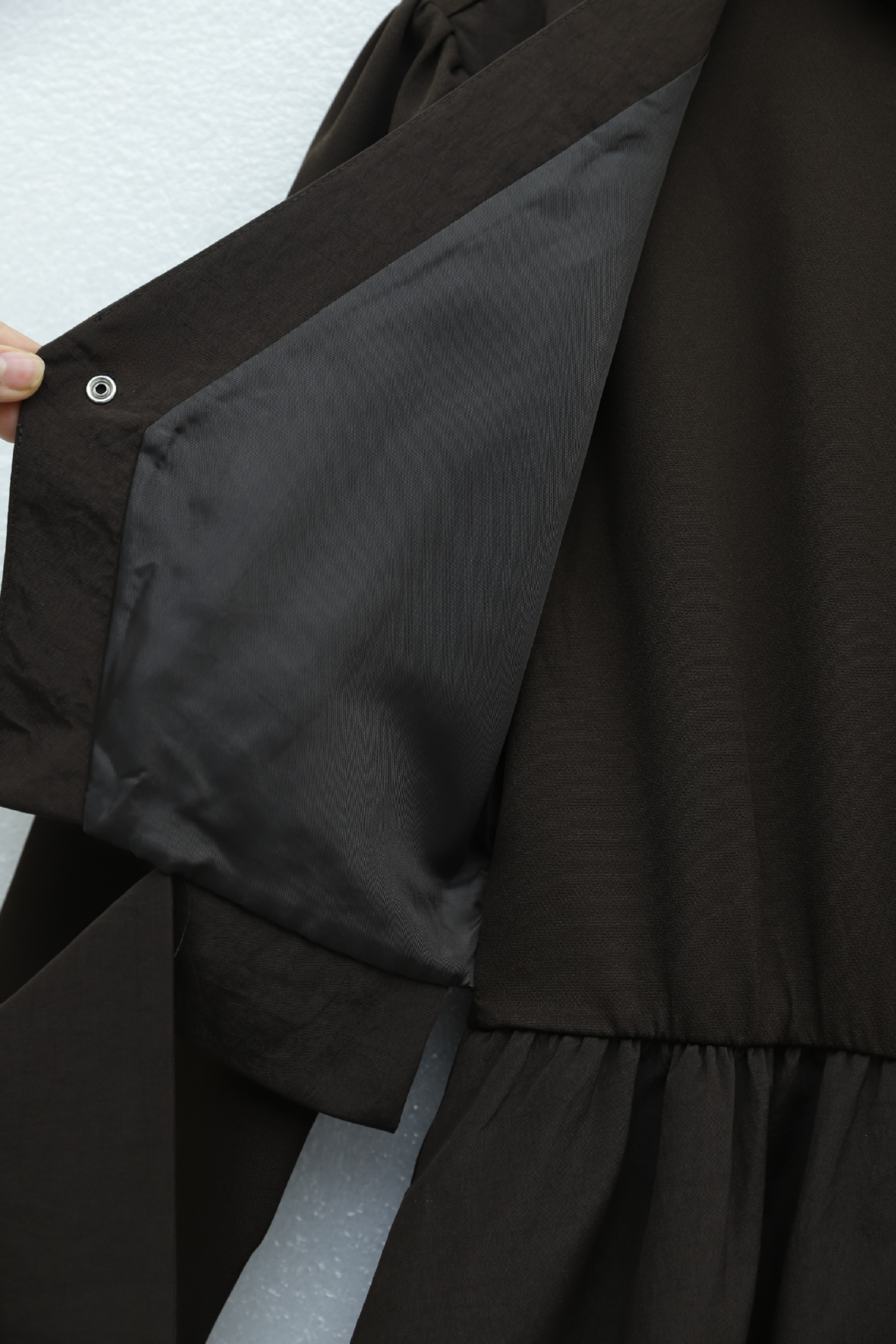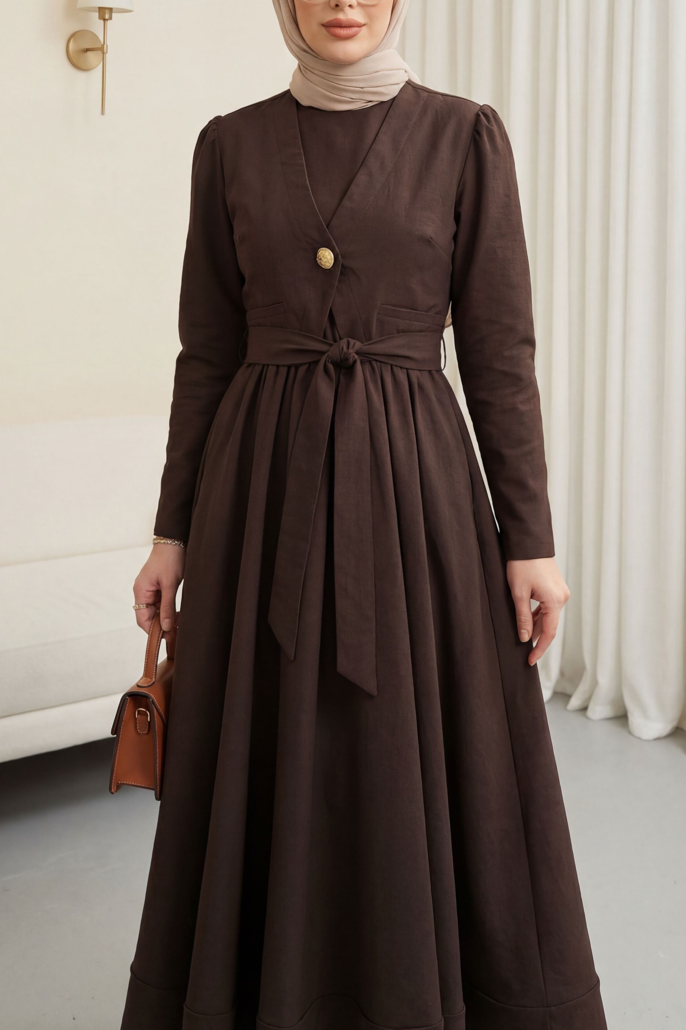 فستان من الساتان القطني بنصف أزرار، وياقة، وجيب جانبي، وحزام. -بنى