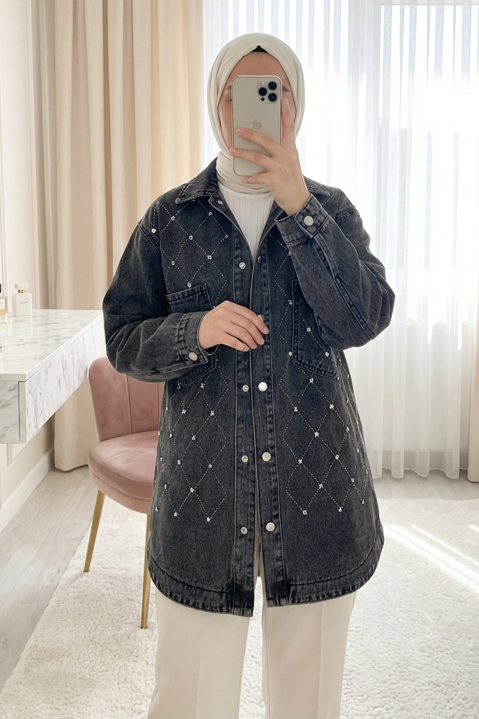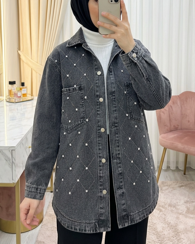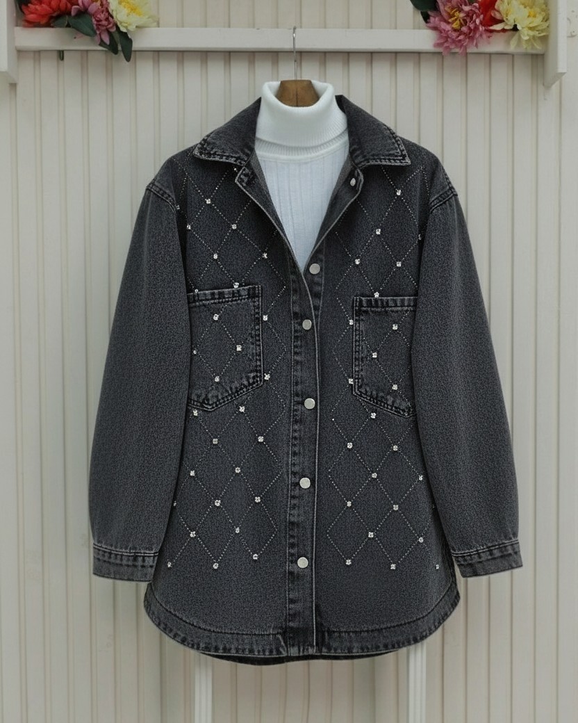 جاكيت جينز بأزرار أمامية مزين بأحجار الراين وجيبين -لون مدخن