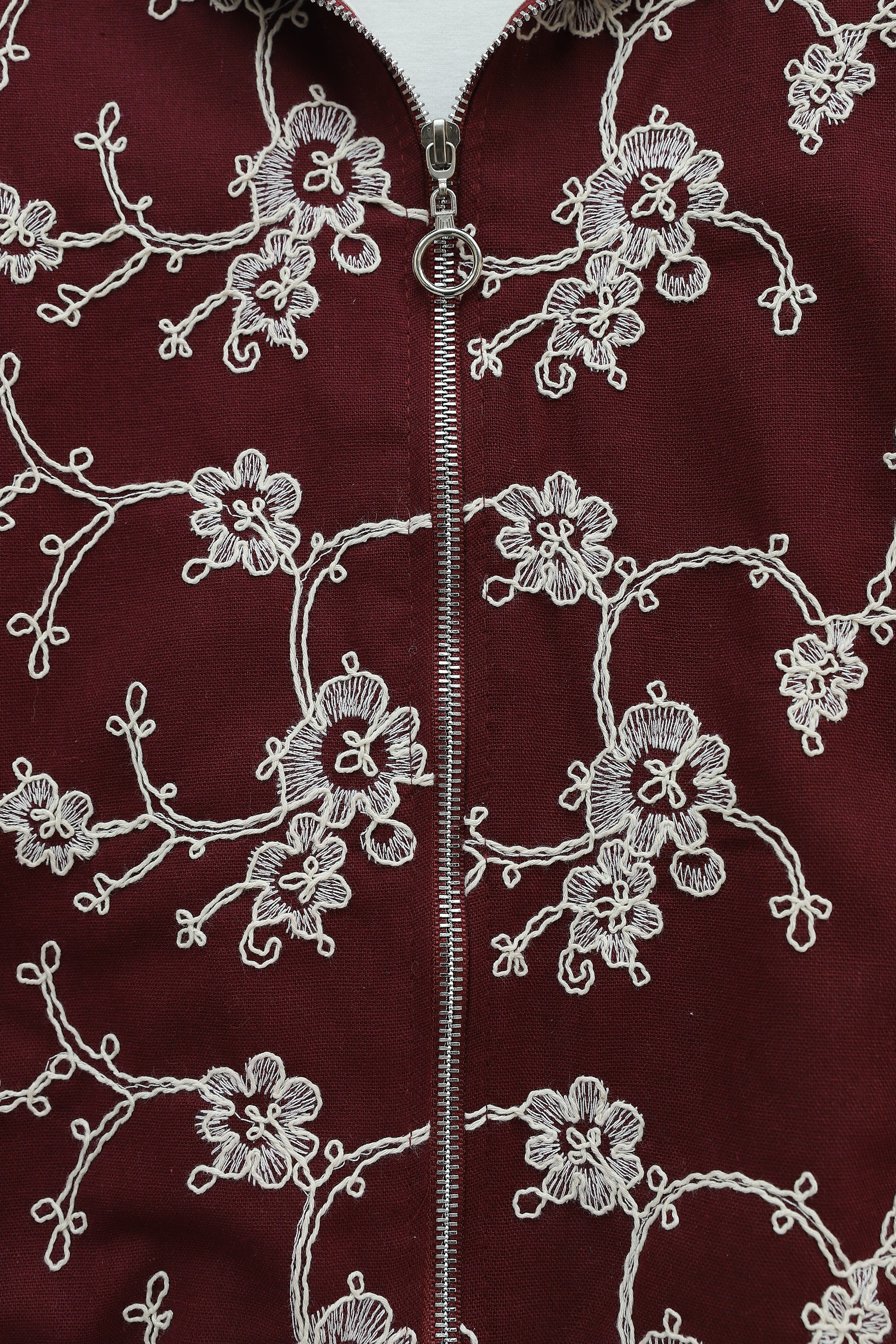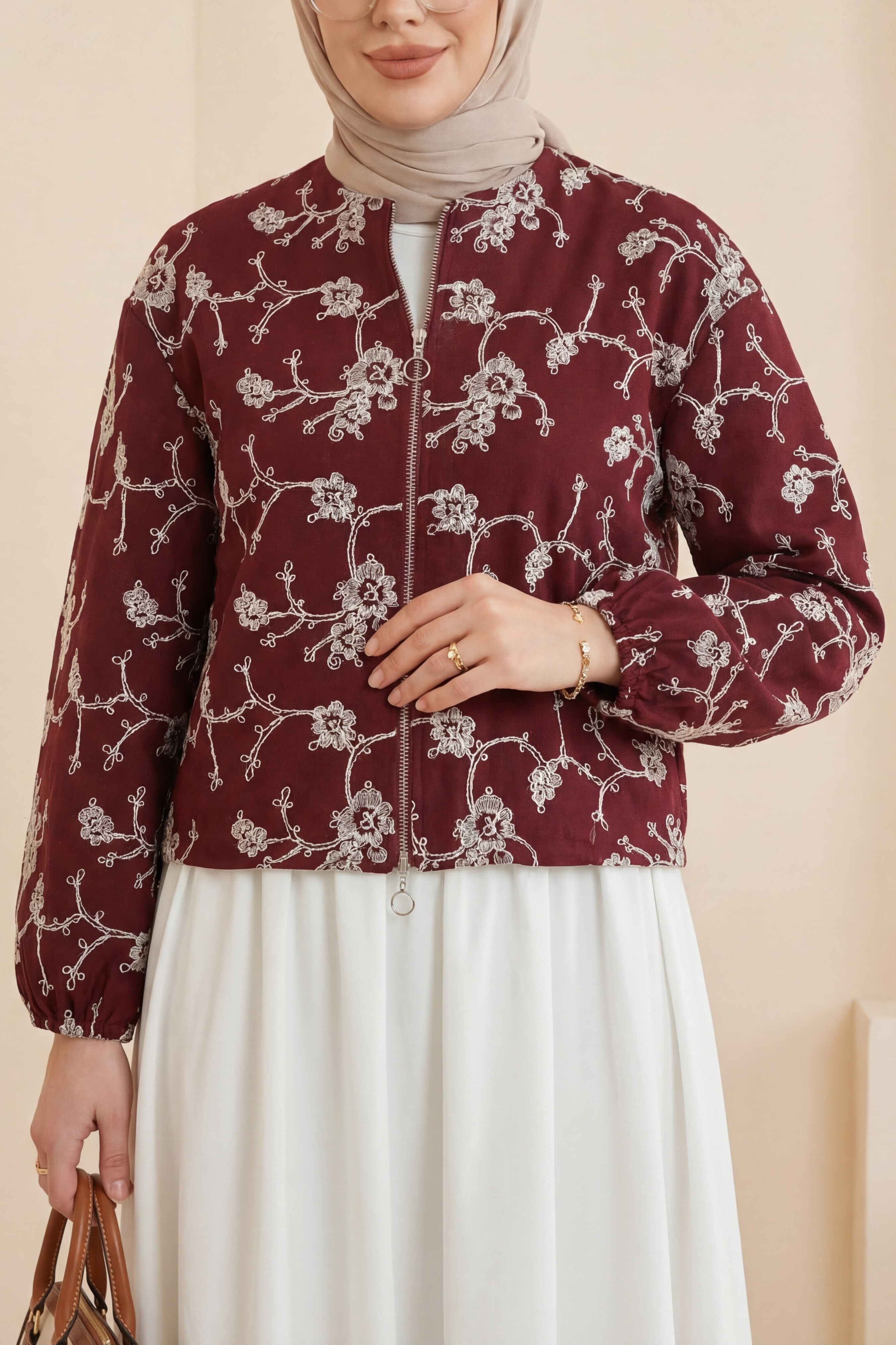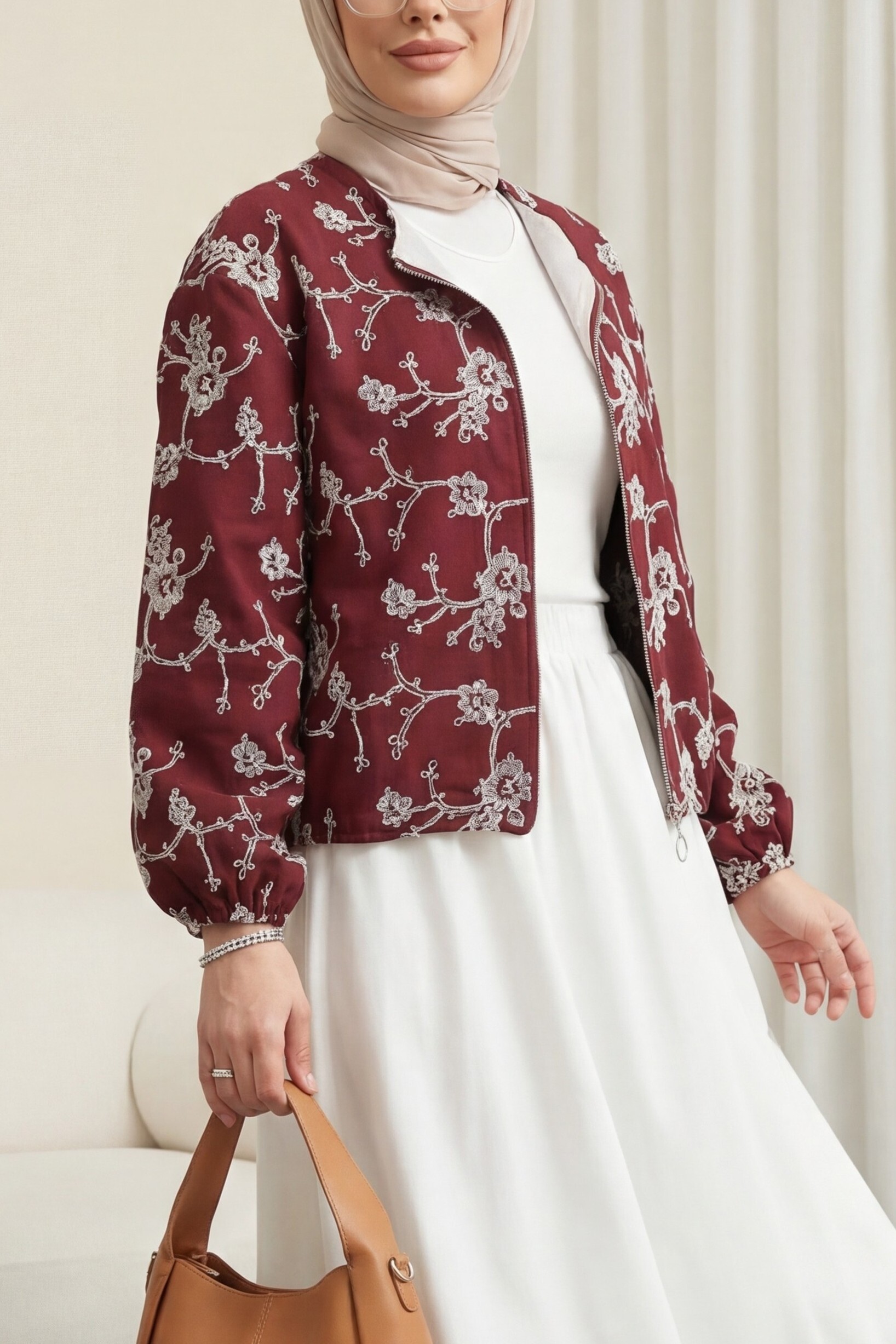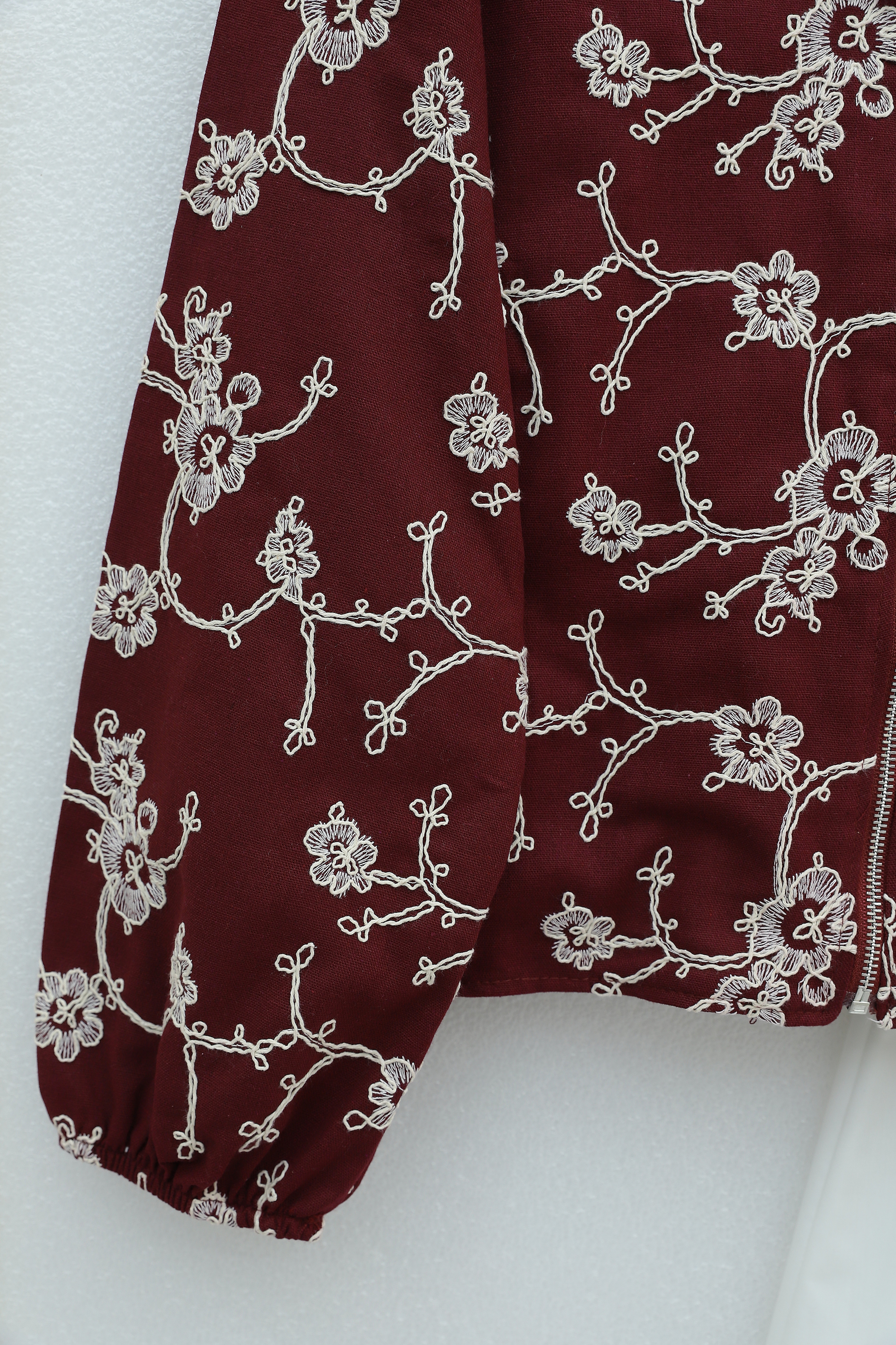 جاكيت كتان مطرز بياقة دائرية وسحاب وجيوب -بوردو