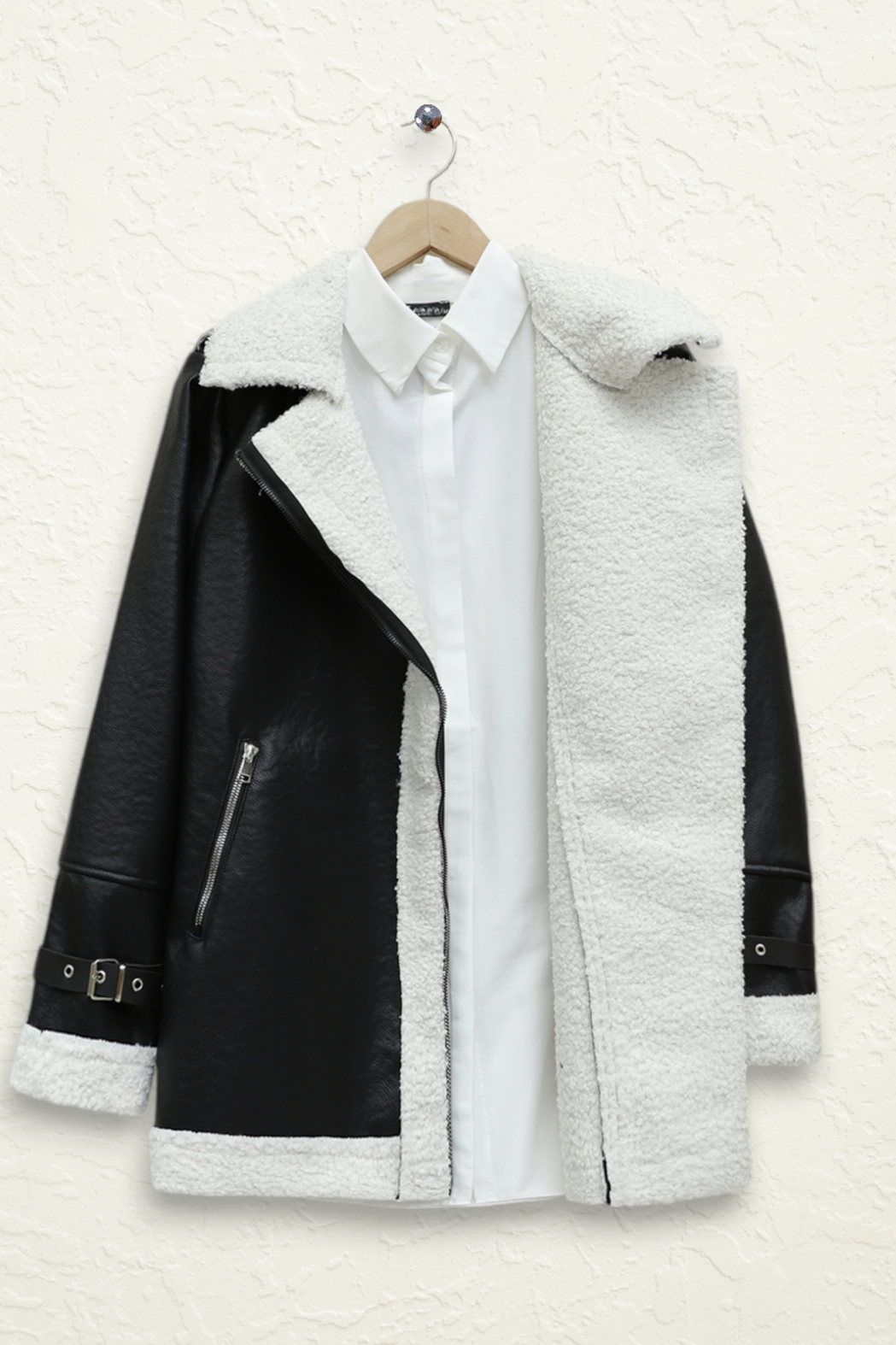Podyumplus جاكيت جلدي داخلي من القطيفة بسحاب -أبيض سكري