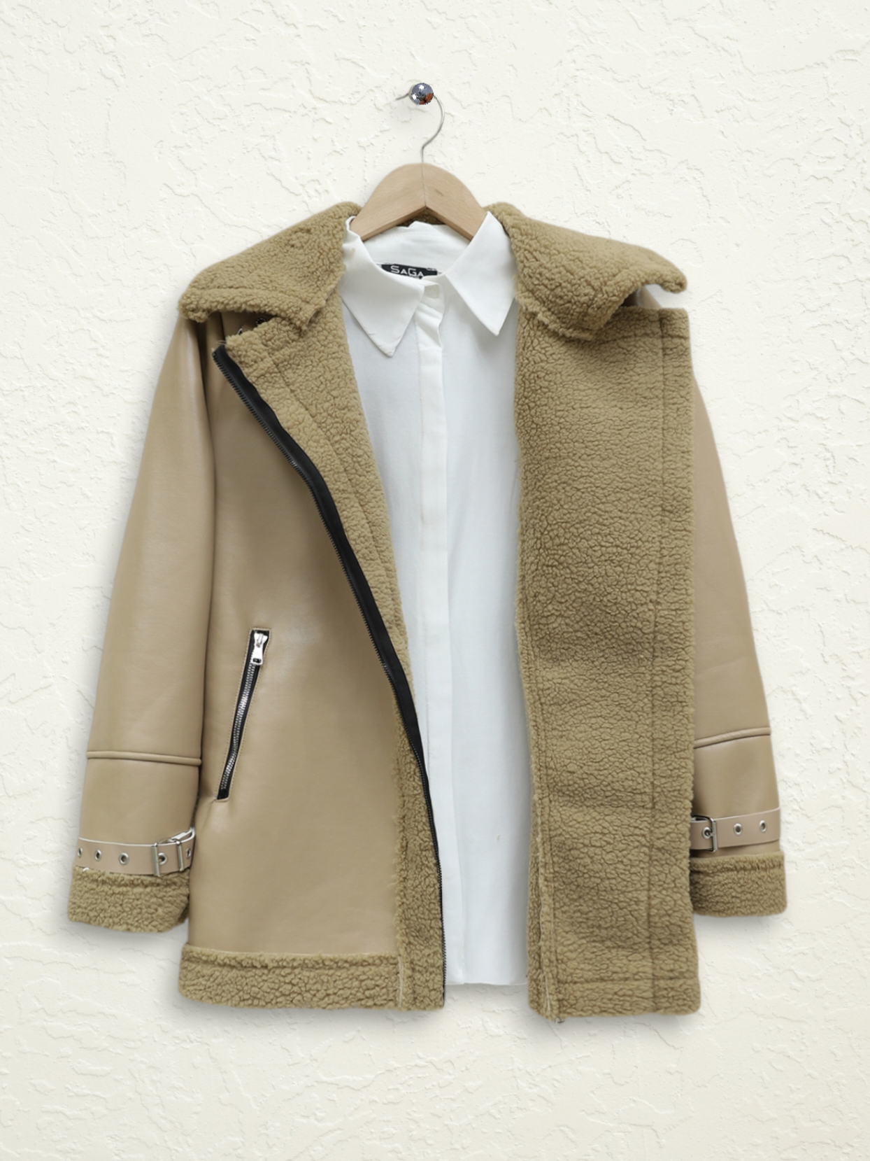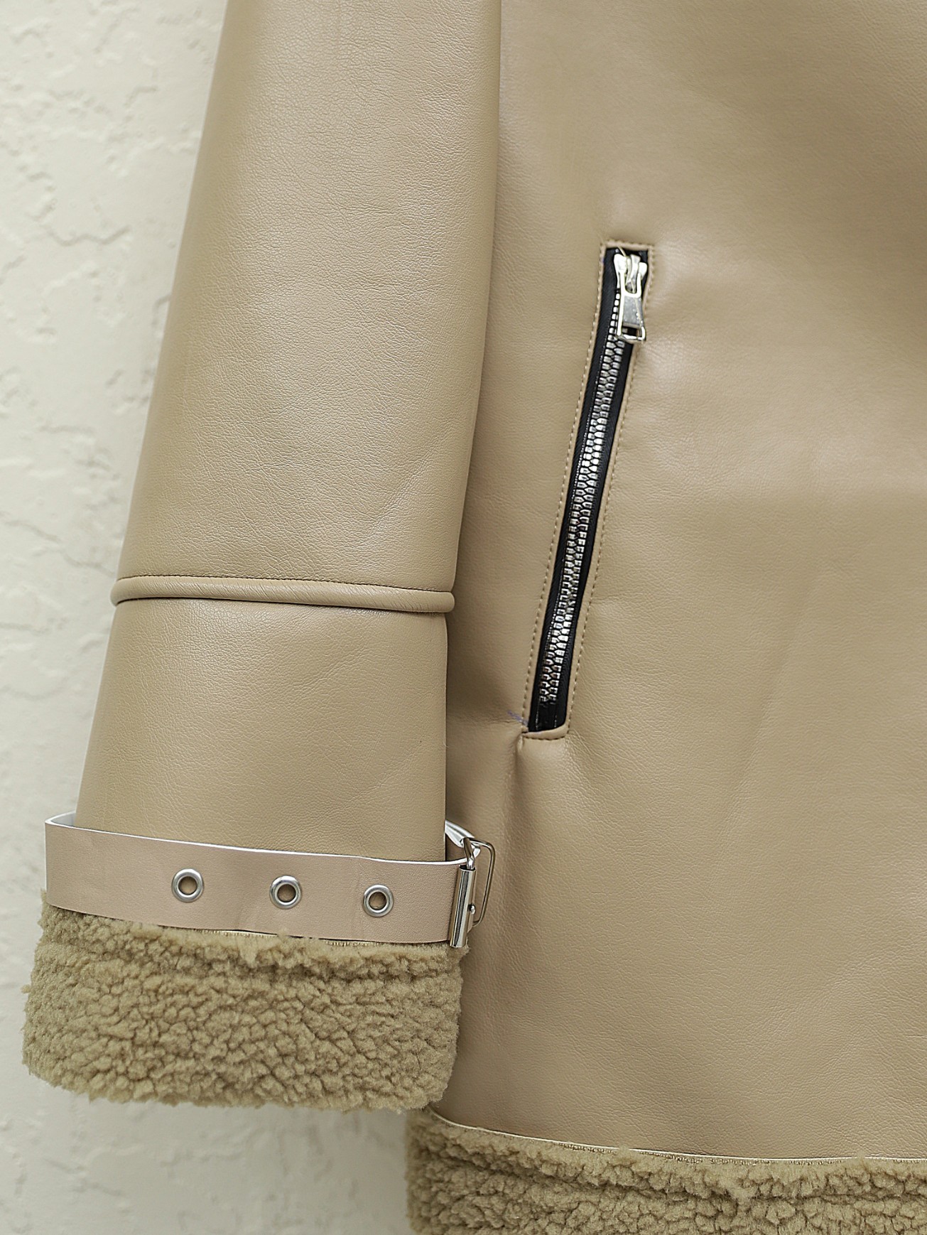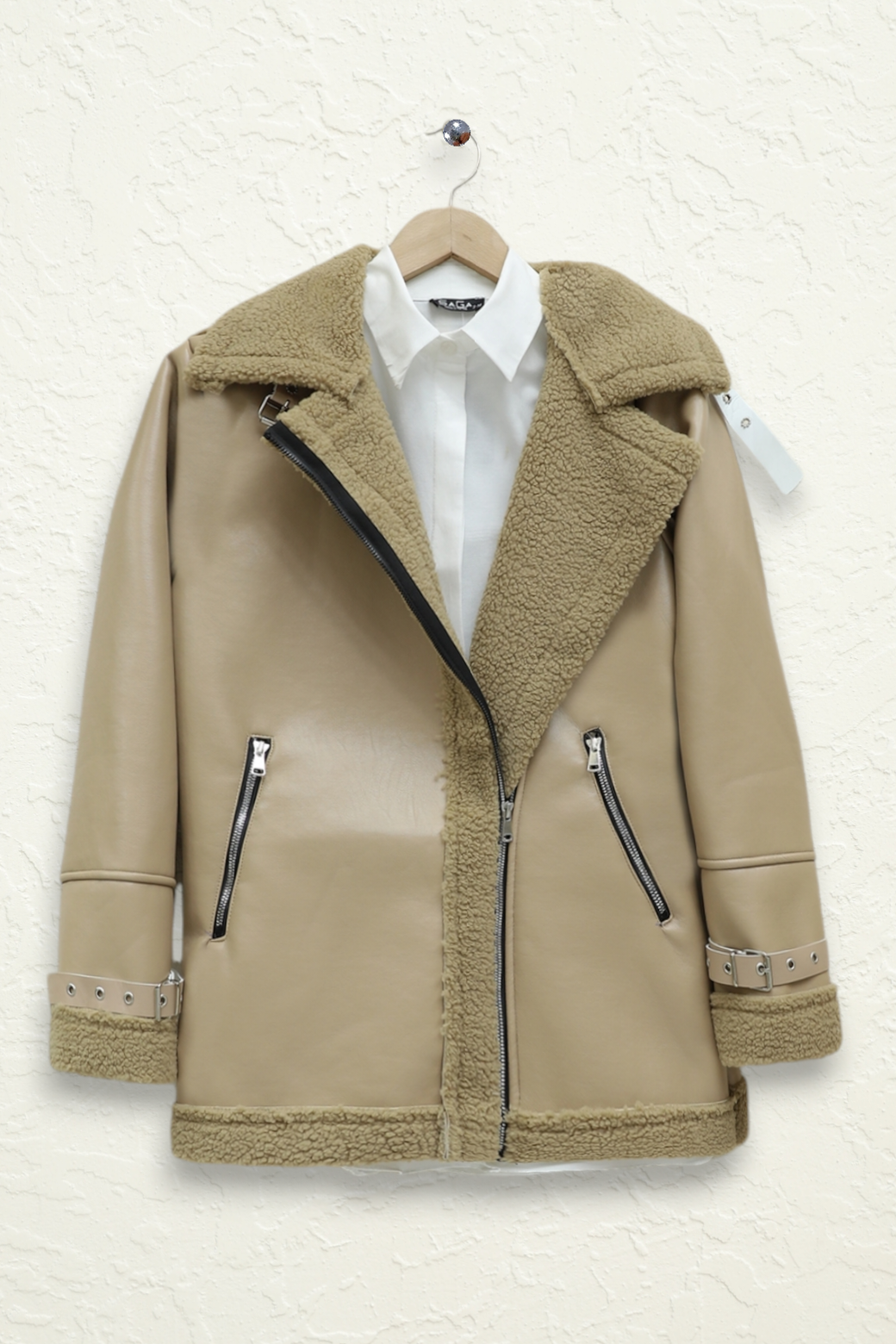 Podyumplus جاكيت جلدي داخلي من القطيفة بسحاب -بيج كاشف