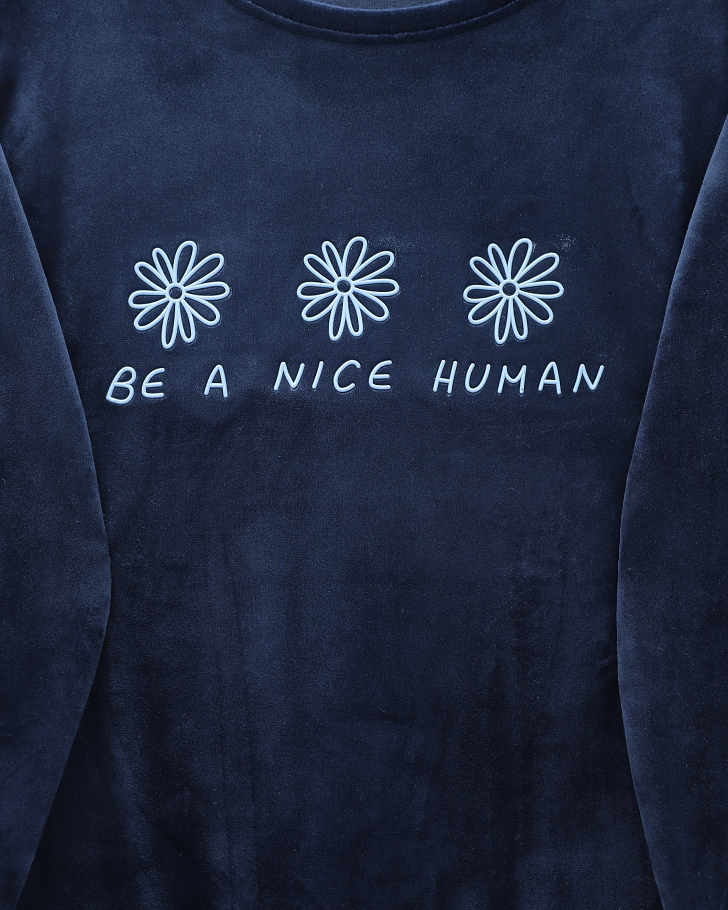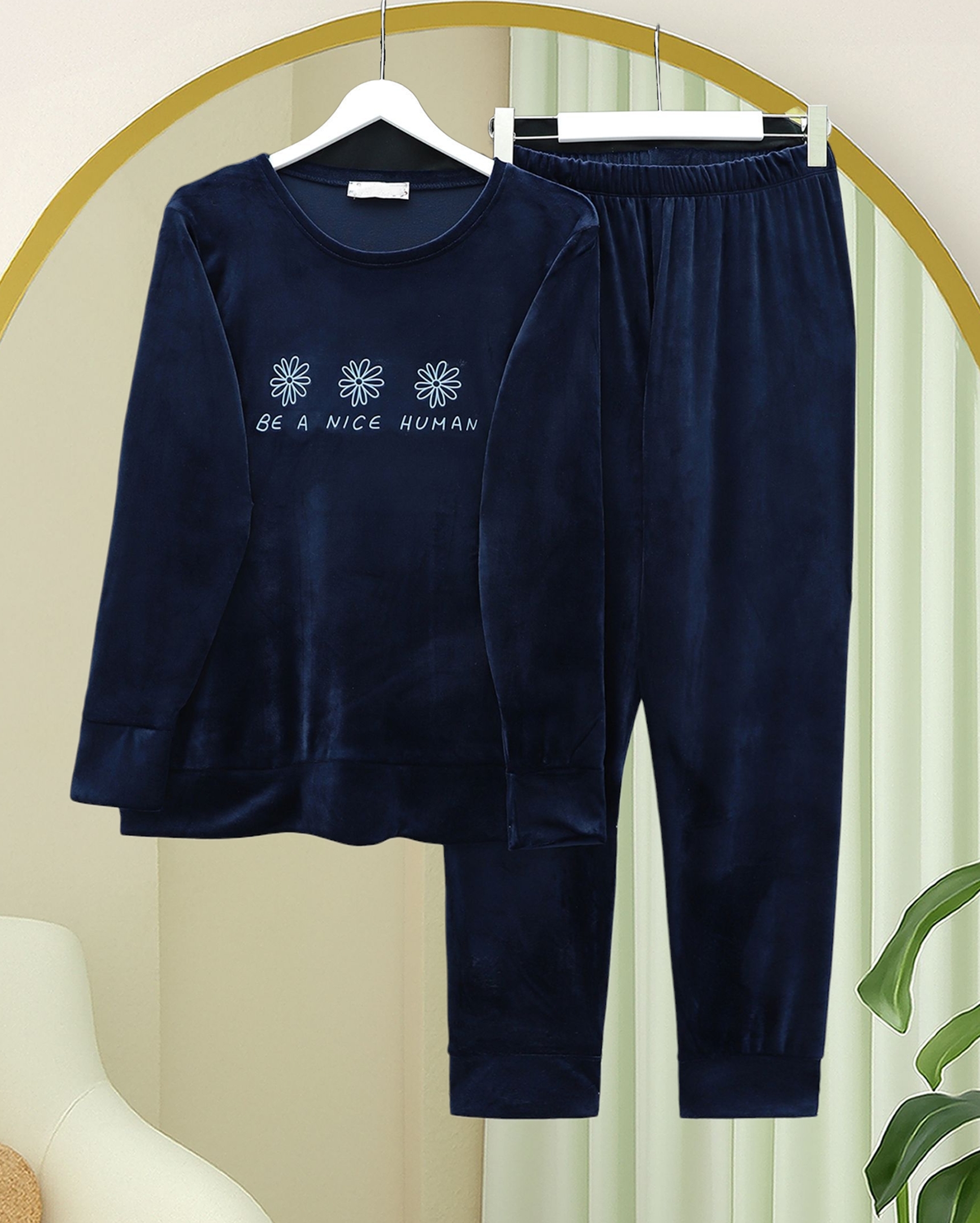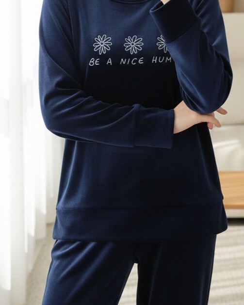 طقم بيجامة مخملية فرنسية مع نص منقوش -كحلي
