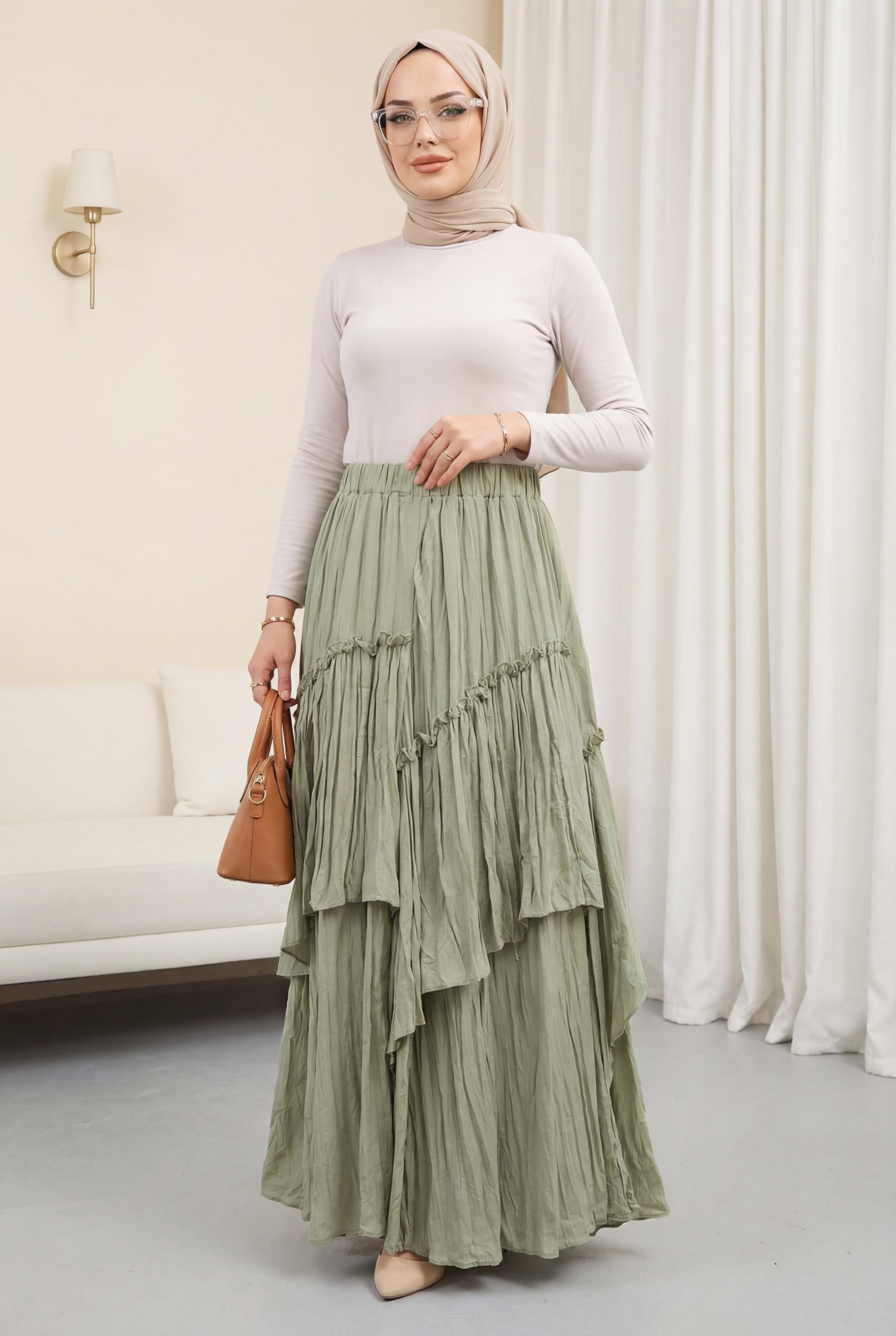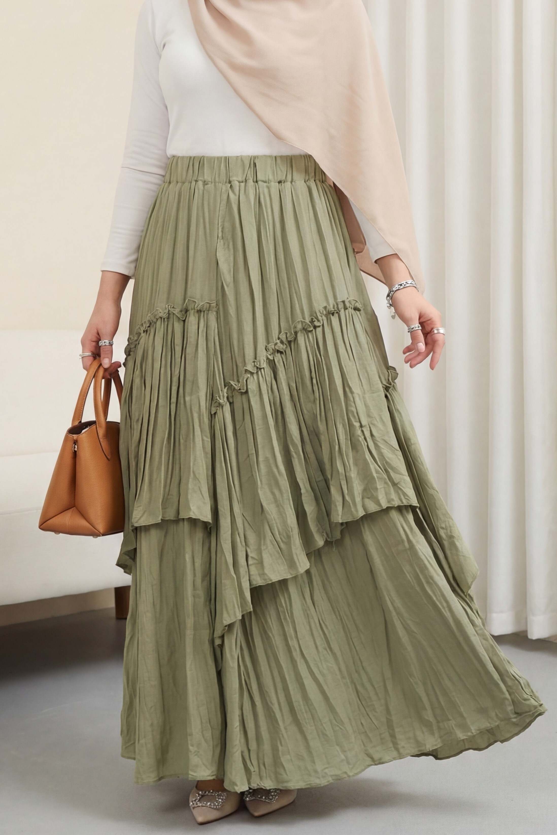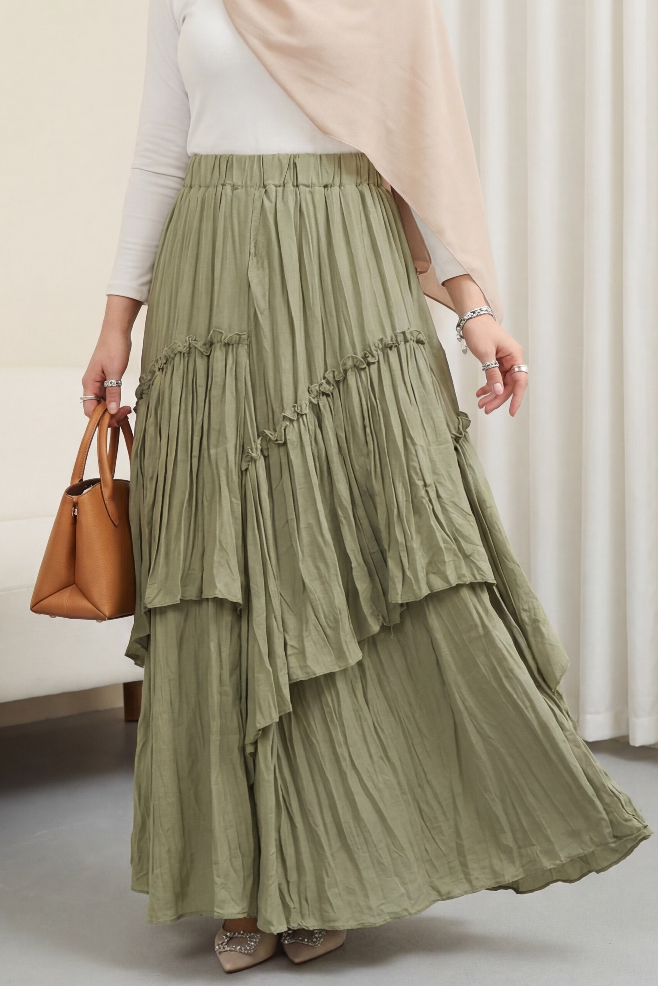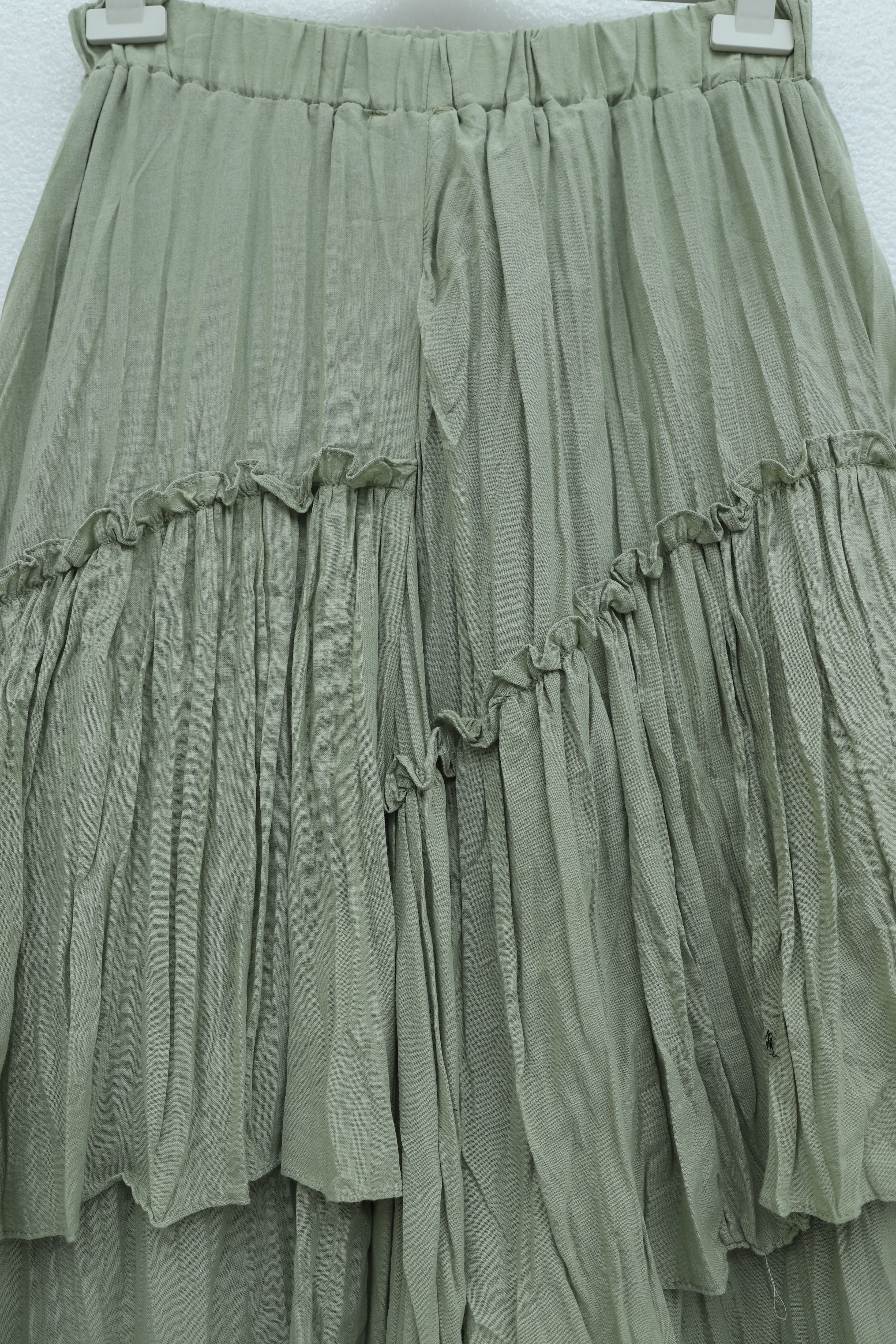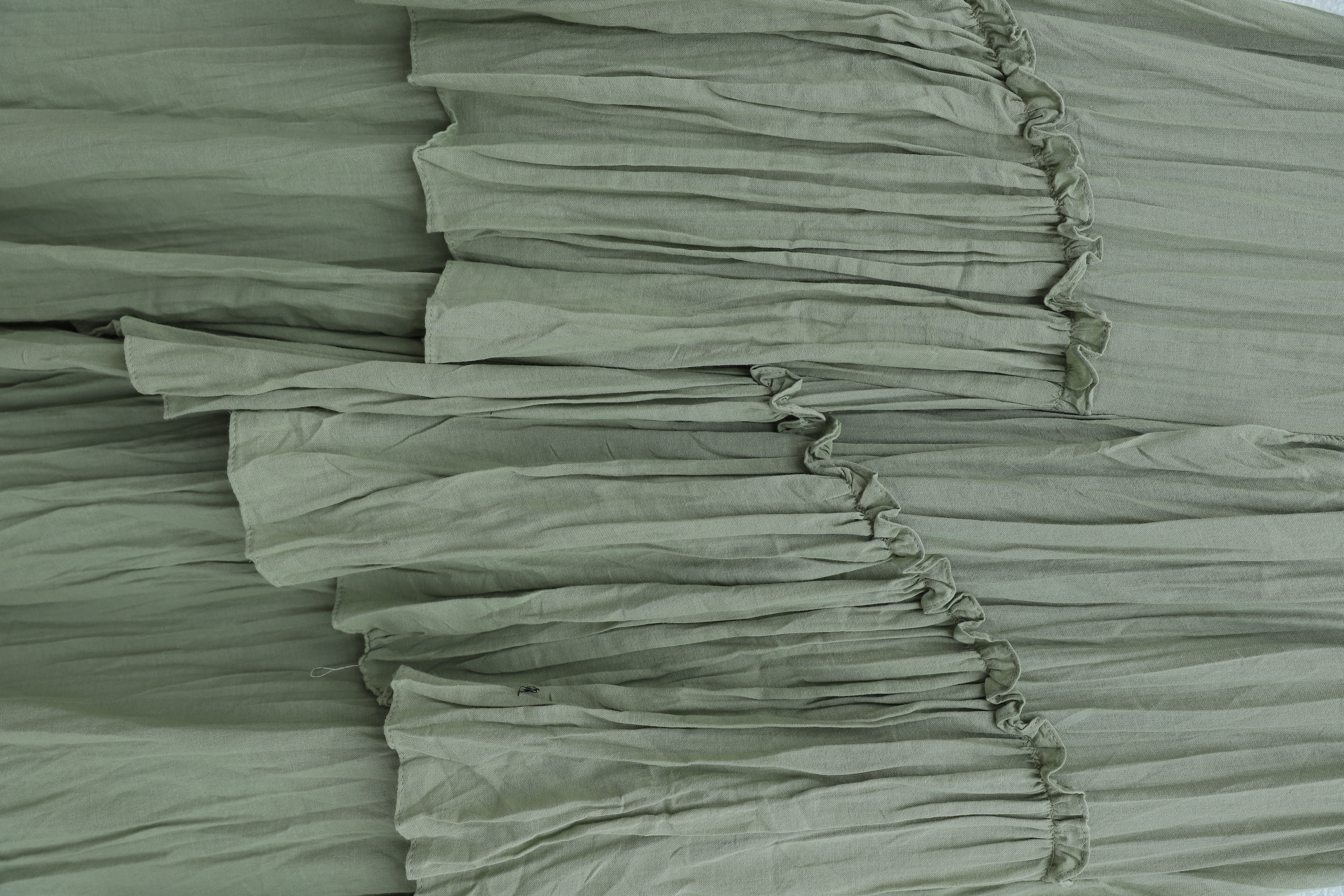 تنورة من طبقات من قماش الفوال الكتاني بخصر مطاطي -كاجلا جرين