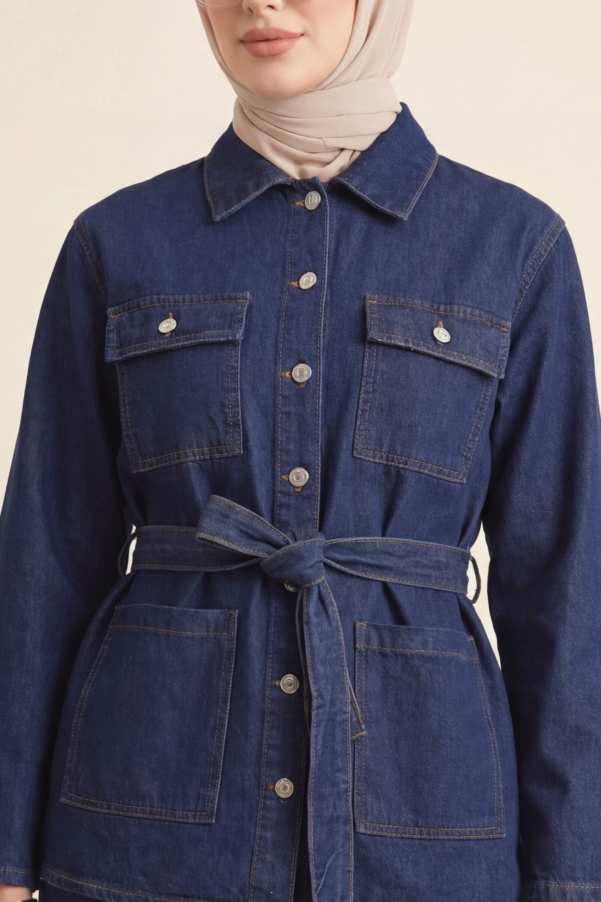 بدلة جينز بحزام على الخصر وجيوب وأزرار أمامية -كحلي