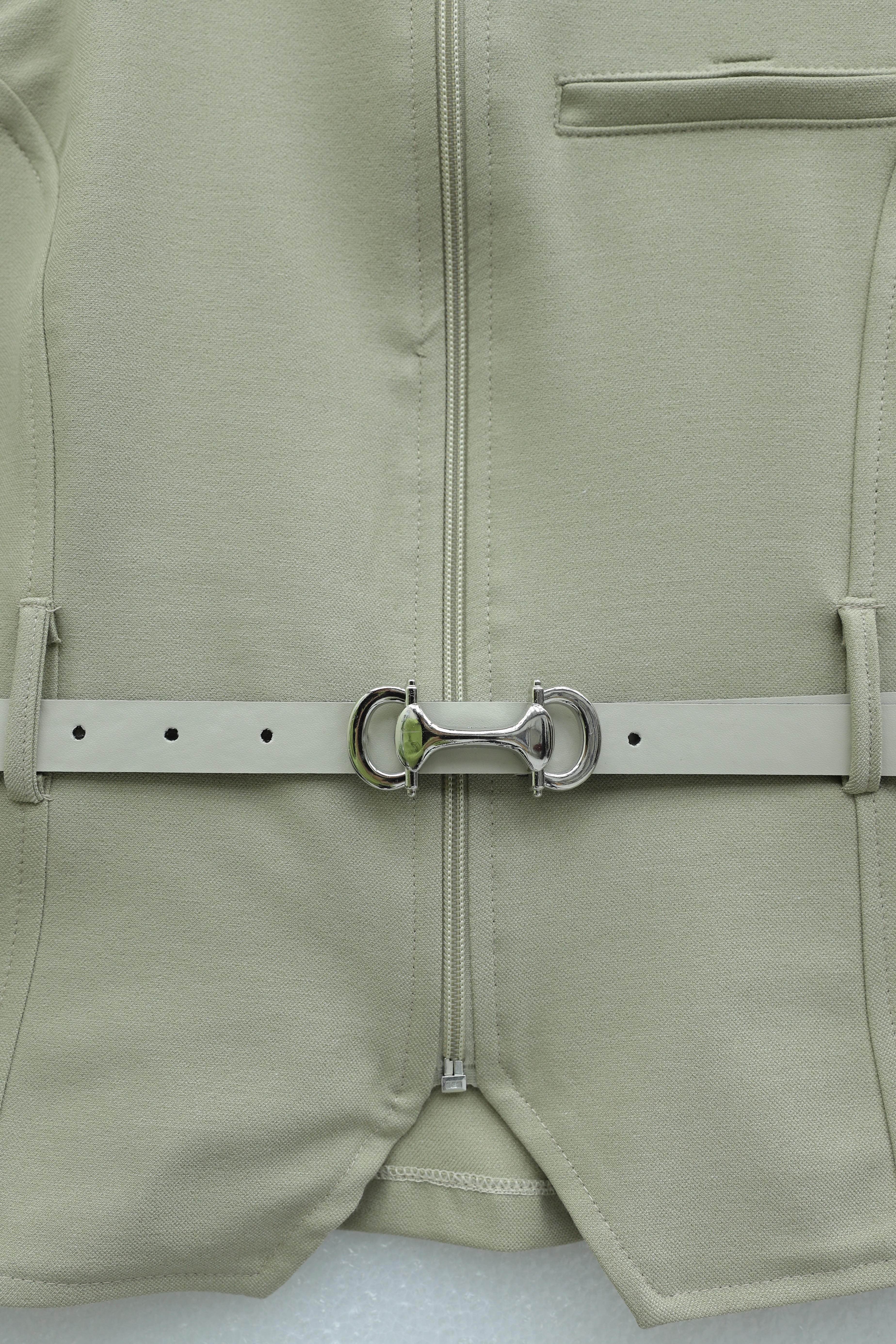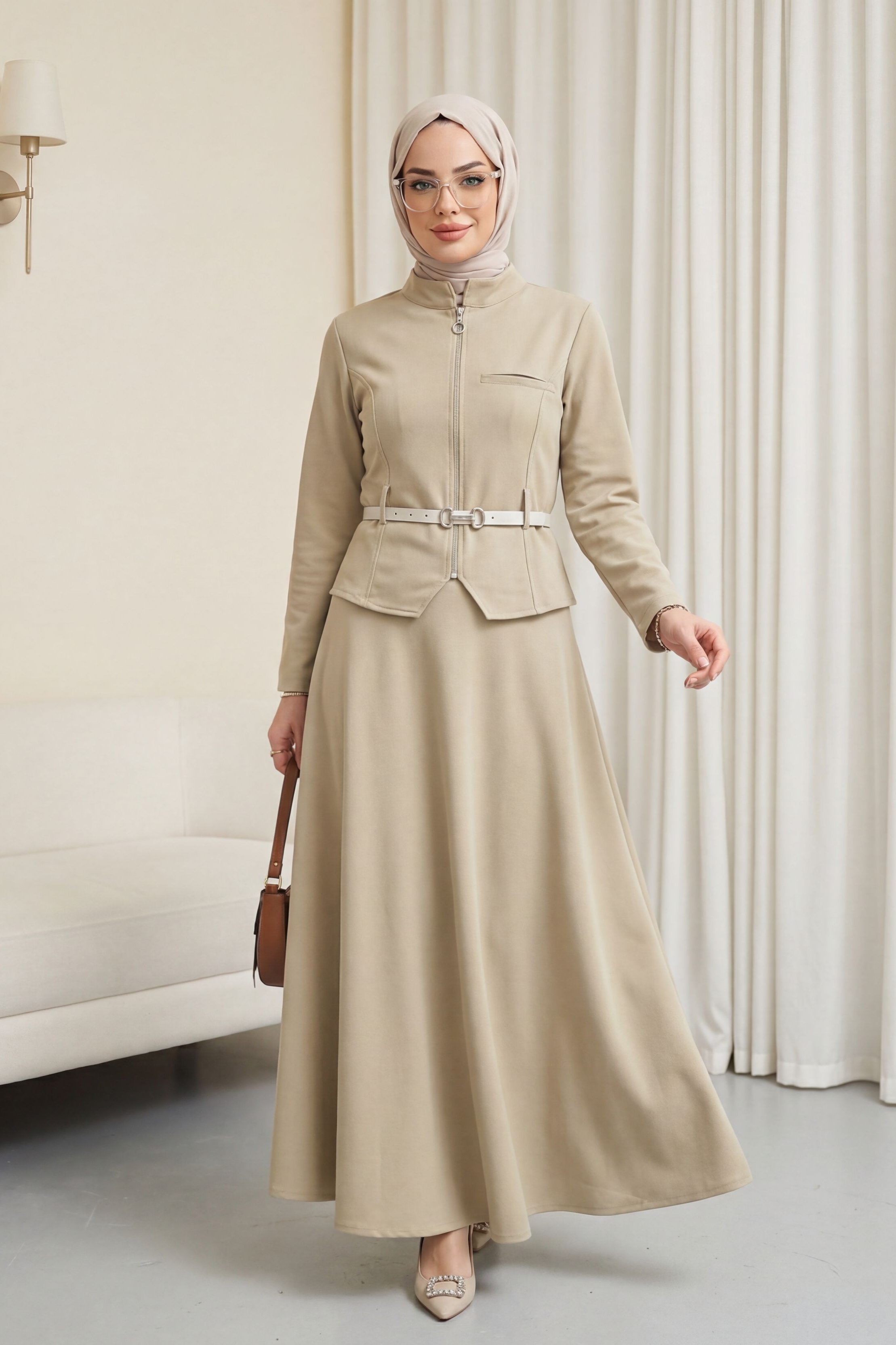 طقم تنورة مائلة بسحاب أمامي، وجيب، وحزام عند الخصر -حجر