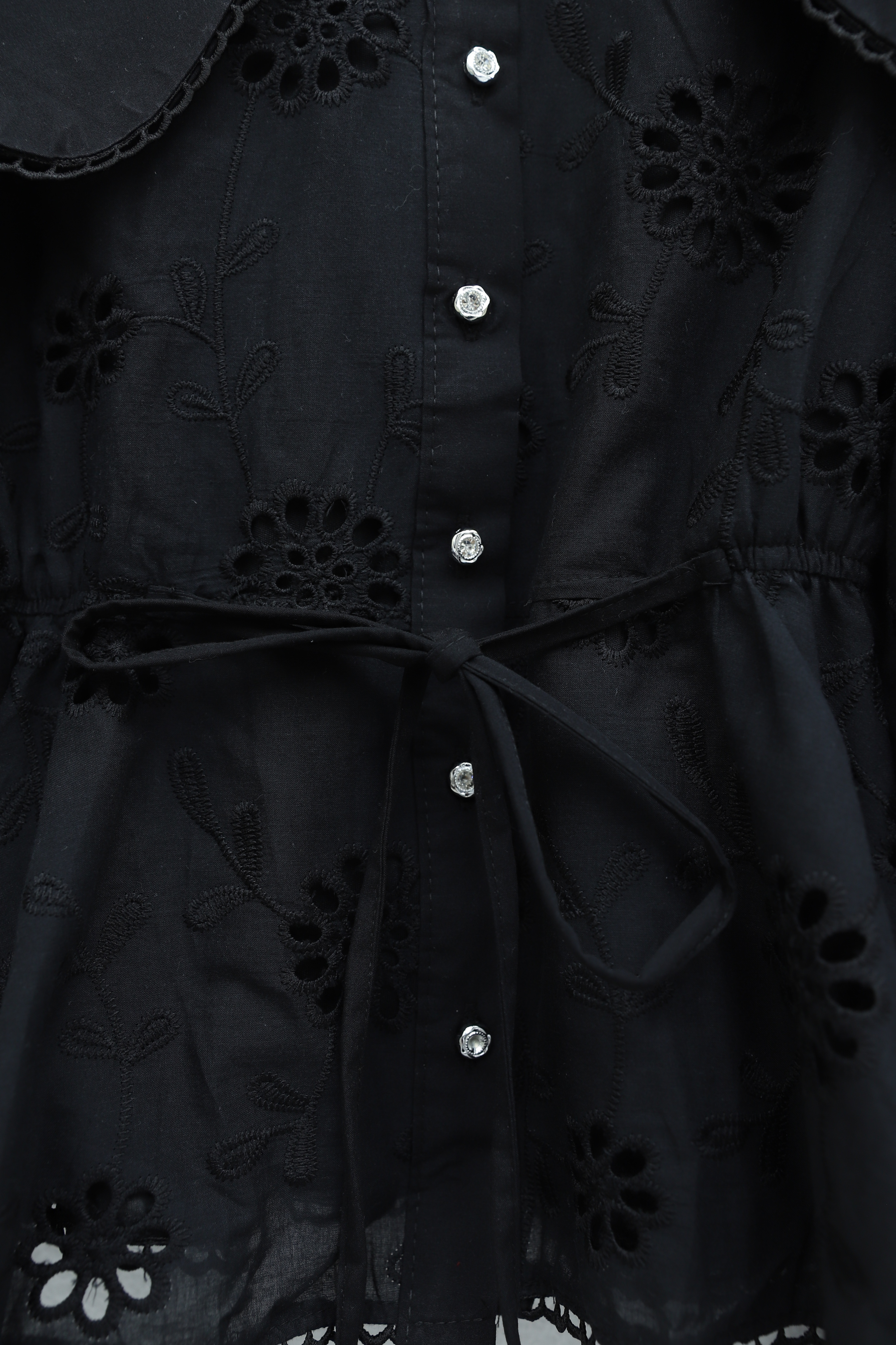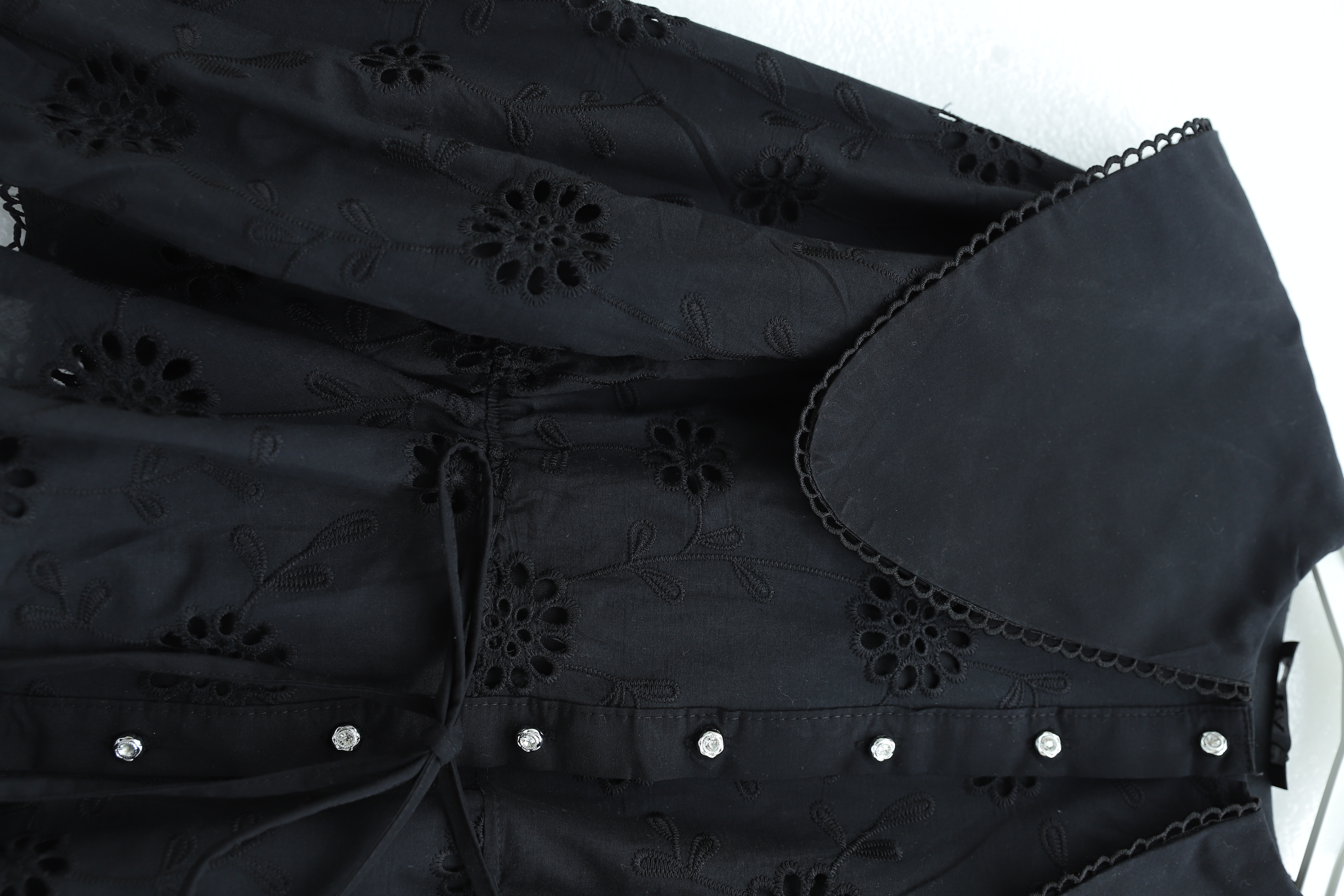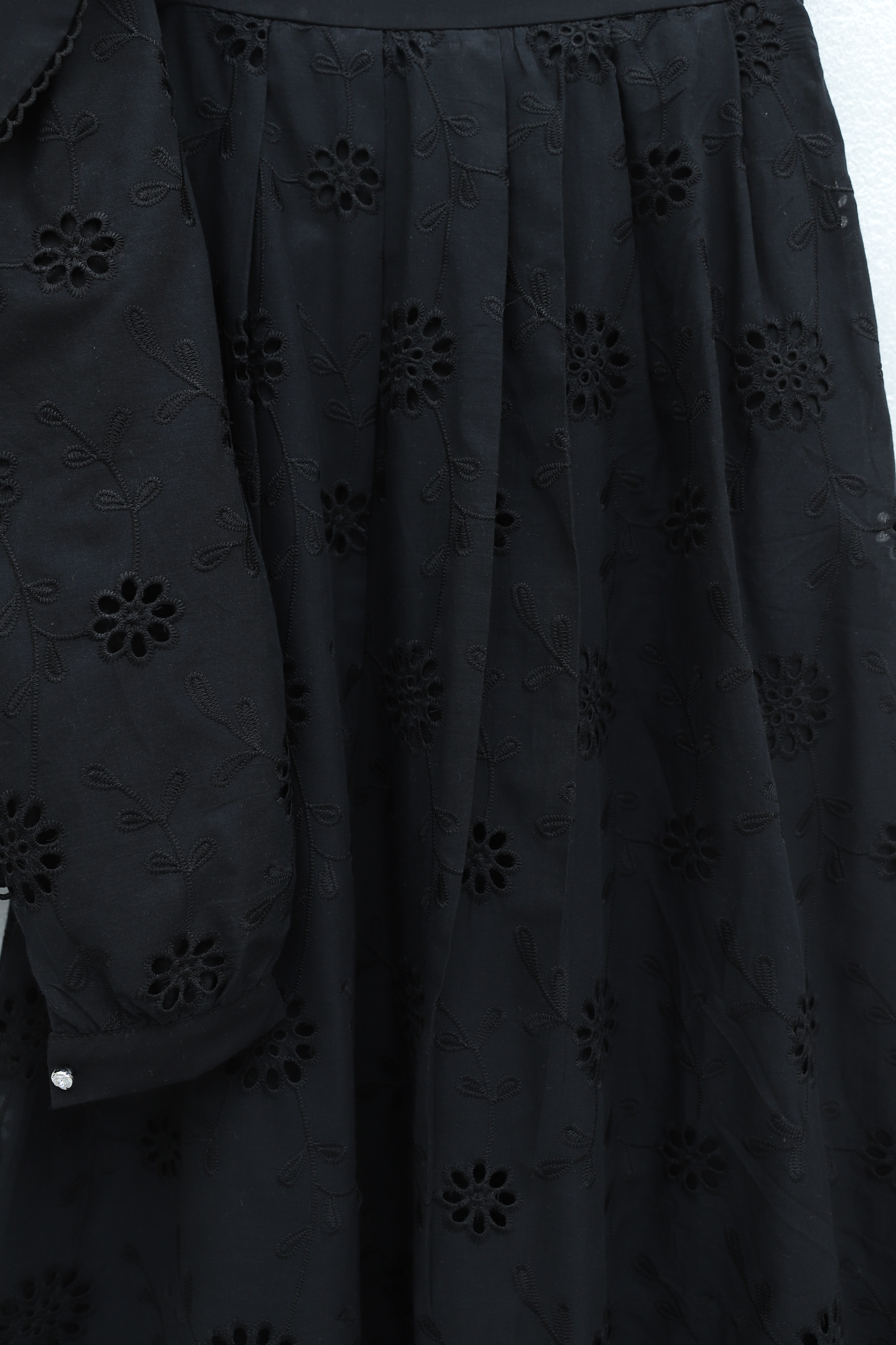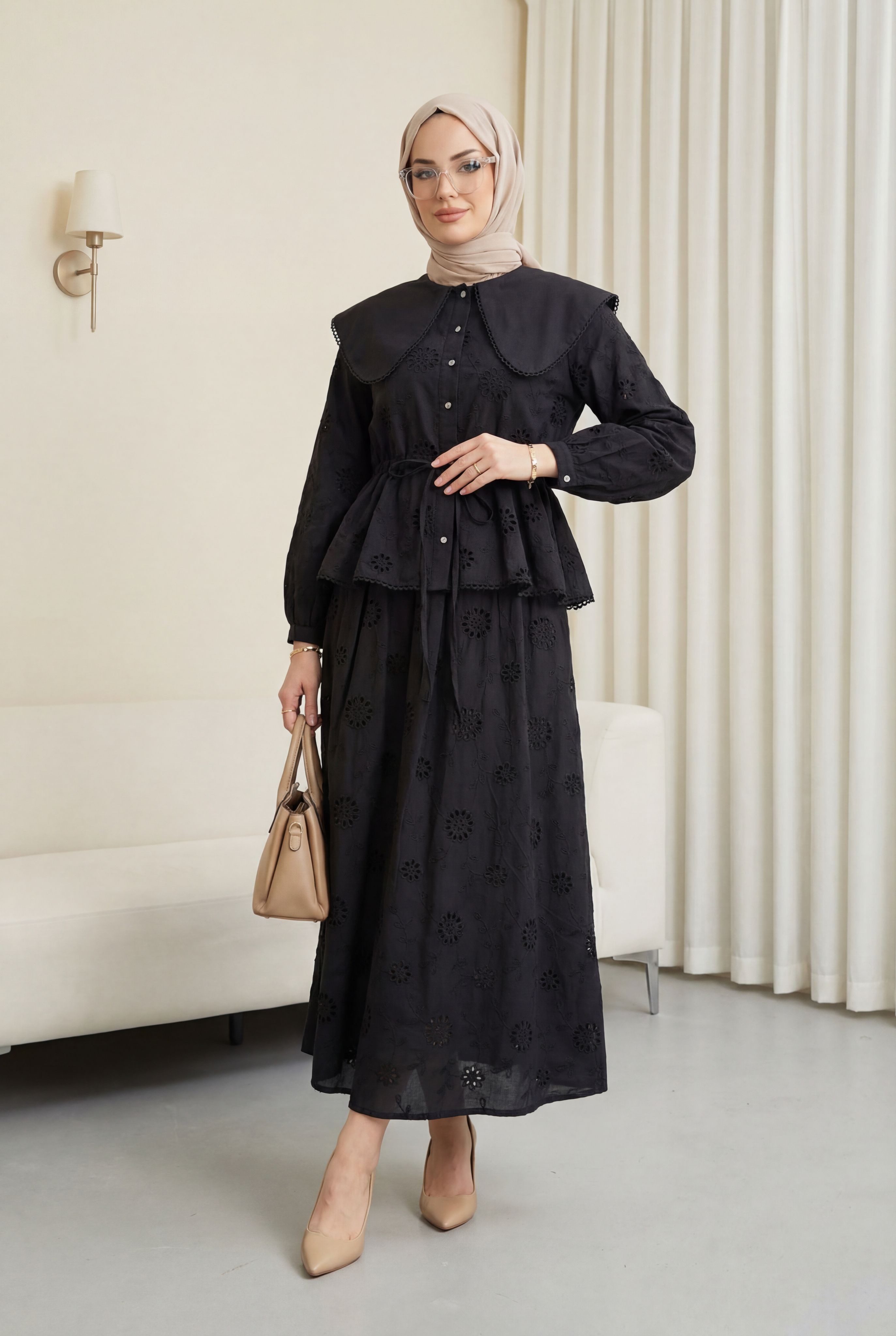 بدلة من قماش المودال بأكمام مطاطية، وأزرار أمامية مزينة باللؤلؤ، وتنورة -بترولي