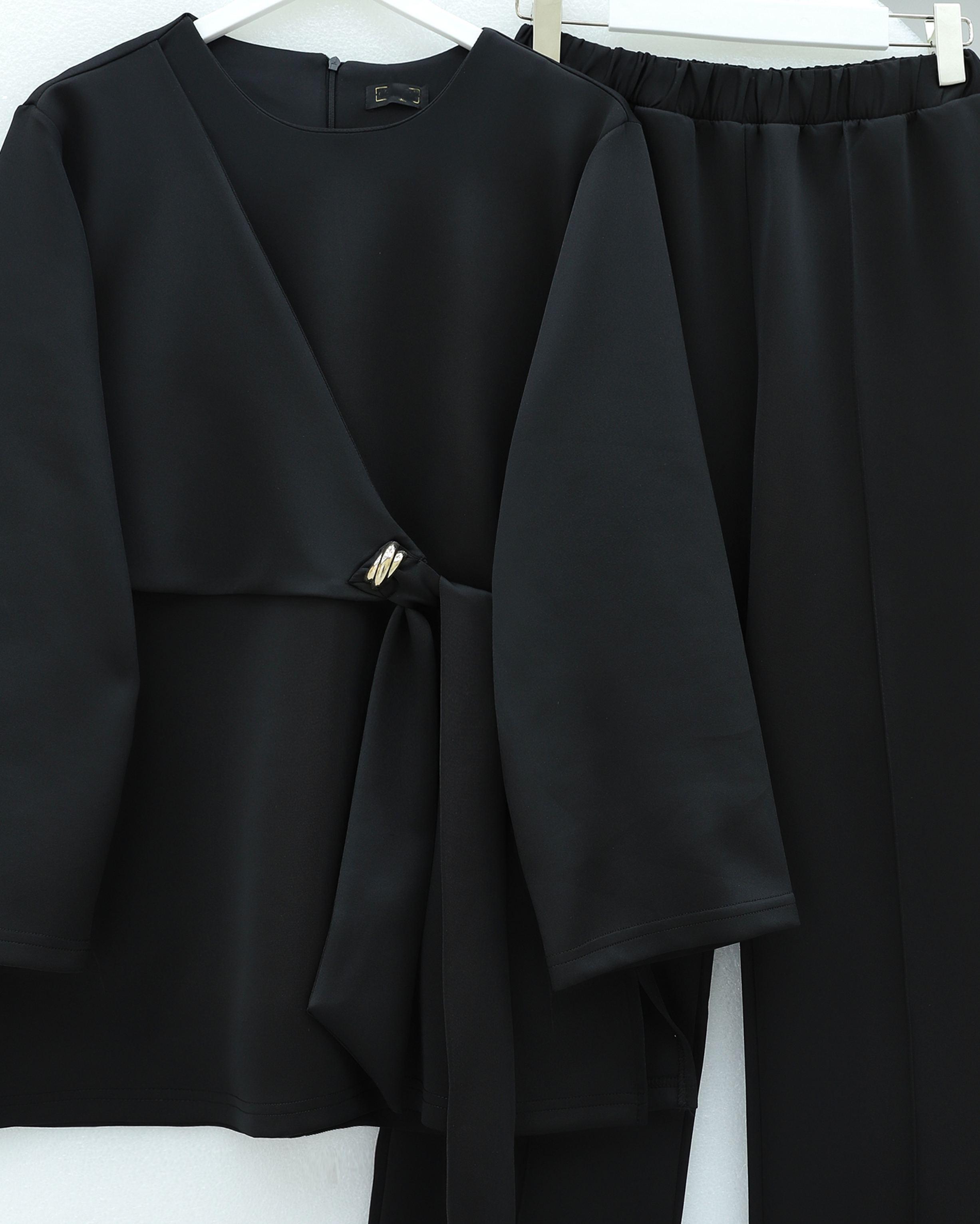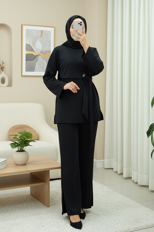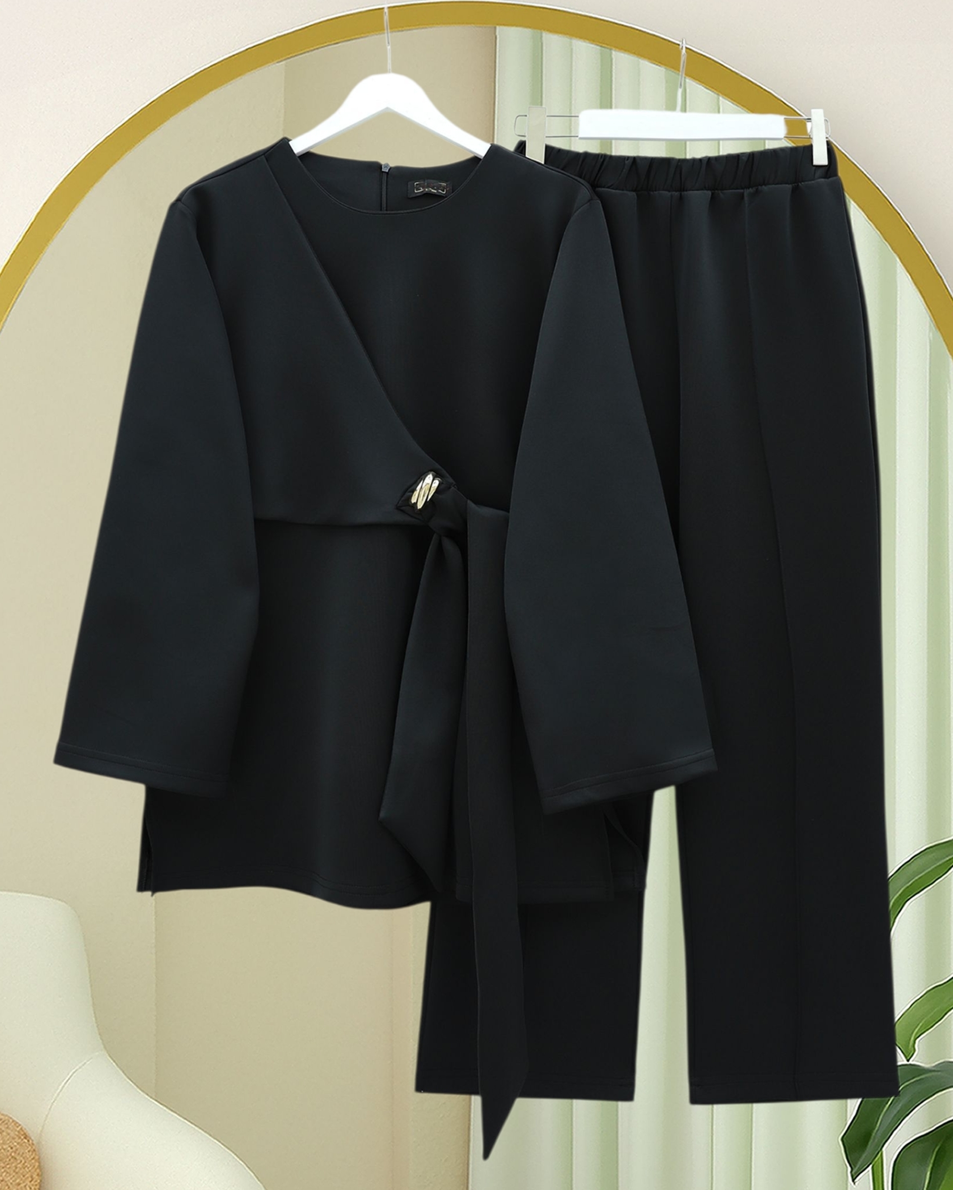 طقم أويشو بفتحة جانبية، وخصر برباط، وأكمام قابلة للطي -لون مدخن