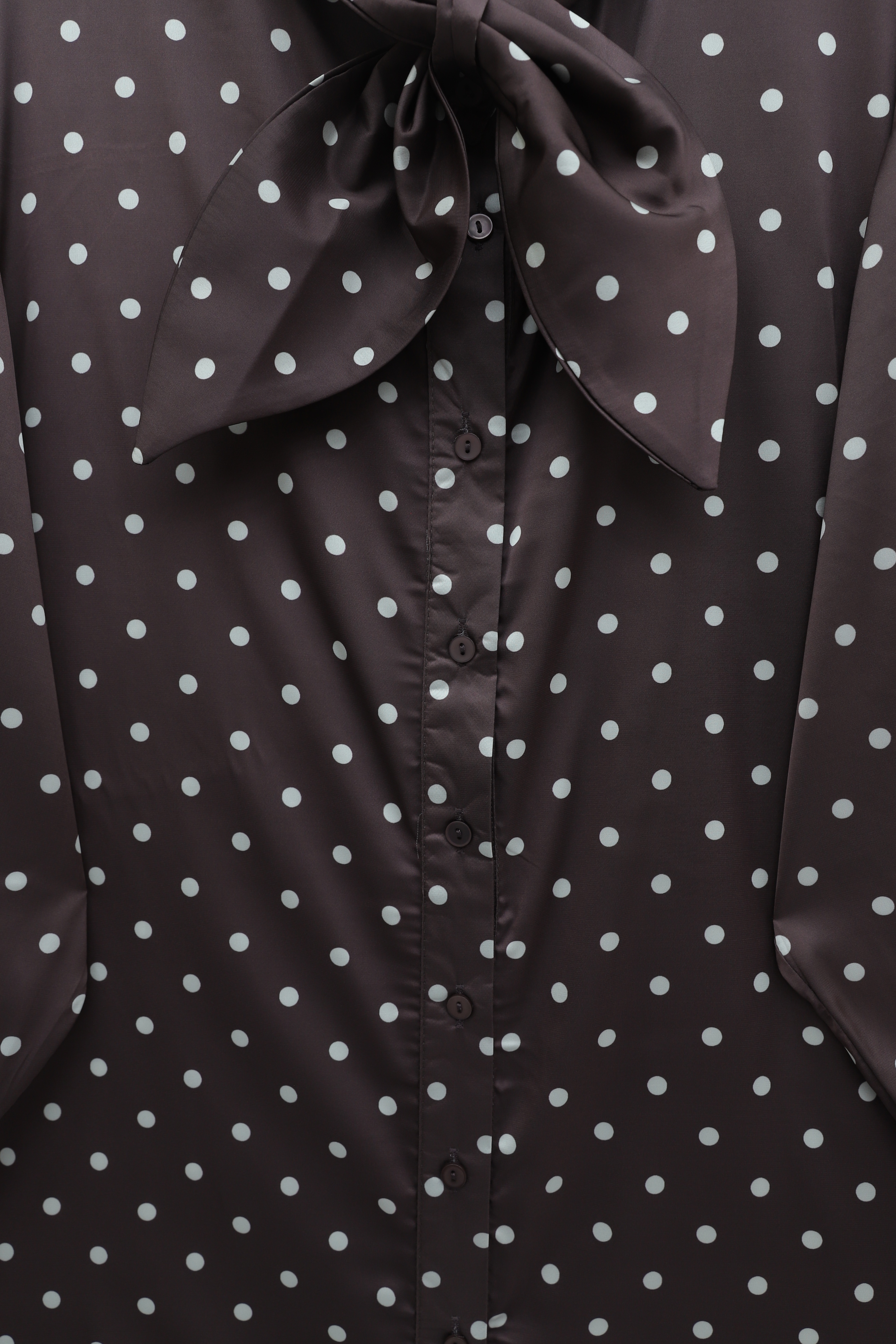 Polka Dot Satin Shirt with Scarf Collar and Full -Dark Coffee