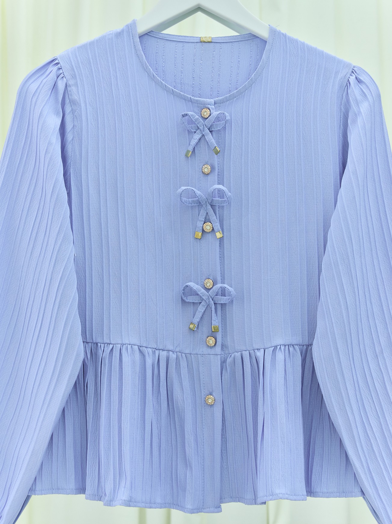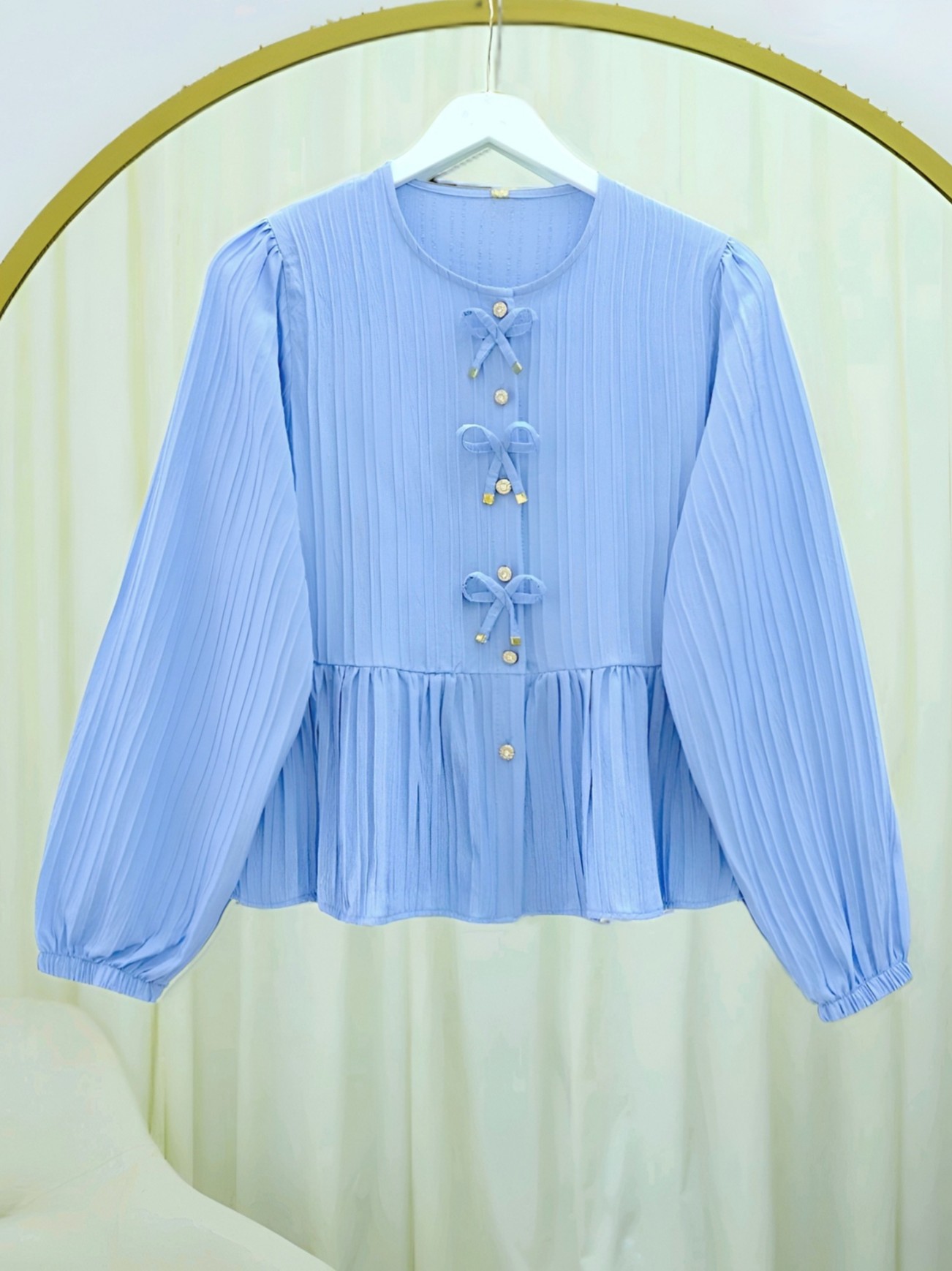 Buttoned Blouse with Elastic Sleeves and Bow Detail on the Front -Blue