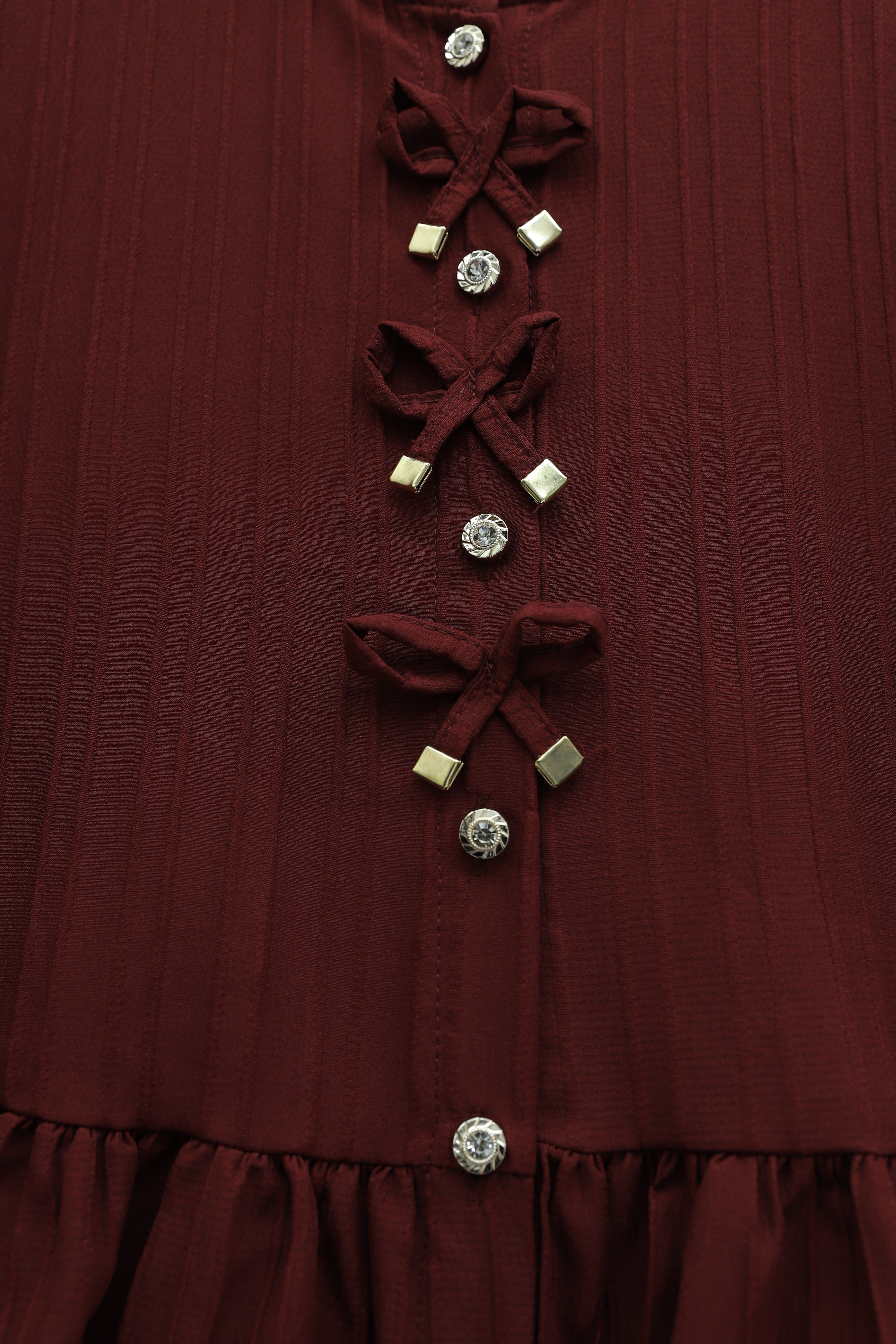 Buttoned Blouse with Elastic Sleeves and Bow Detail on the Front -Maroon