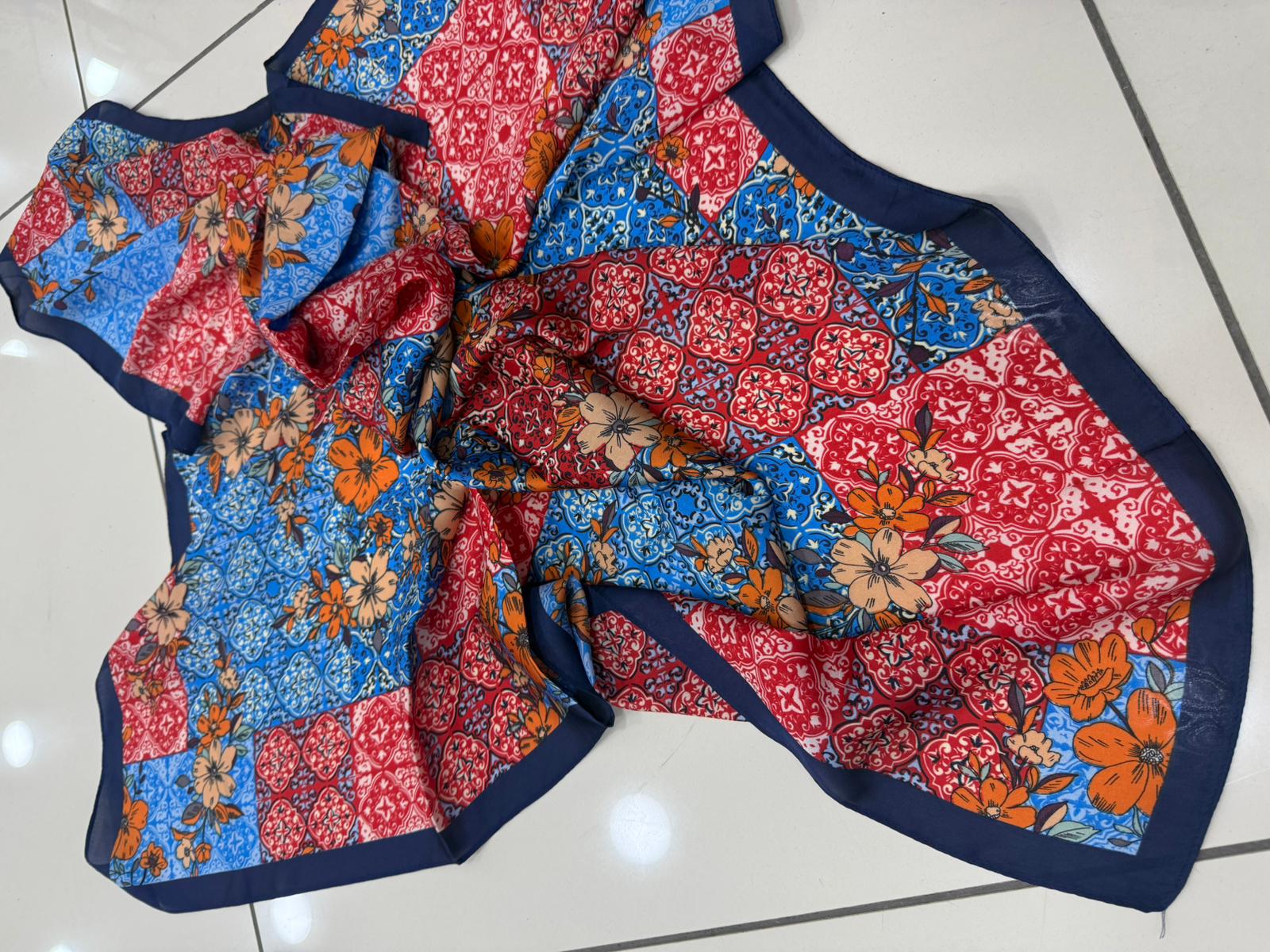 14930 Navy Blue Floral Patterned Bandana Scarf 90x90 cm
