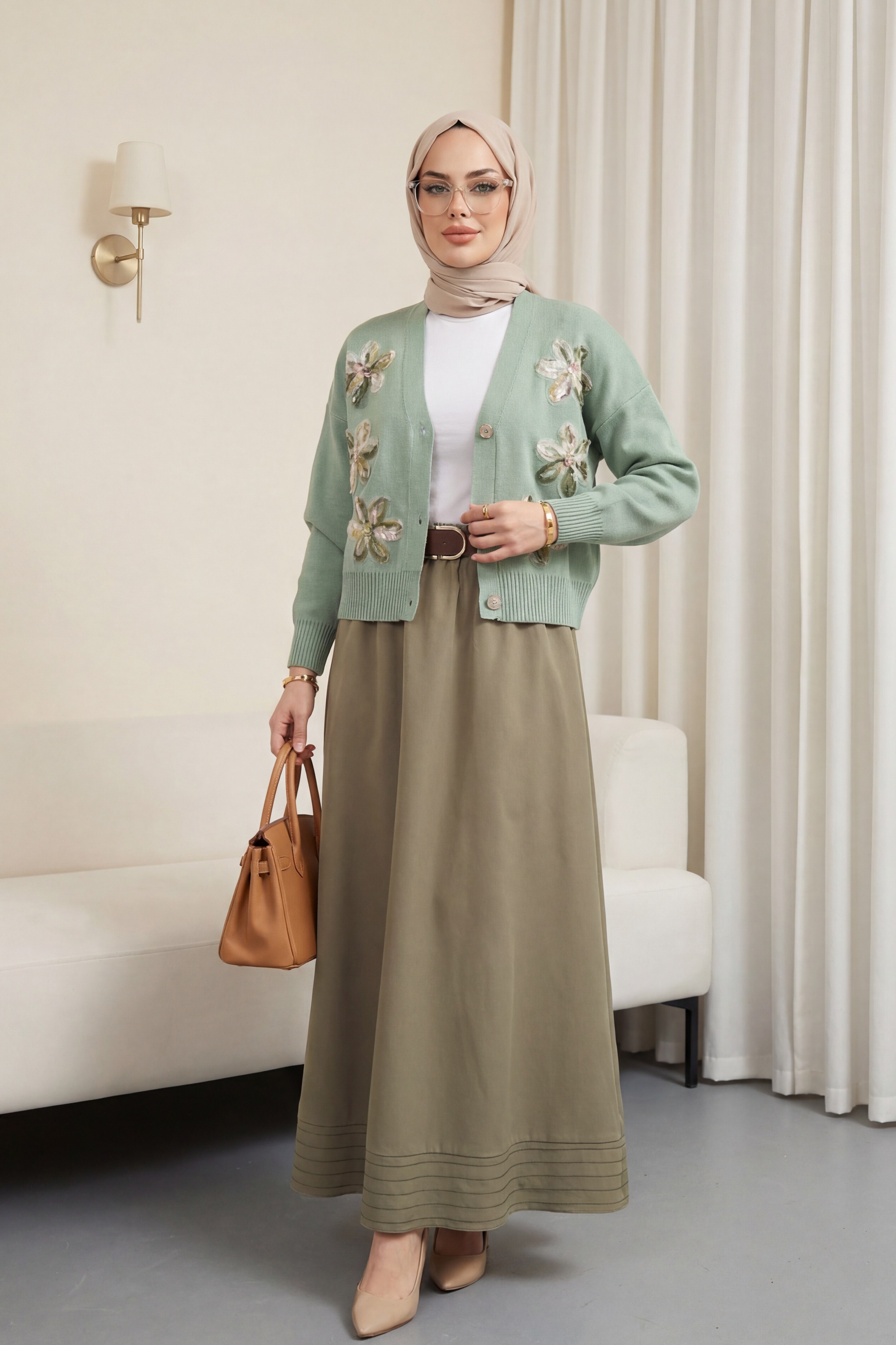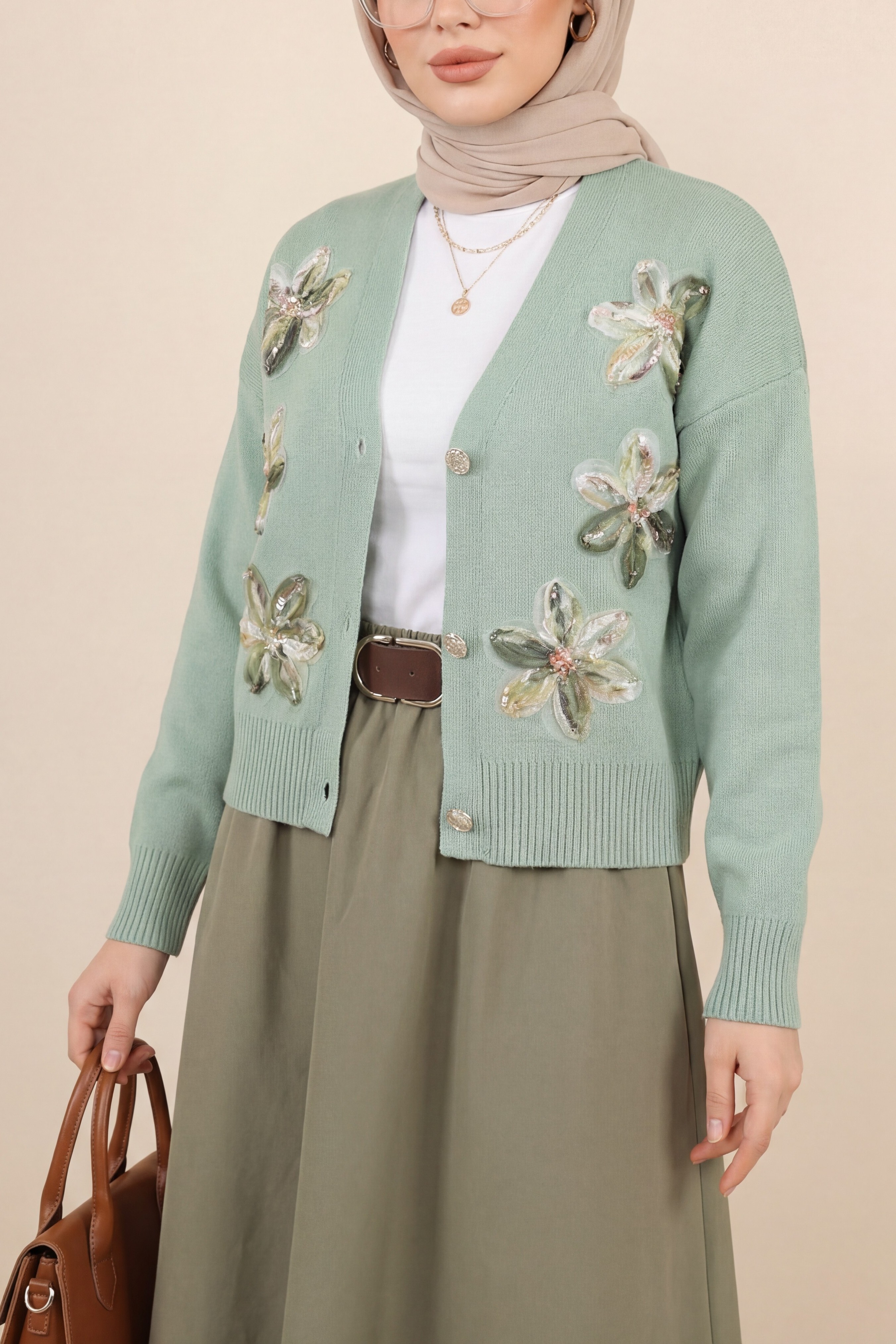 Buttoned knitted cardigan with sequin and floral details on the front. -Sea green