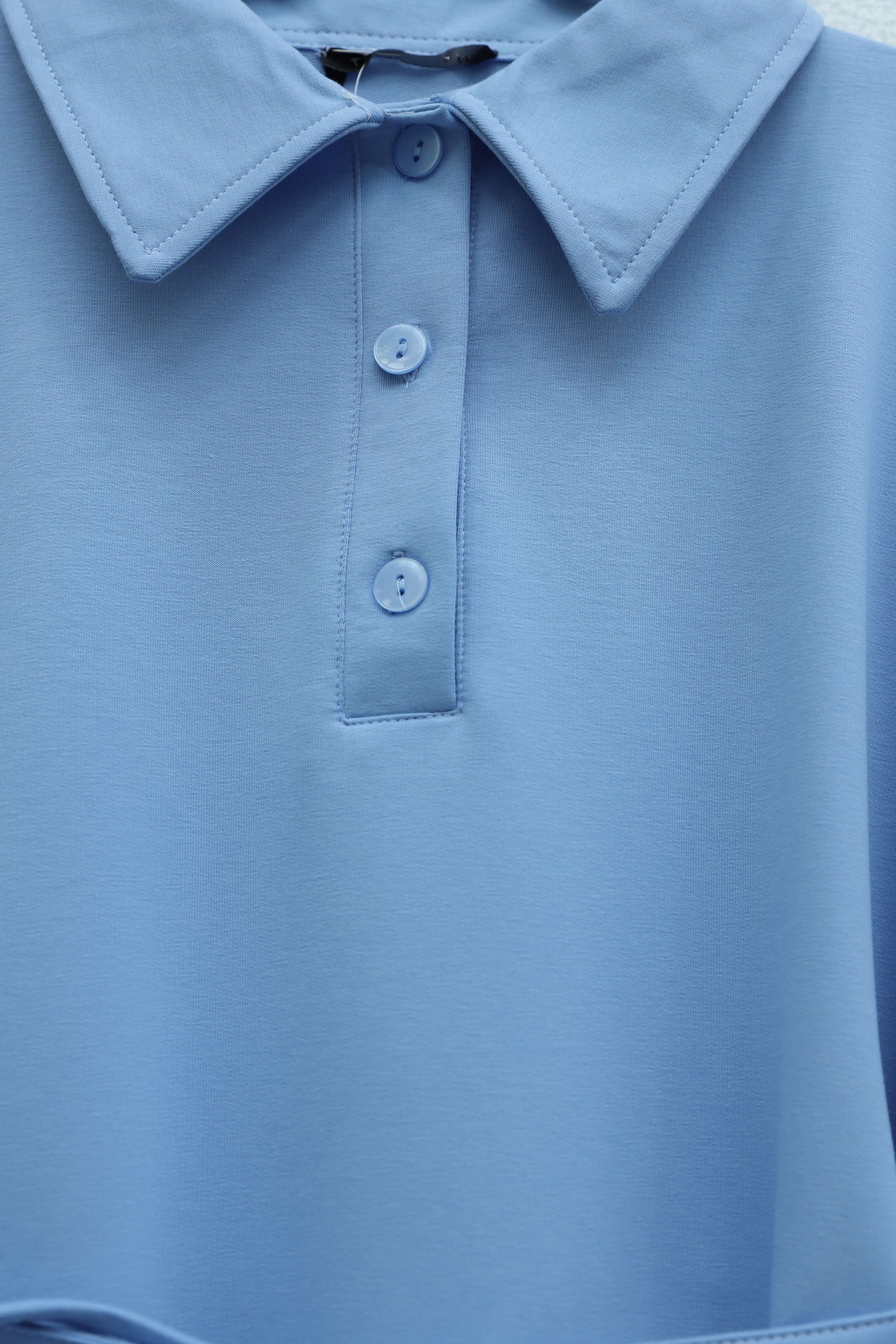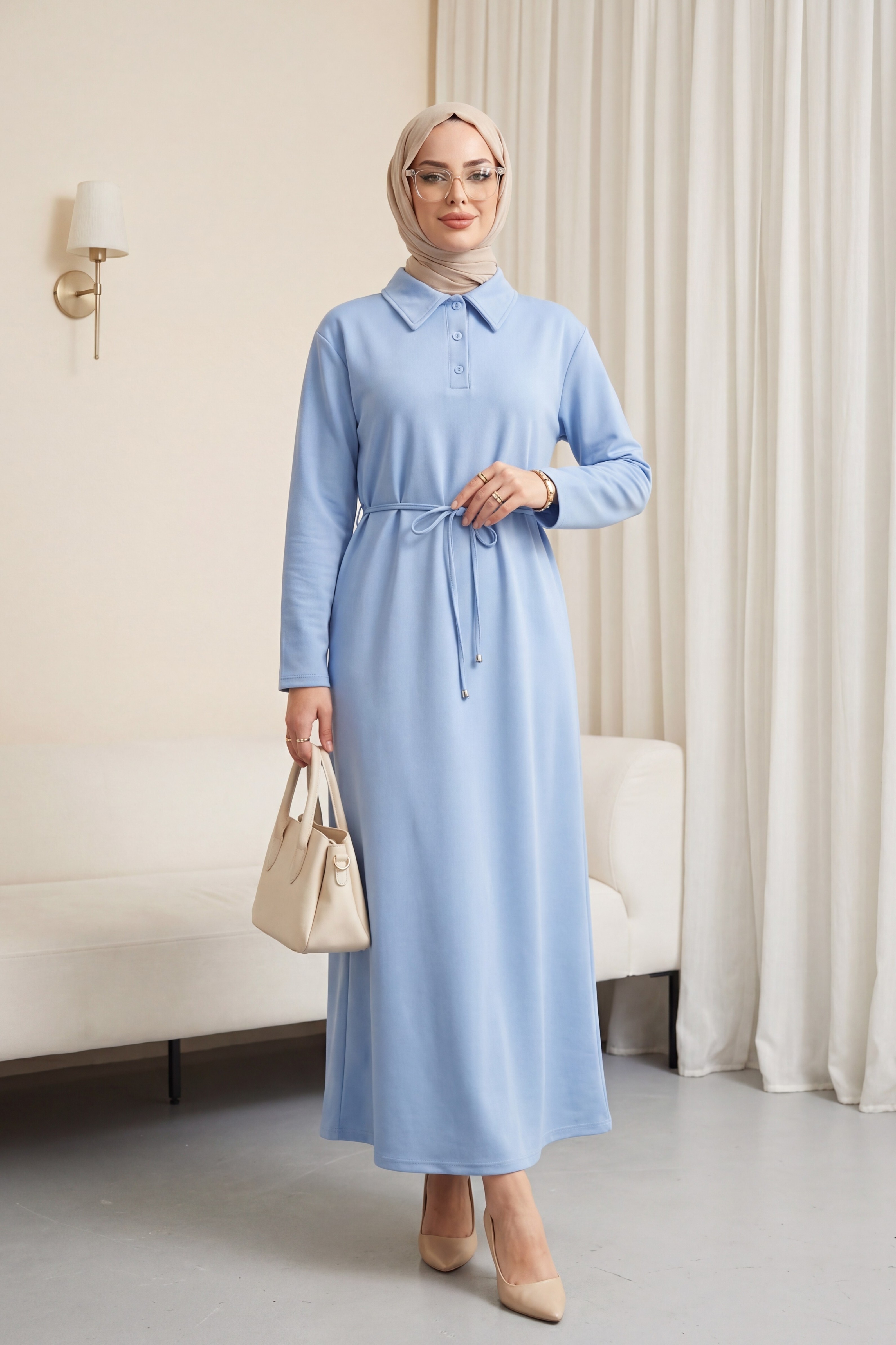 Collared, Buttoned, Tie-Waist Cotton Dress -Light blue