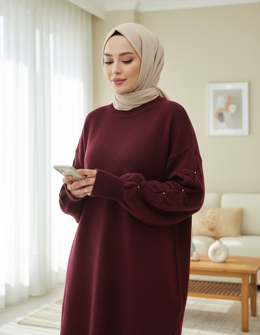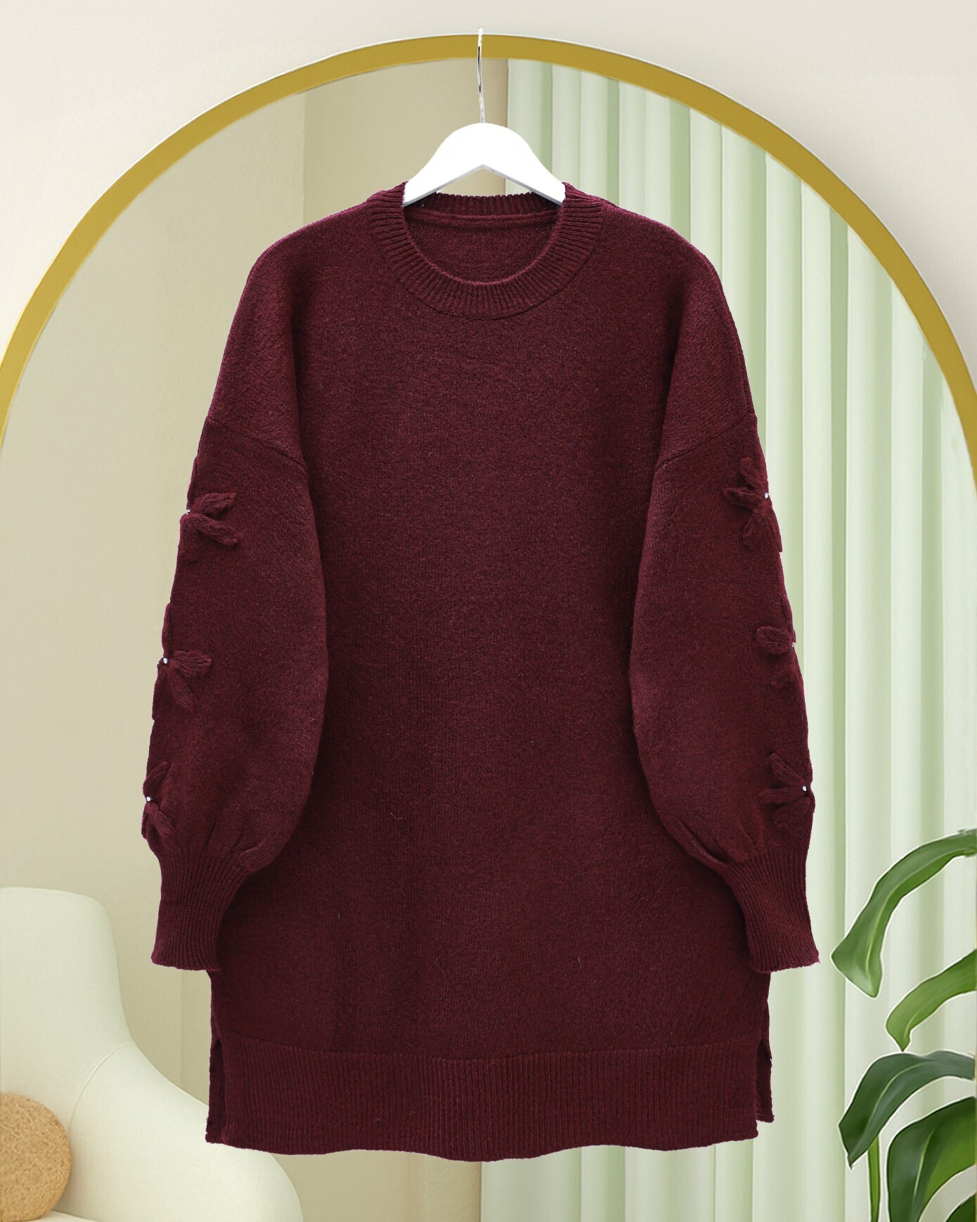 Round Neck Soft Knit Sweater with Flower Detail on the Sleeves -Maroon