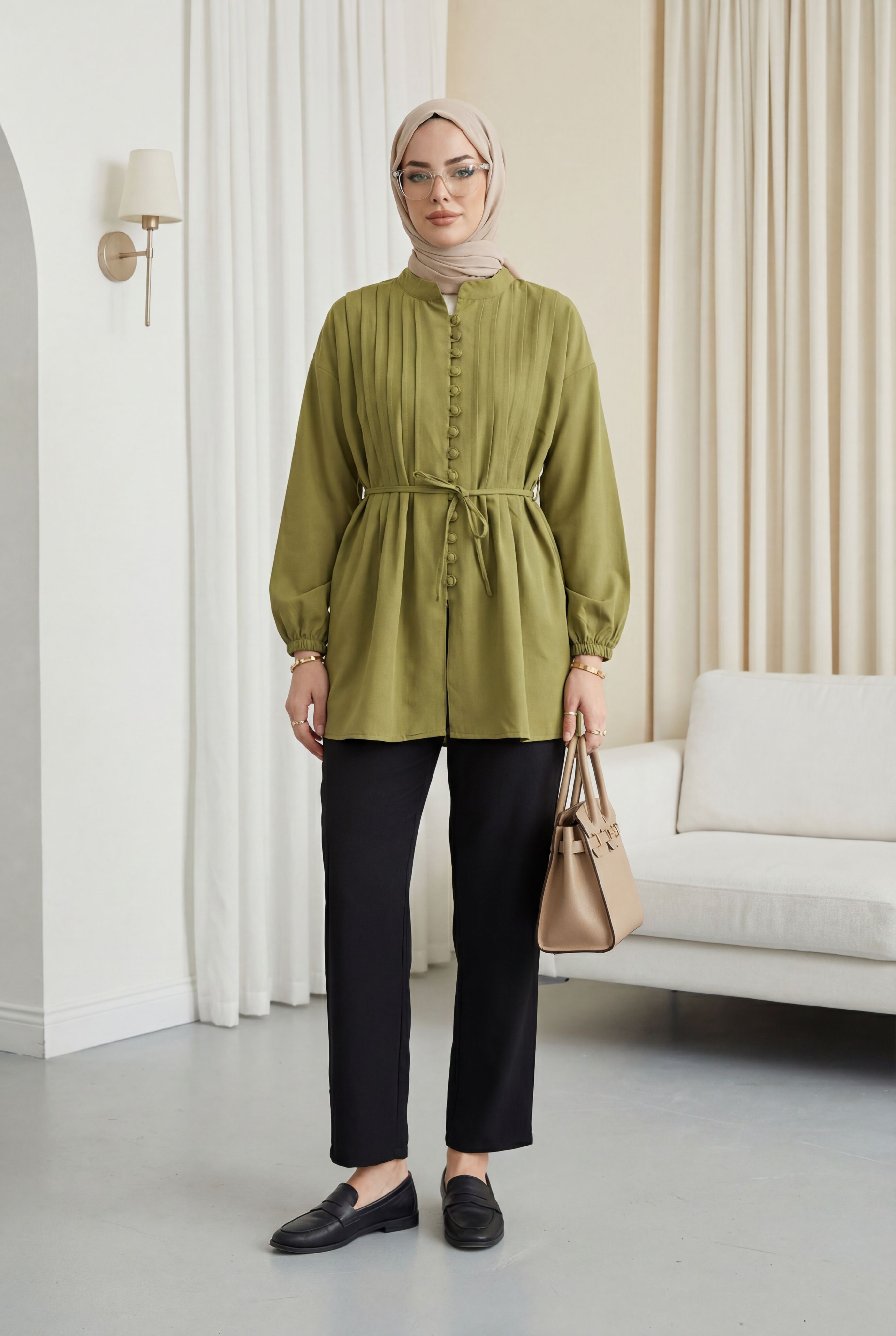 Poplin Shirt with Belted, Elasticated Cuffs, Button Front, and Fold Detail -Khaki