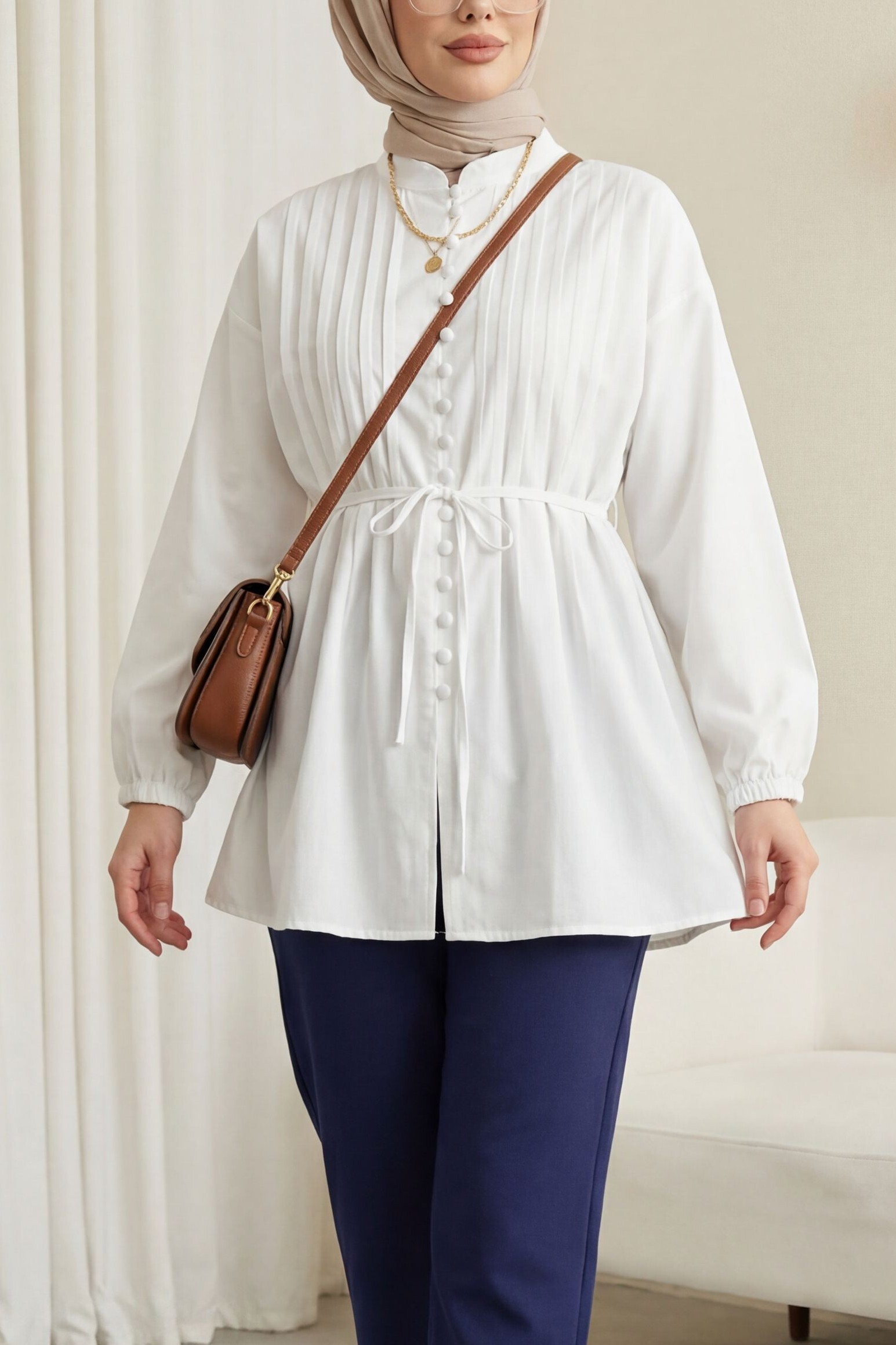 Cupra Shirt with Double Buckle Elastic Belt and Button Front -White