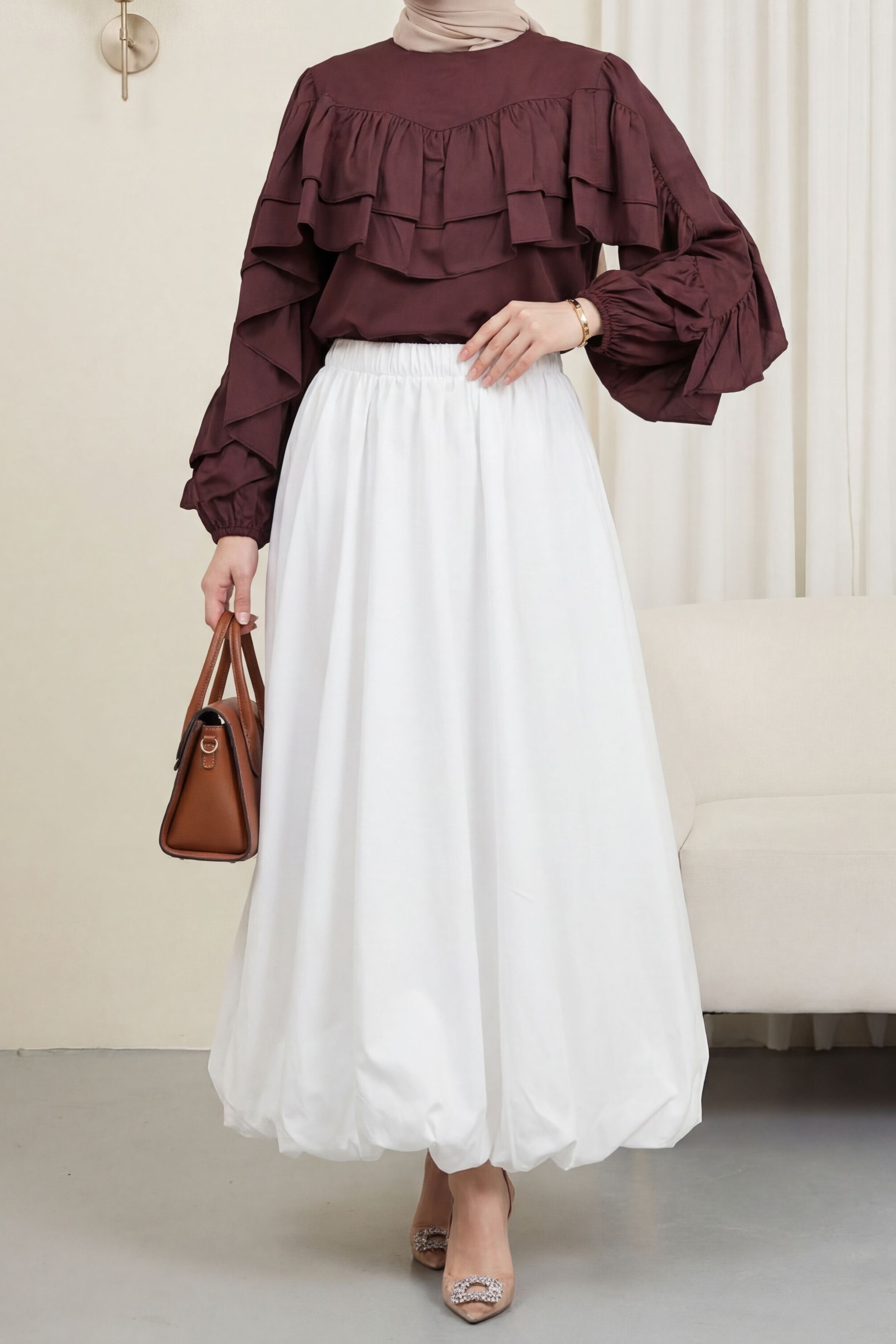 Lined Poplin Balloon Skirt with Elastic Waistband -Brown