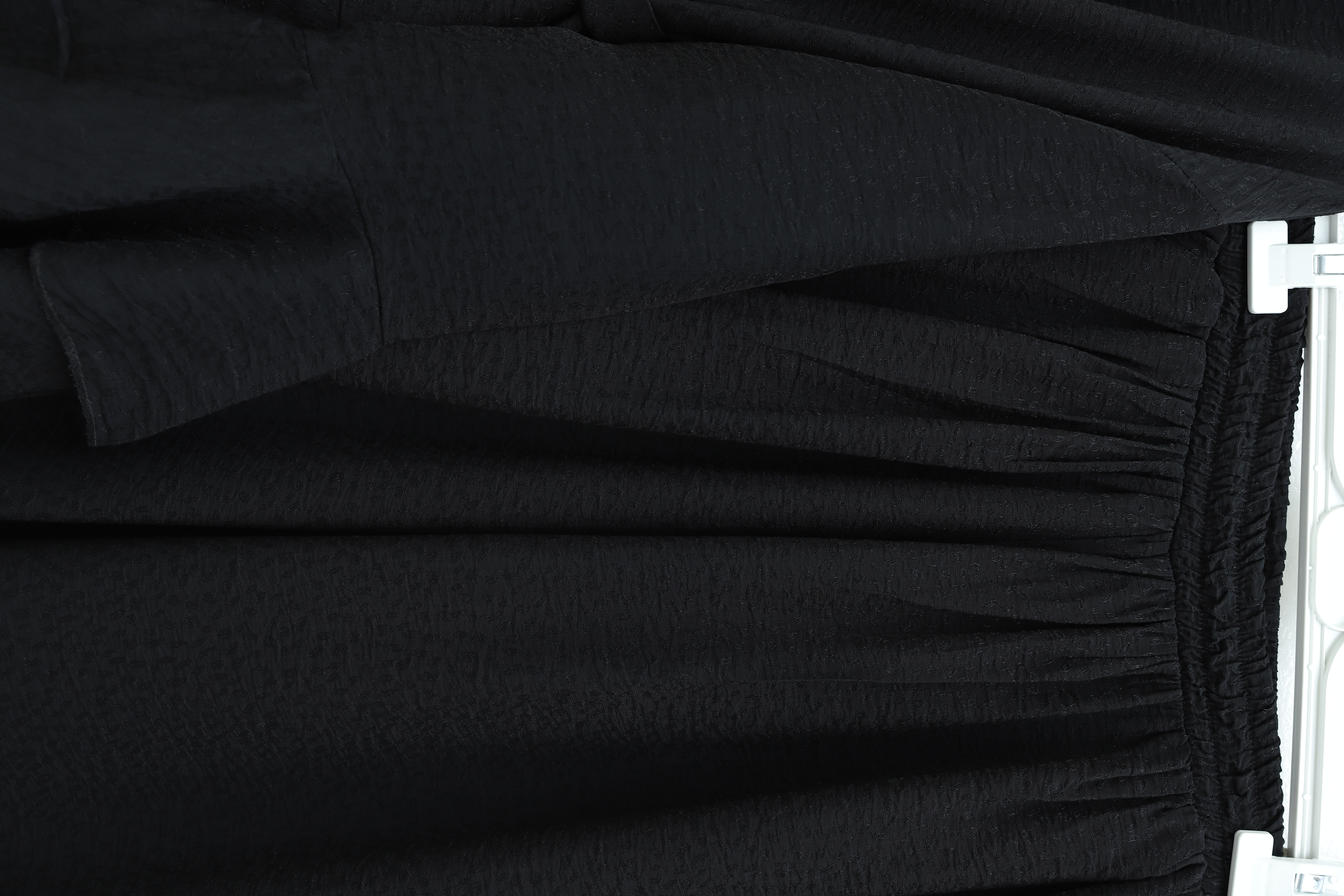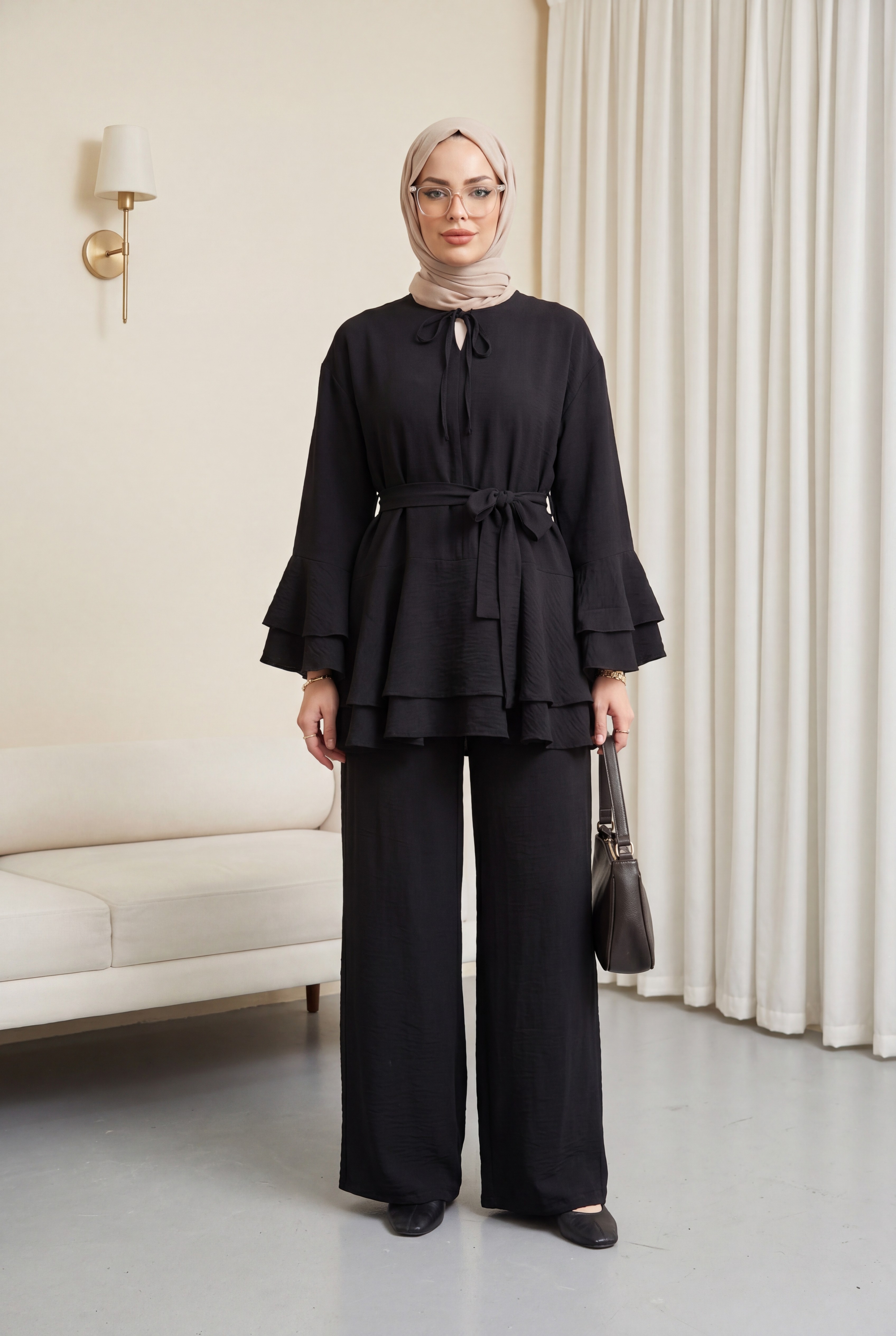 Jacquard Waffle Suit with Ruffled Cuffs and Wide Leg Trousers, and Belt. -Black