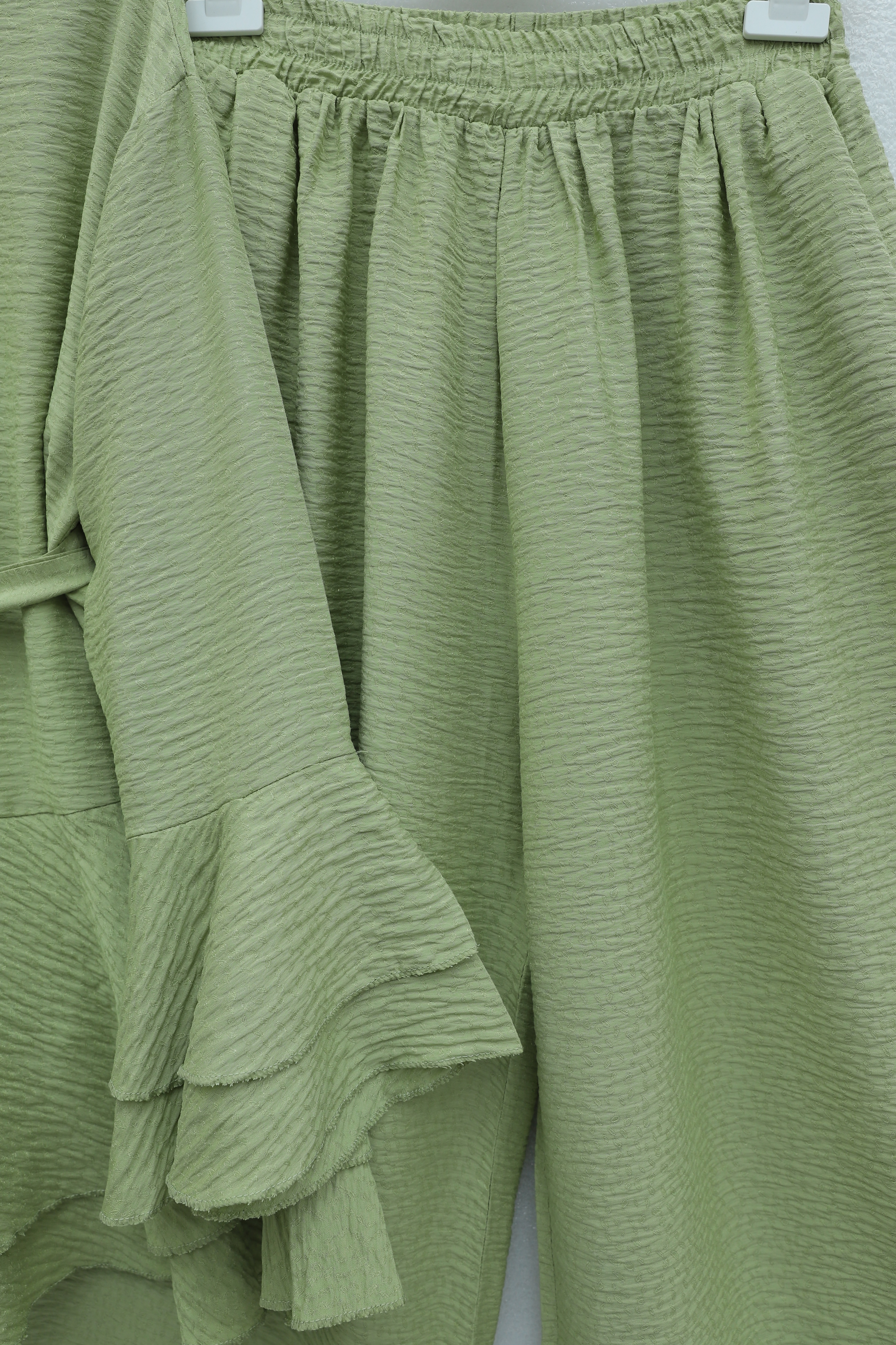 Jacquard Waffle Suit with Ruffled Cuffs and Wide Leg Trousers, and Belt. -PISTACHIO GREEN