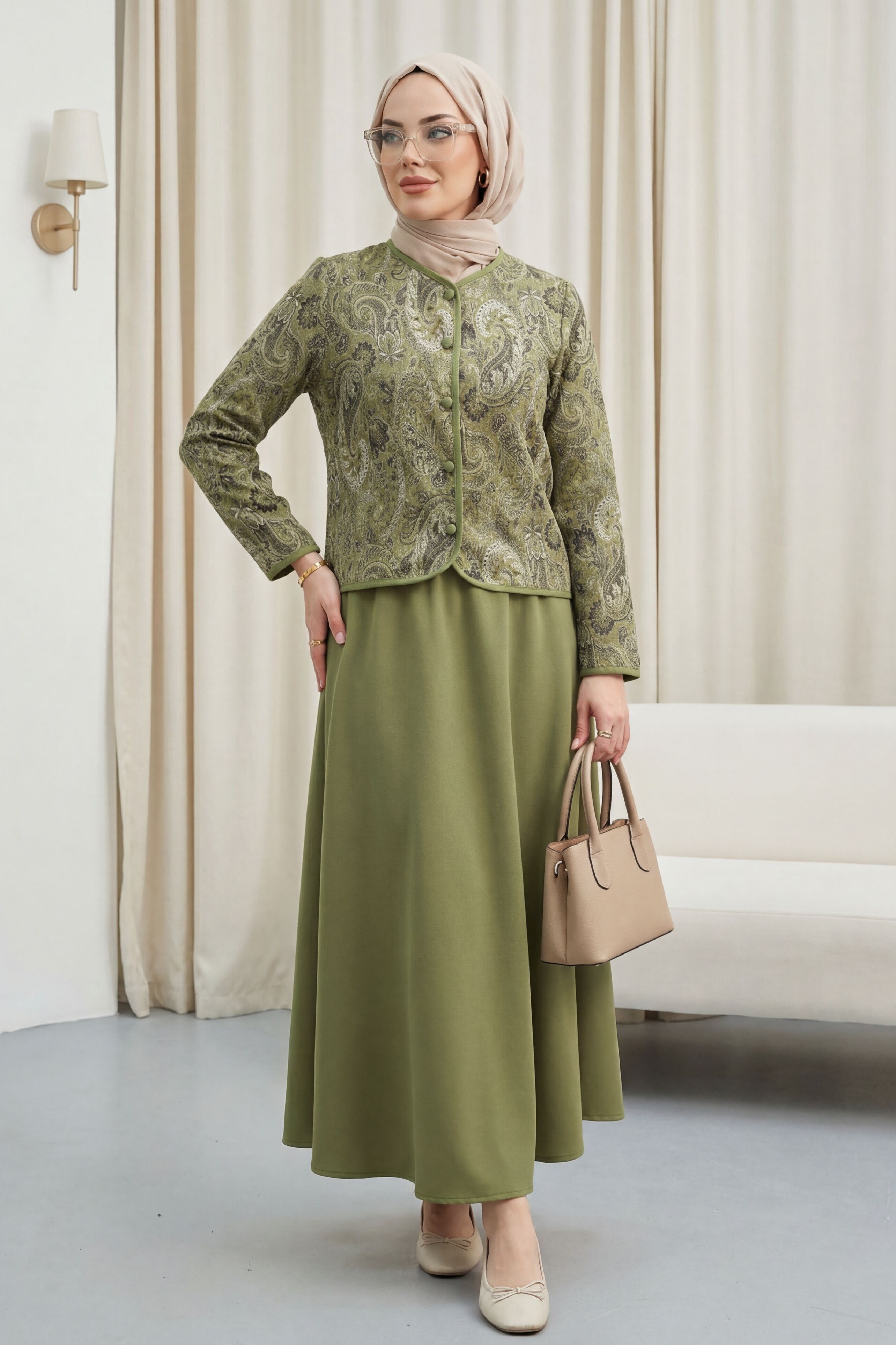 Imported Crepe Set with Dart Detail and Cross-Face Trousers -Cagla Green