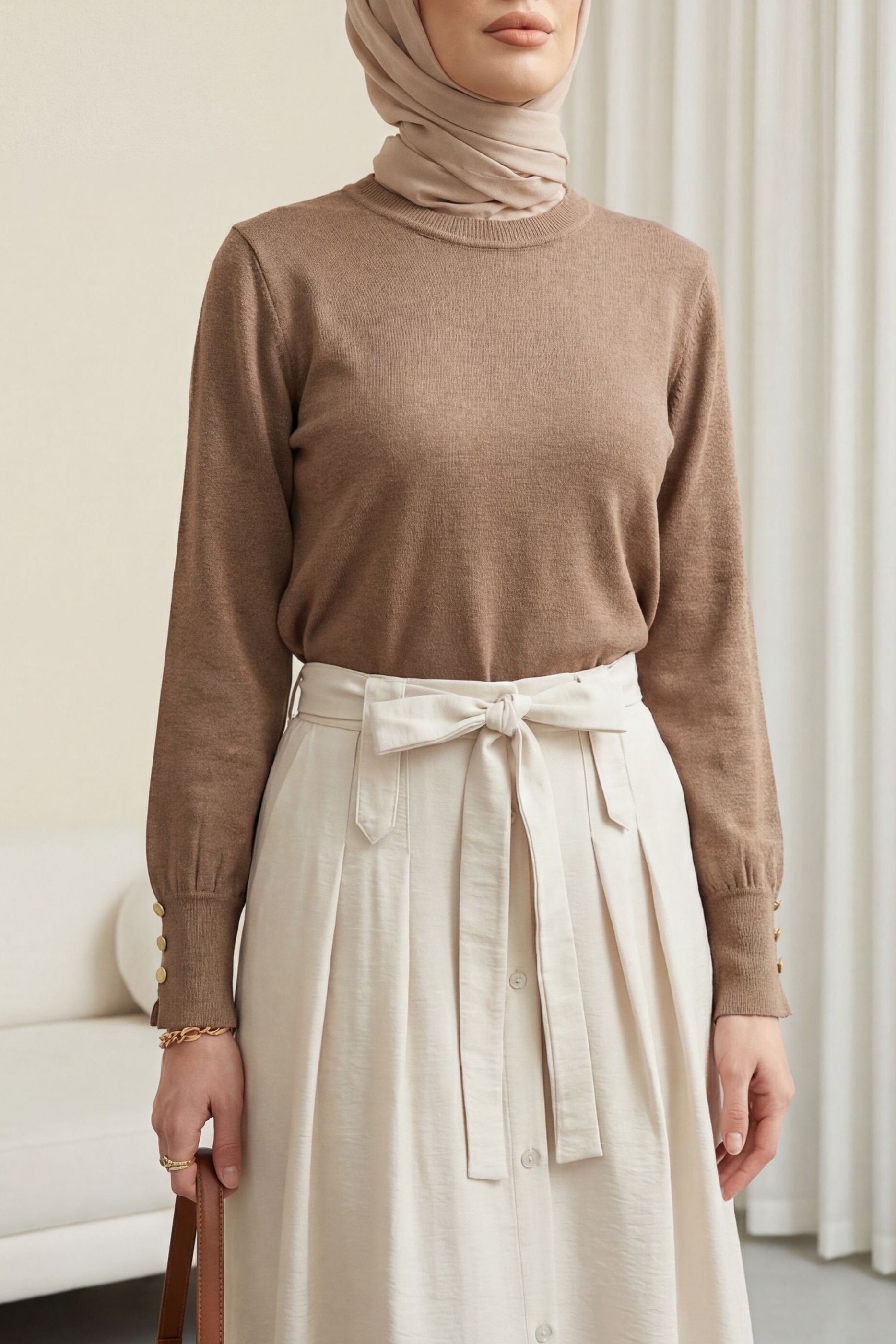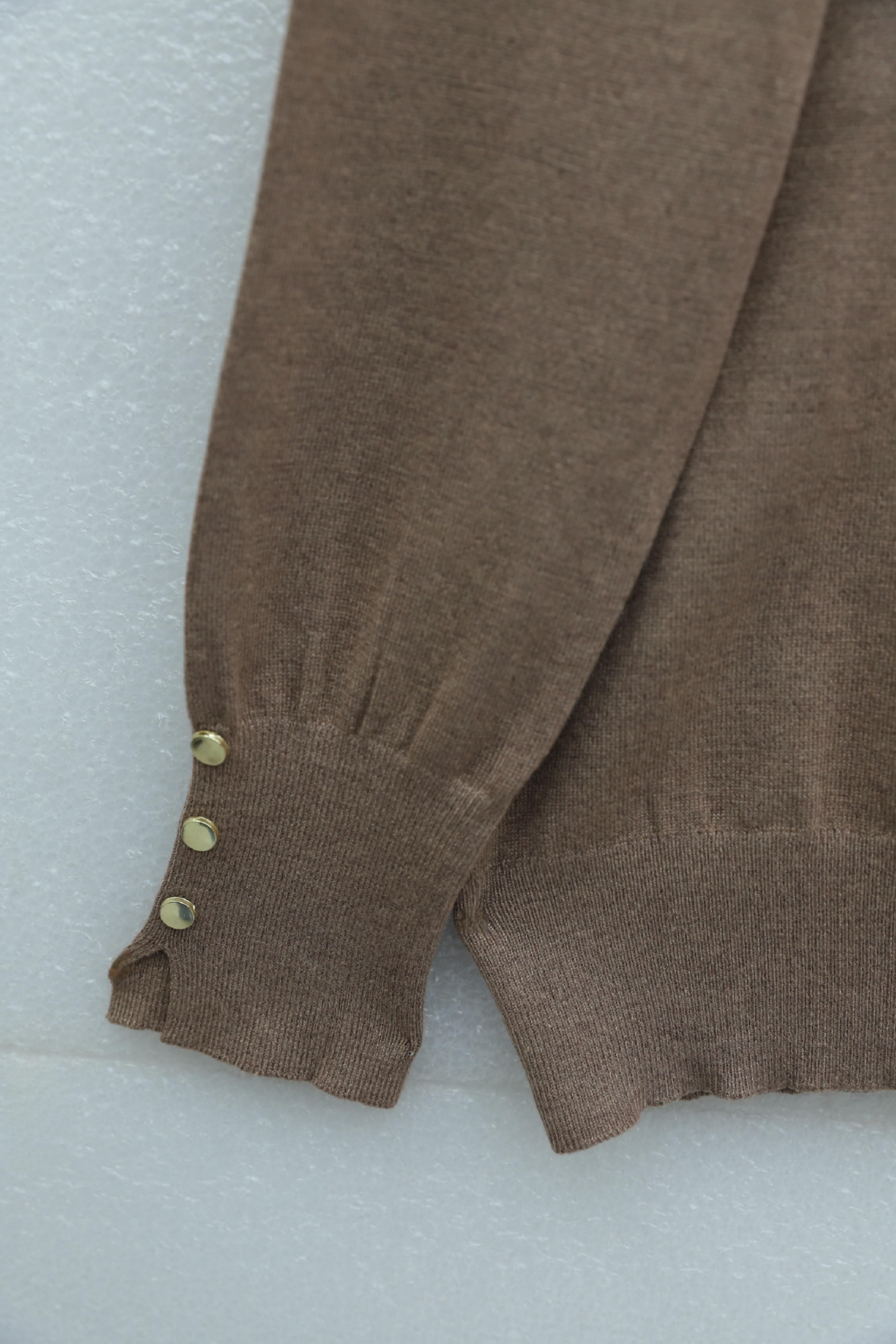 Podyumplus Round Neck Knitted Tunic with Button Detail on Sleeves -Mink color