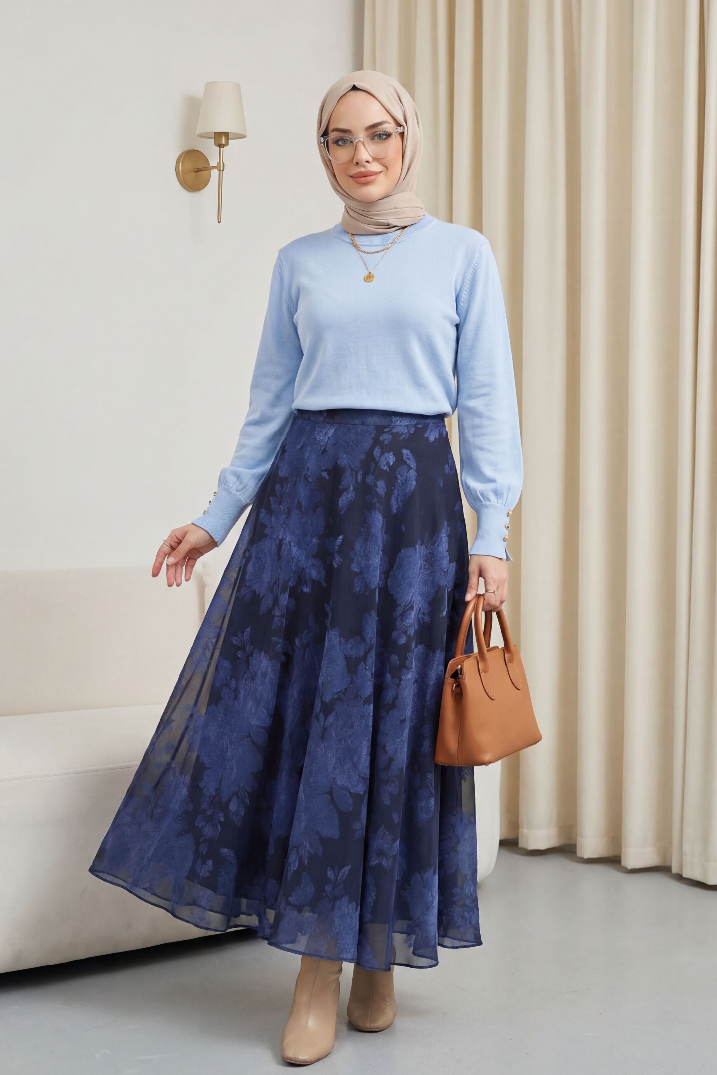 Podyumplus Round Neck Knitted Tunic with Button Detail on Sleeves -Baby Blue