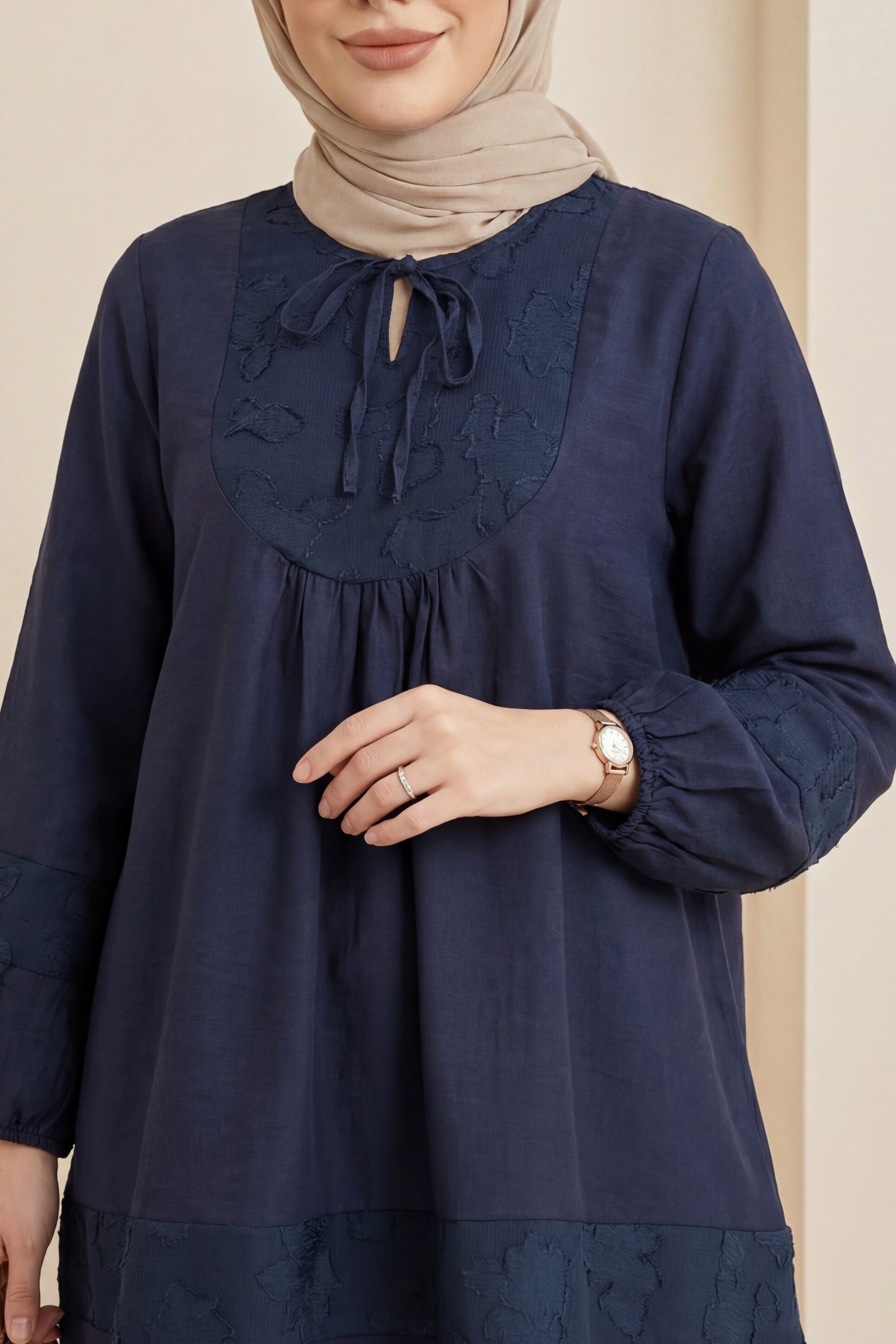 Modal Tunic with Tie Neckline and Elasticated Sleeves -Navy blue