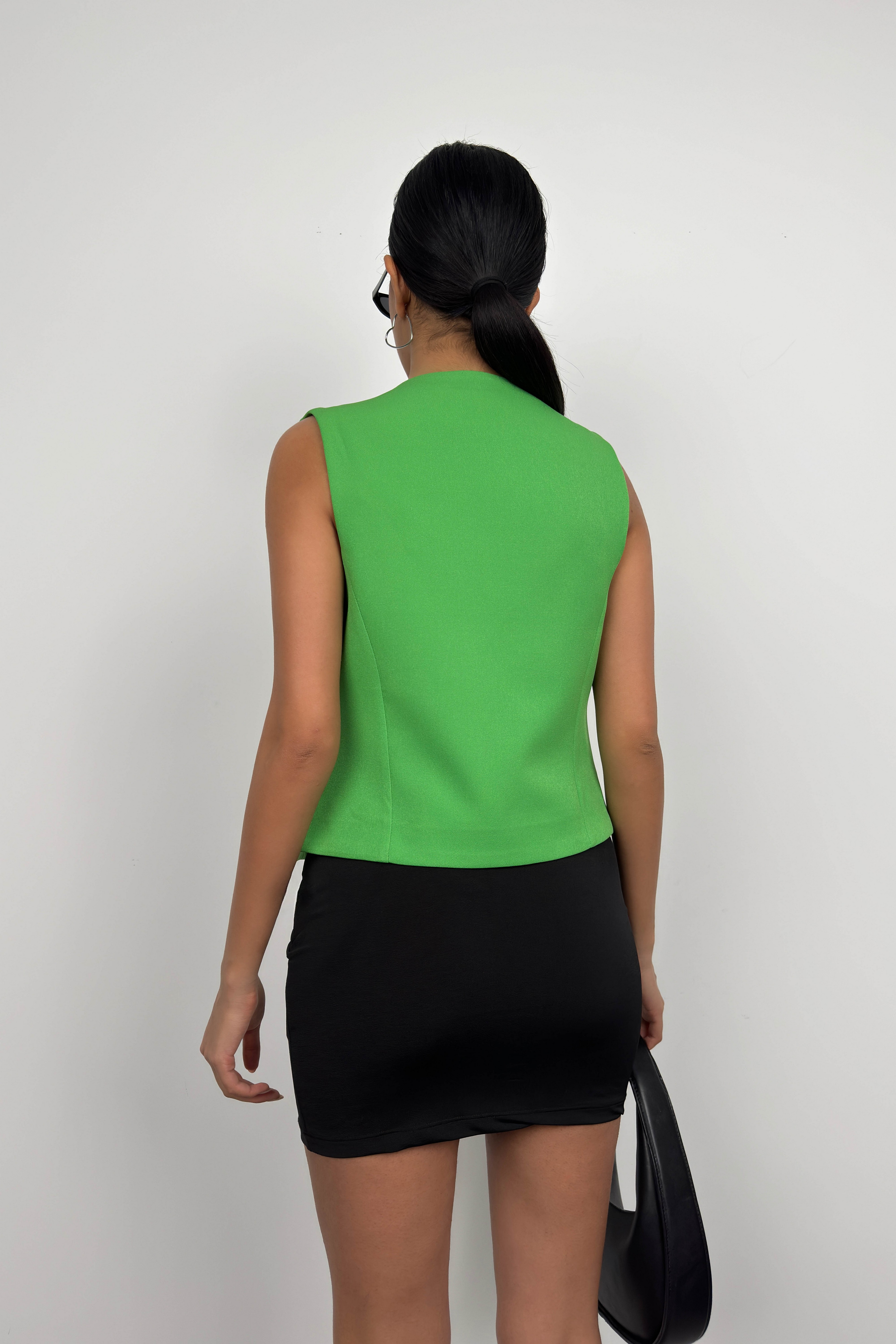 Button Detail, Darted, Classic Vest Sleeveless, Matching Color Fabric, Fake Front Pocket, Deep V Cut, Halter Neck, Buttoned Front