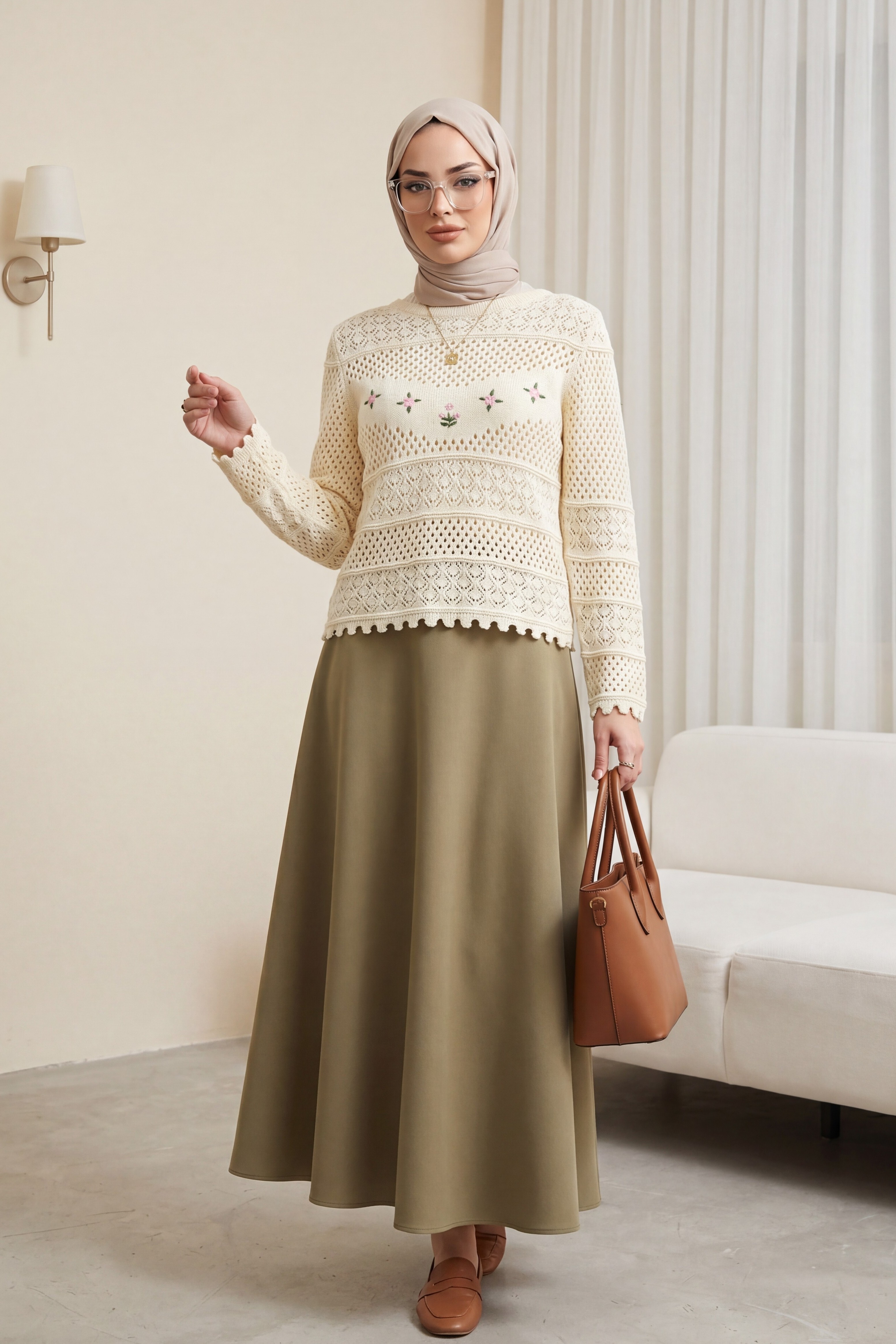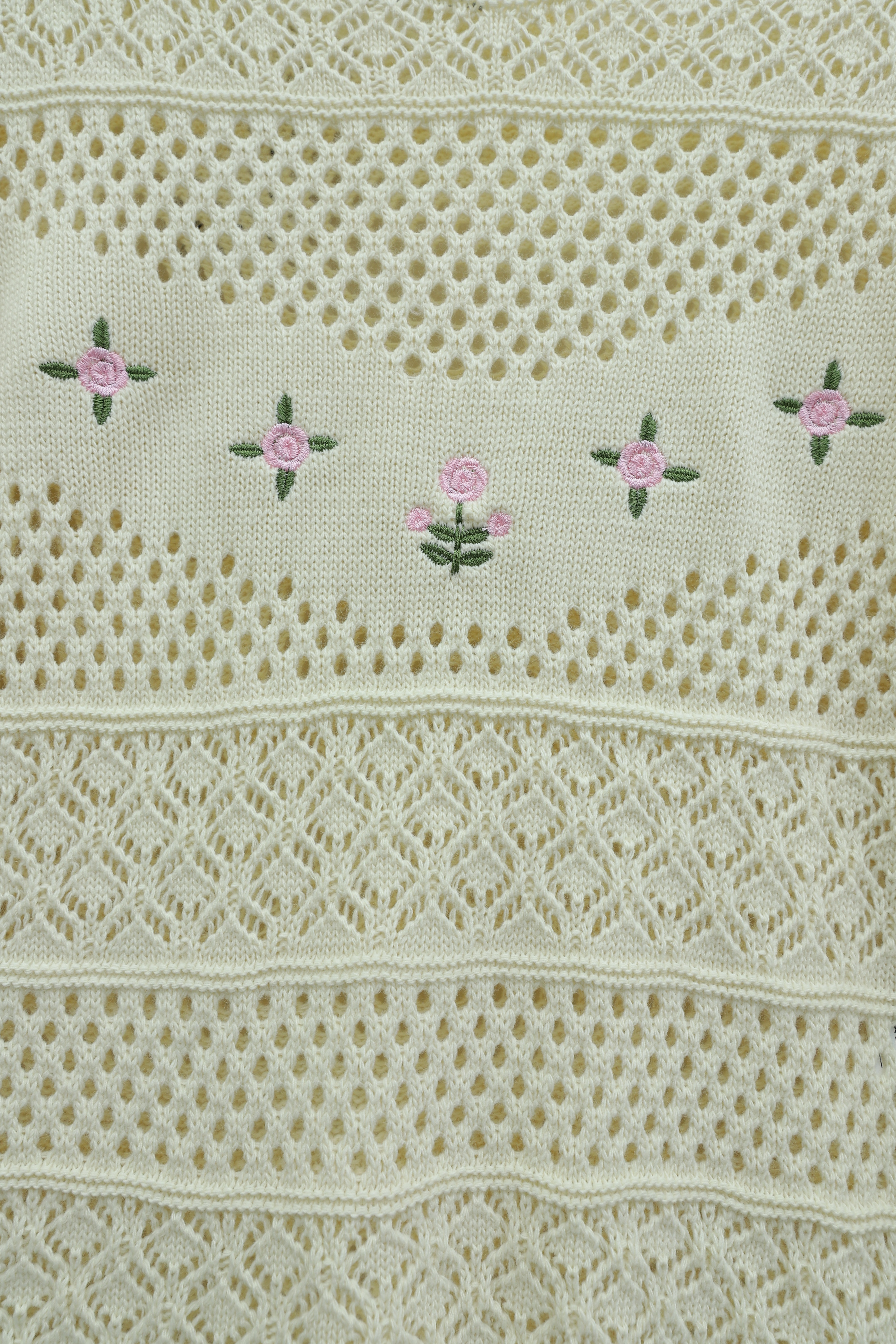 Knitted Sweater with Floral Embroidery and Openwork Pattern -Cream color