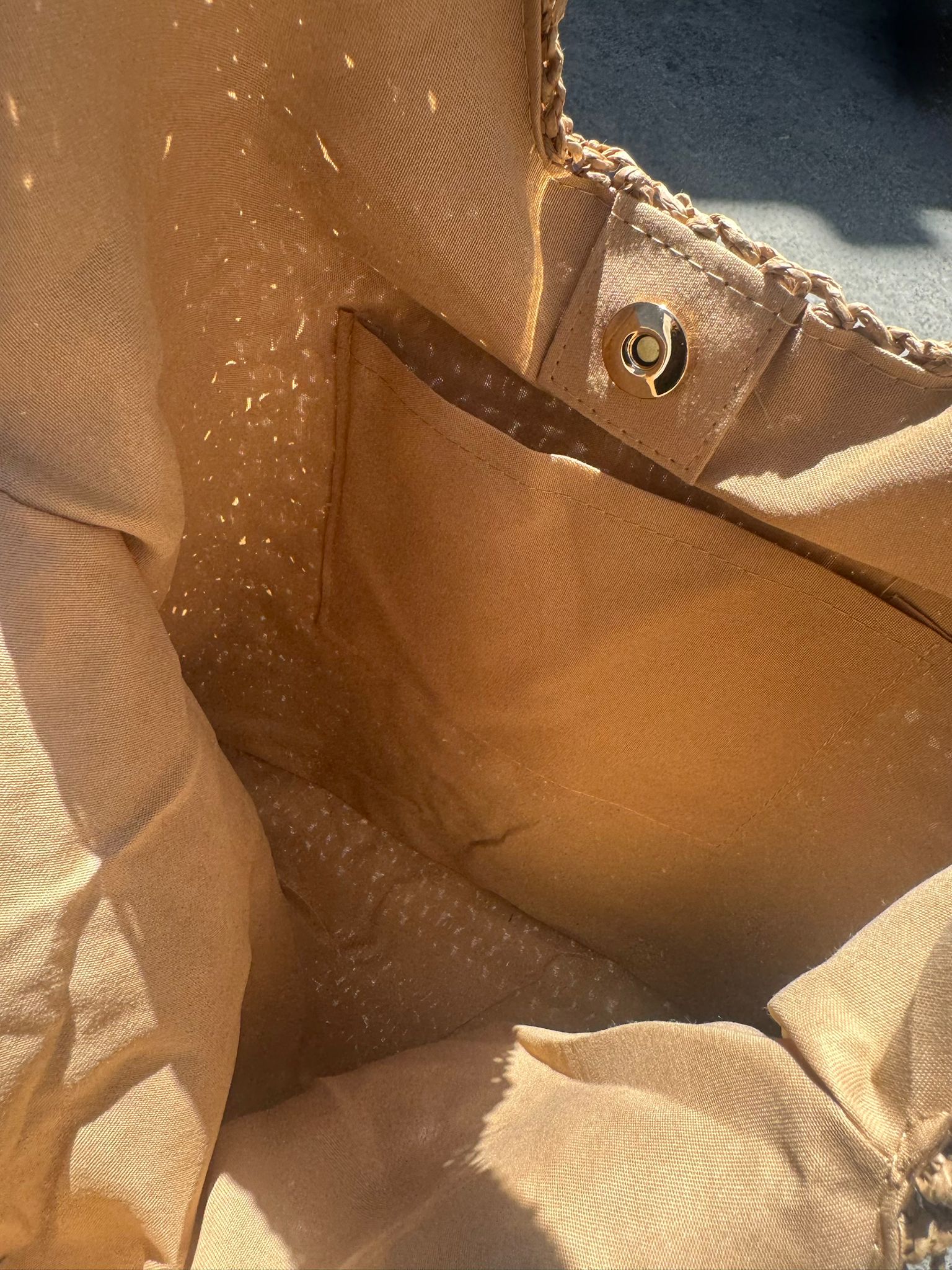 Hasır Çanta, yaz aylarının vazgeçilmezi olan plaj tekstil koleksiyonunun şık bir parçasıdır.; - Yumuşak dokusuyla dikkat çeken bu çanta, hem rahatlık hem de stil sunar.; üm yaş gruplarına hitap eden tasarımı ile herkesin beğenisine sunulur.; - Yalnızca silerek temizlenebilen yapısıyla pratik bakım imkanı sağlar; böylece çantanız her zaman yeni gibi kalır.; - Organik materyallerden üretilmiş olması sürdürülebilir moda anlayışına katkıda bulunurken çevre dostu bir tercih olmanızı sağlar.; - Deri detaylarının bulunmaması, vegan yaşam tarzını benimseyenler için mükemmel bir seçenektir.; - Plaj ortamları için özel olarak tasarlanmış olup, yaz gardırobunuzun vazgeçilmez parçasına dönüşecek.; - Yalnızca silerek temizlenebilen yapısı sayesinde pratik bakım imkanı sunar; böylece çantanız her zaman yeni gibi kalır.