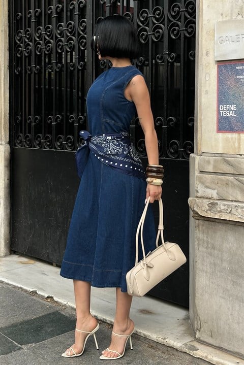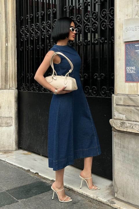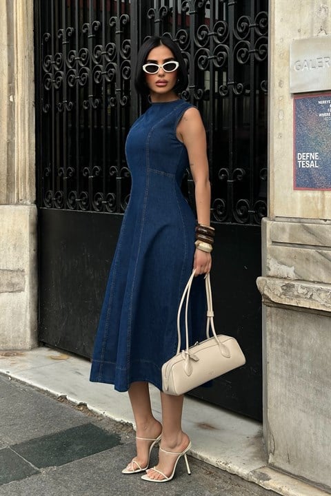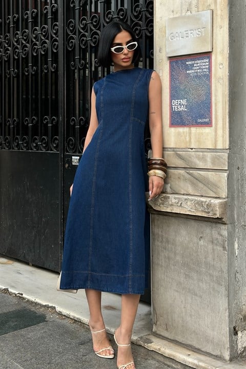 Dikiş Detaylı Sırtı Fermuarlı Denim Elbise 2041