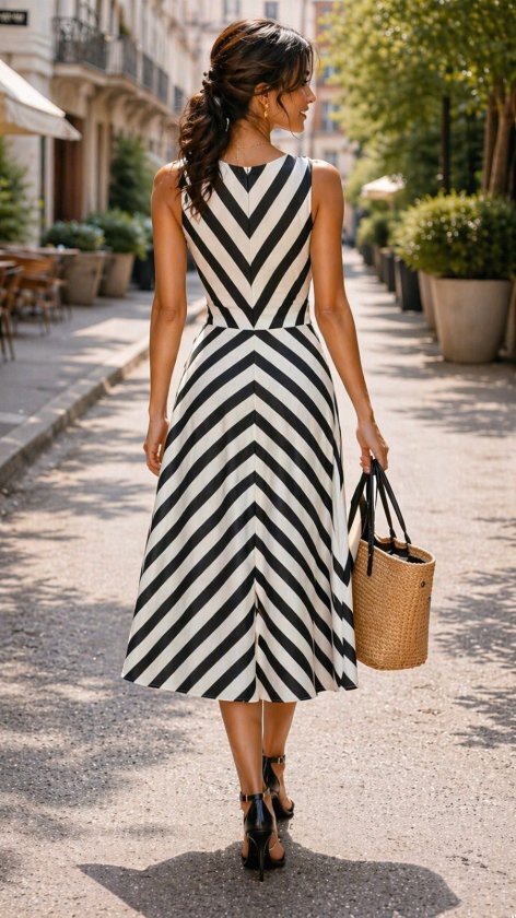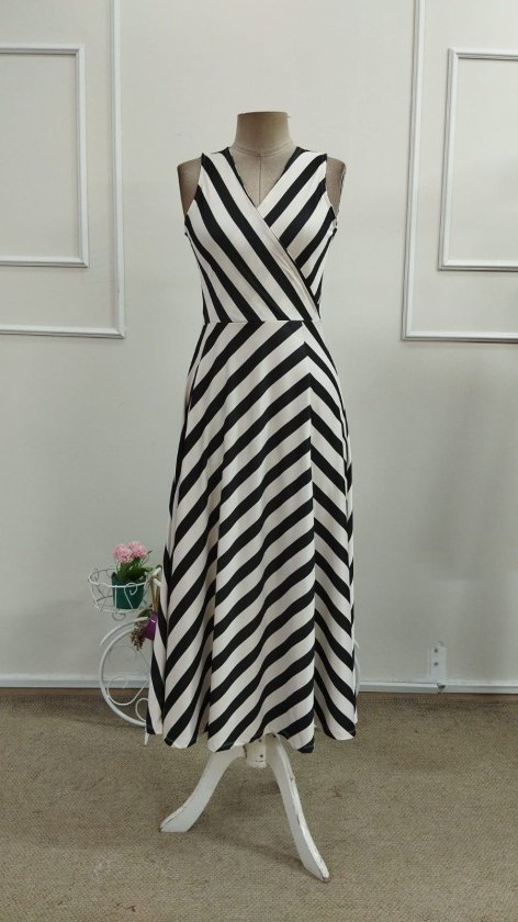 Kadın Askılı Kruvaze Yakalı Kemersiz çizgili Dalgıç Midi Elbise, 33856