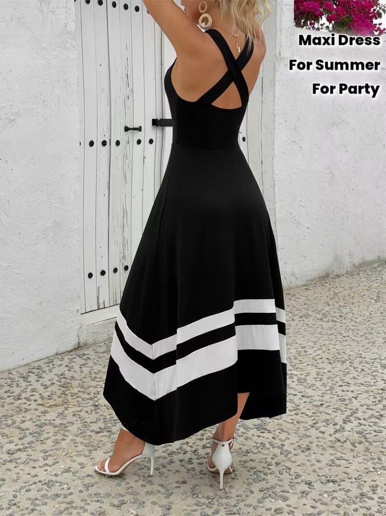 Kadın Askılı Yuvarlak Yaka Asimetrik şerit Detaylı Uzun Viskon Elbise