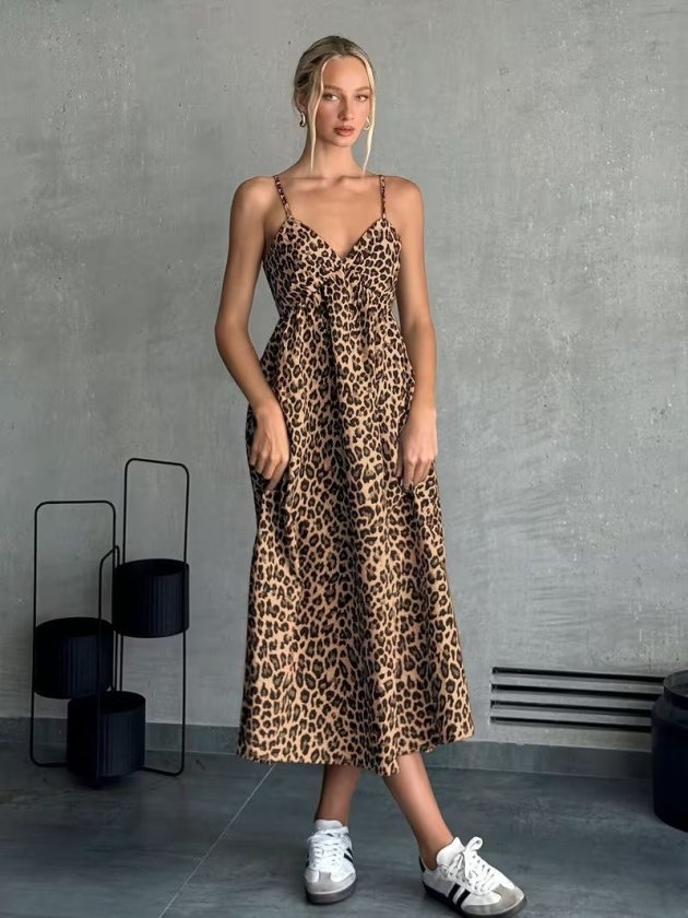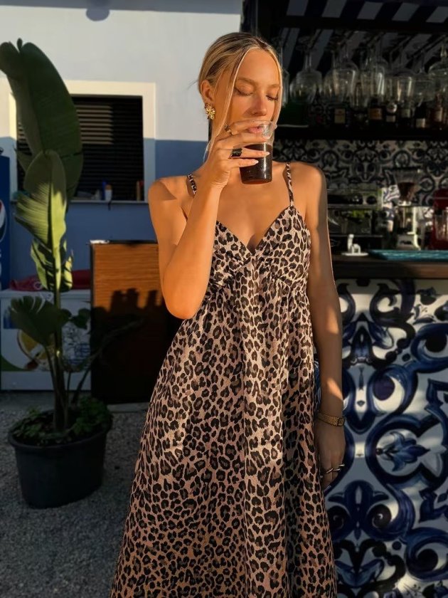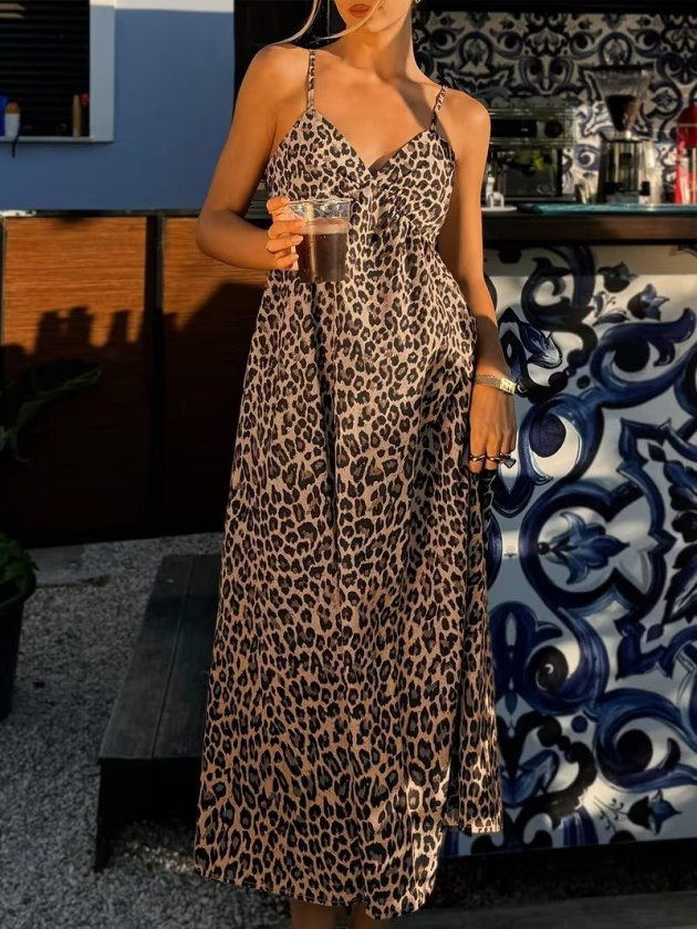 Kadın Ip Askılı V Yakalı Uzun Desenli Süprem Elbise