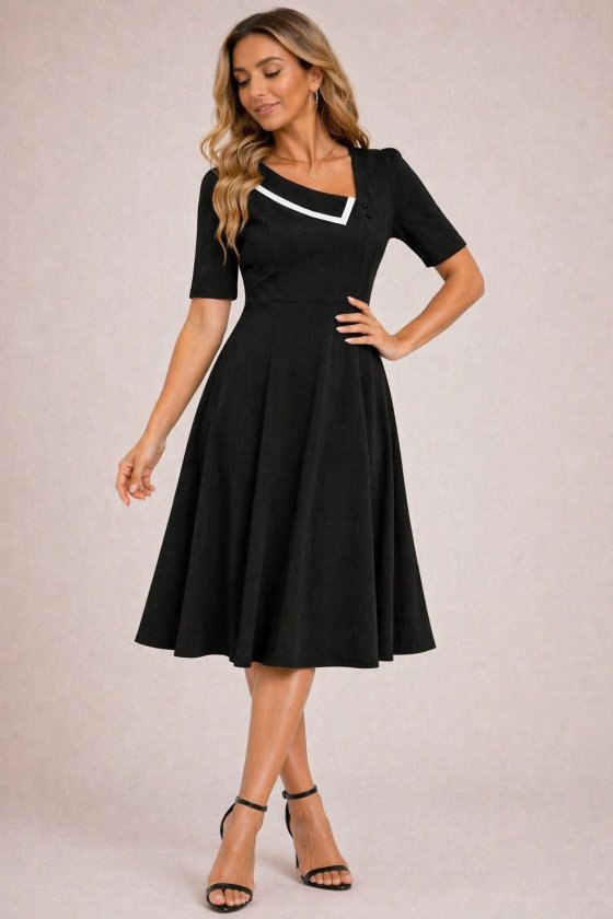 Kadın Kısa Kollu Asimetrik Yaka Detaylı Midi Janjan Krep Elbise, 33839