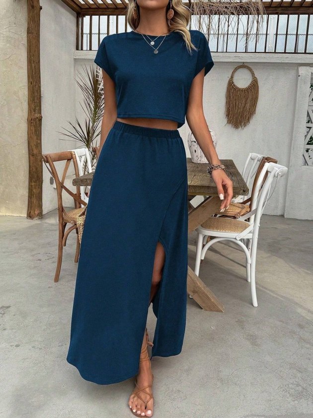 Kadın Kısa Kollu Bisiklet Yaka Viskon Krop Bluz Ve Uzun Etek Ikili Takım, 33654