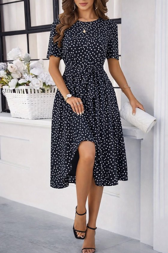Kadın Kısa Kollu Bisiklet Yakalı Puantiyeli Kısa Süprem Elbise, 33525