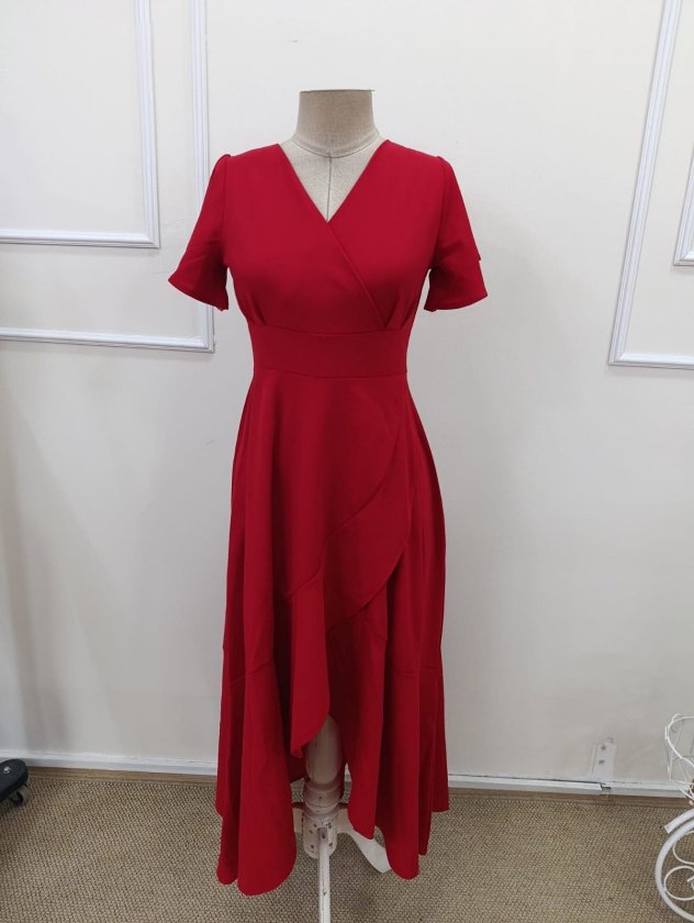 Kadın Kısa Kollu Kruvaze Yakalı ön Asimetrik Volanlı Uzun Ithal Krep Elbise , 32538
