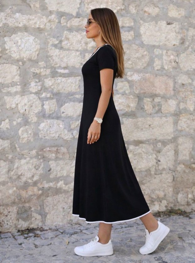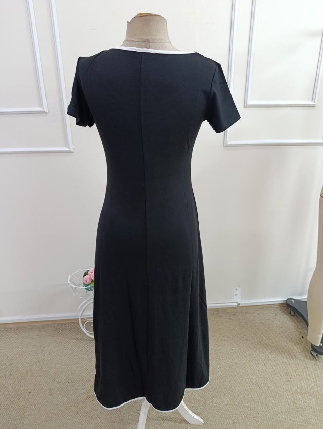Kadın Kısa Kollu Yuvarlak Yakalı Yakası Renkli Kiloş Midi Viskon Elbise