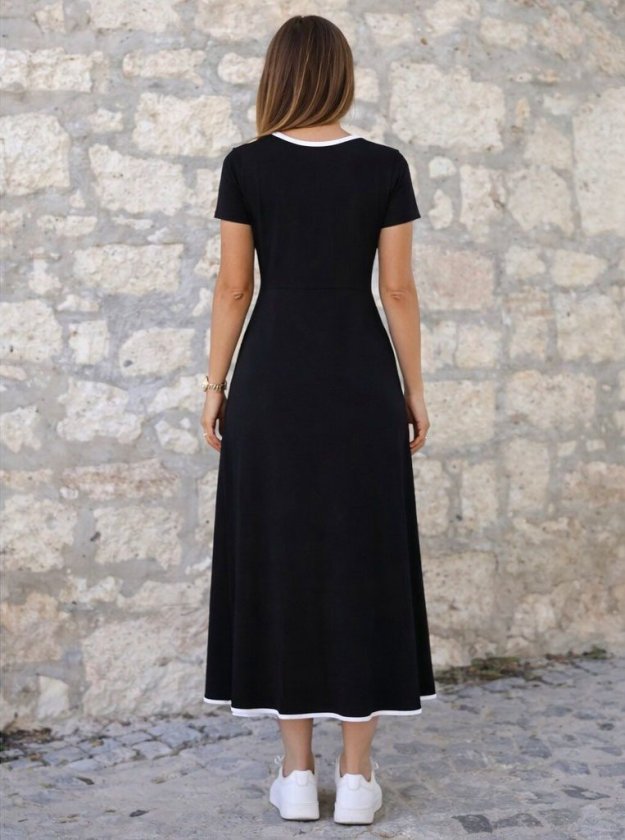 Kadın Kısa Kollu Yuvarlak Yakalı Yakası Renkli Kiloş Midi Viskon Elbise, 33851